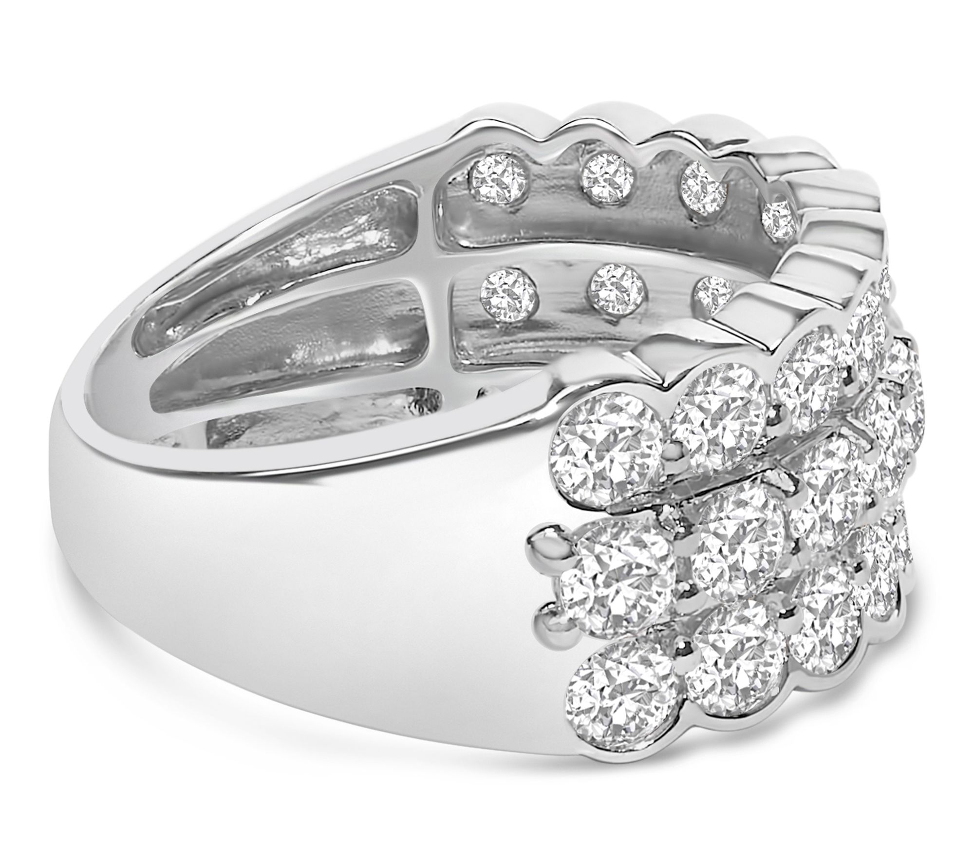 Round-cut, prong-set lab-grown diamonds in a three-row pave-style band design; polished shank