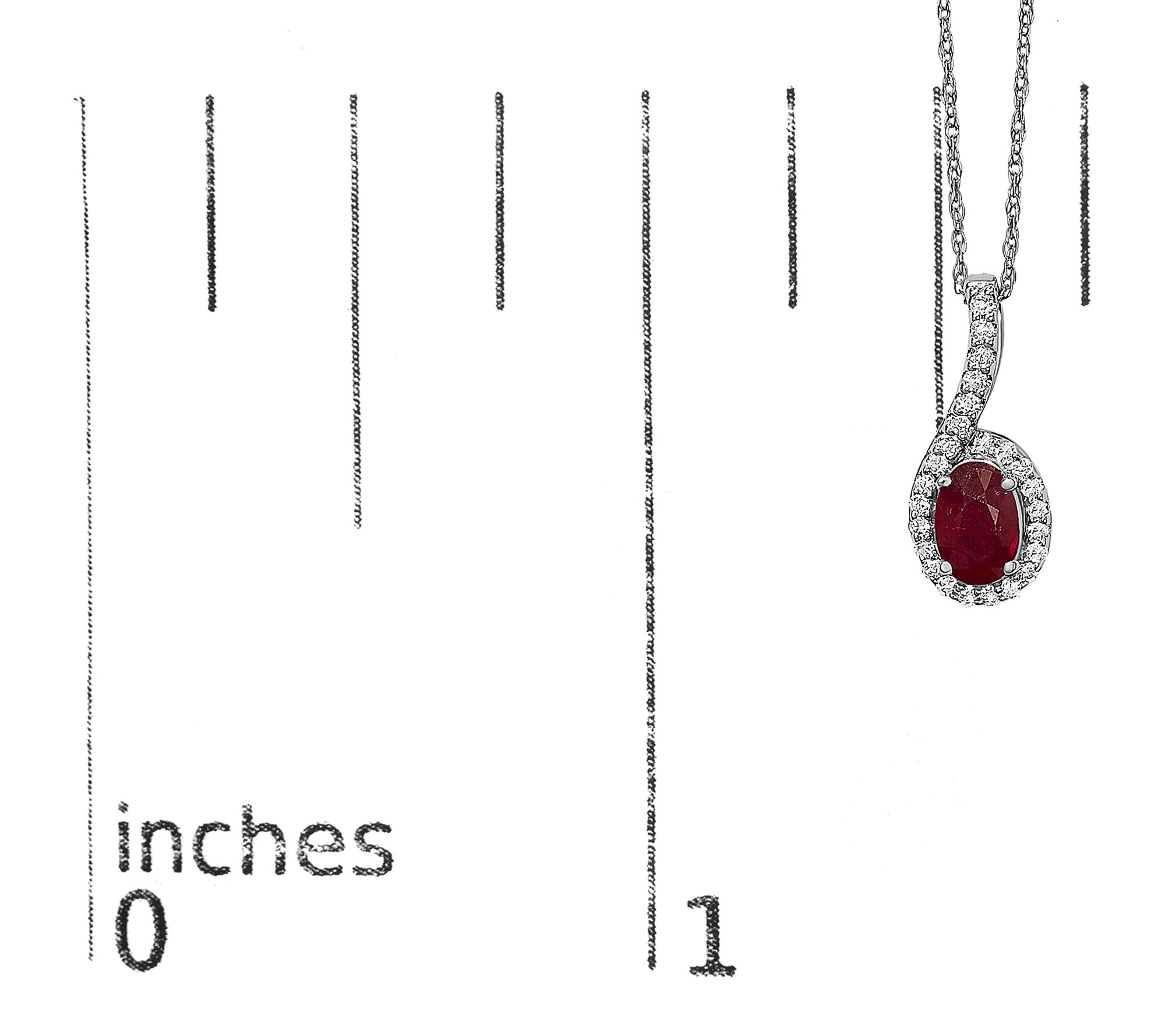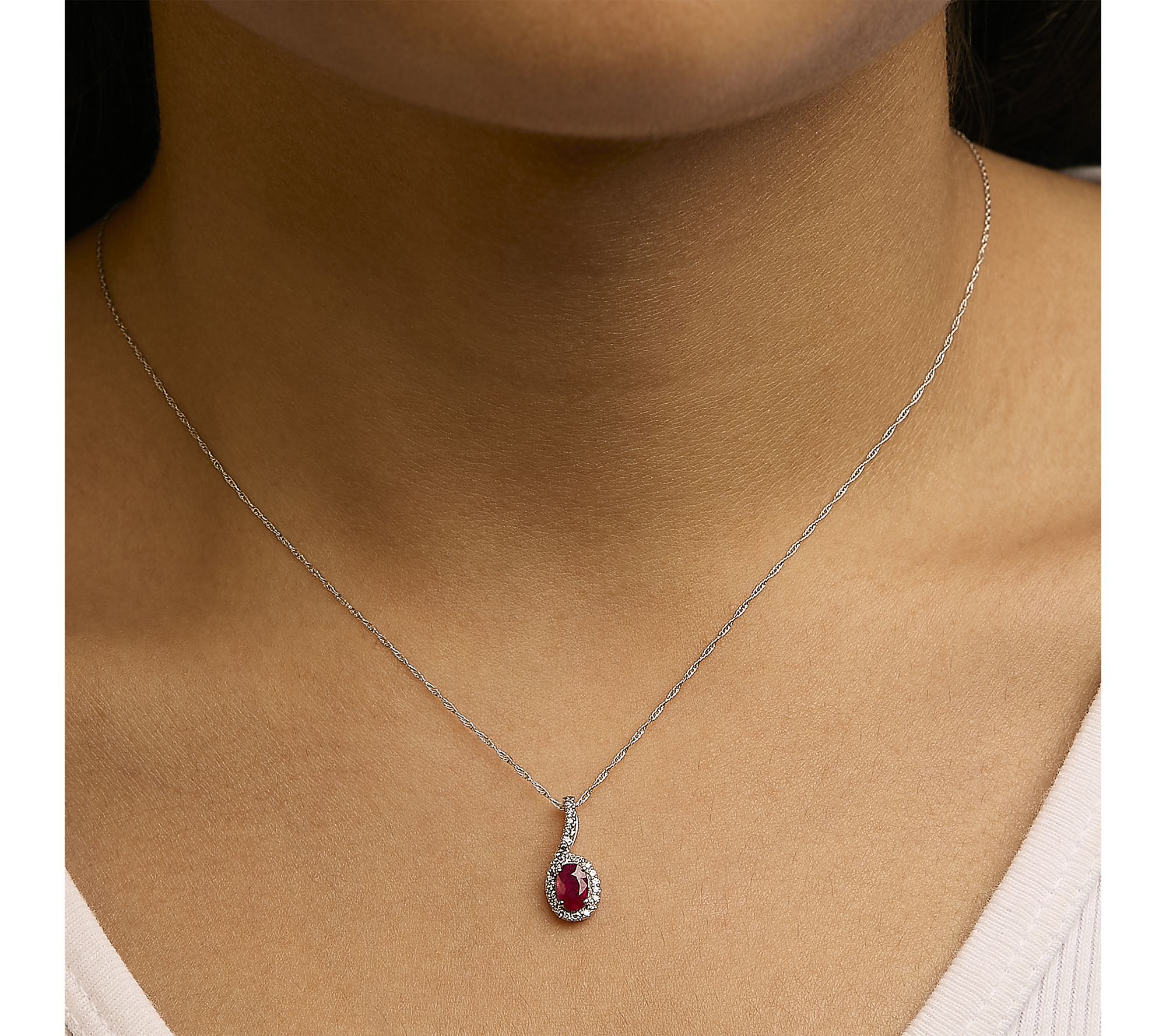 • Teardrop design; oval, prong-set ruby gemstone; round, prong-set diamond accents