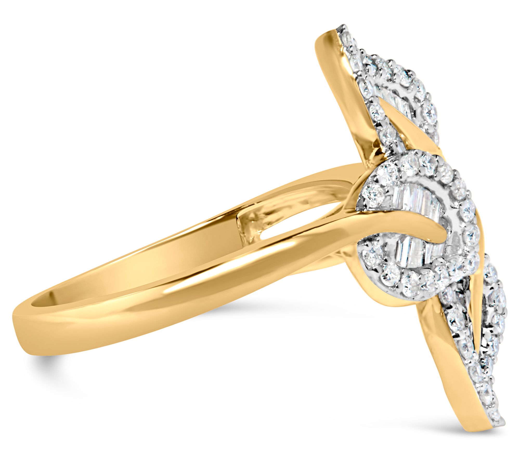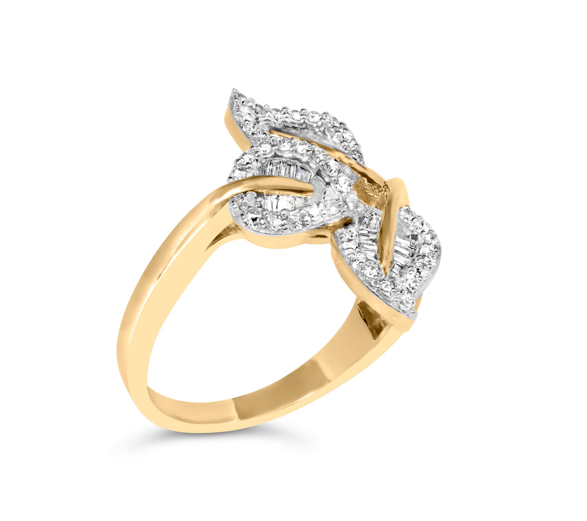 Three leaf ring design; round-cut and baguette-cut diamonds with pave and channel settings; highly polished shank