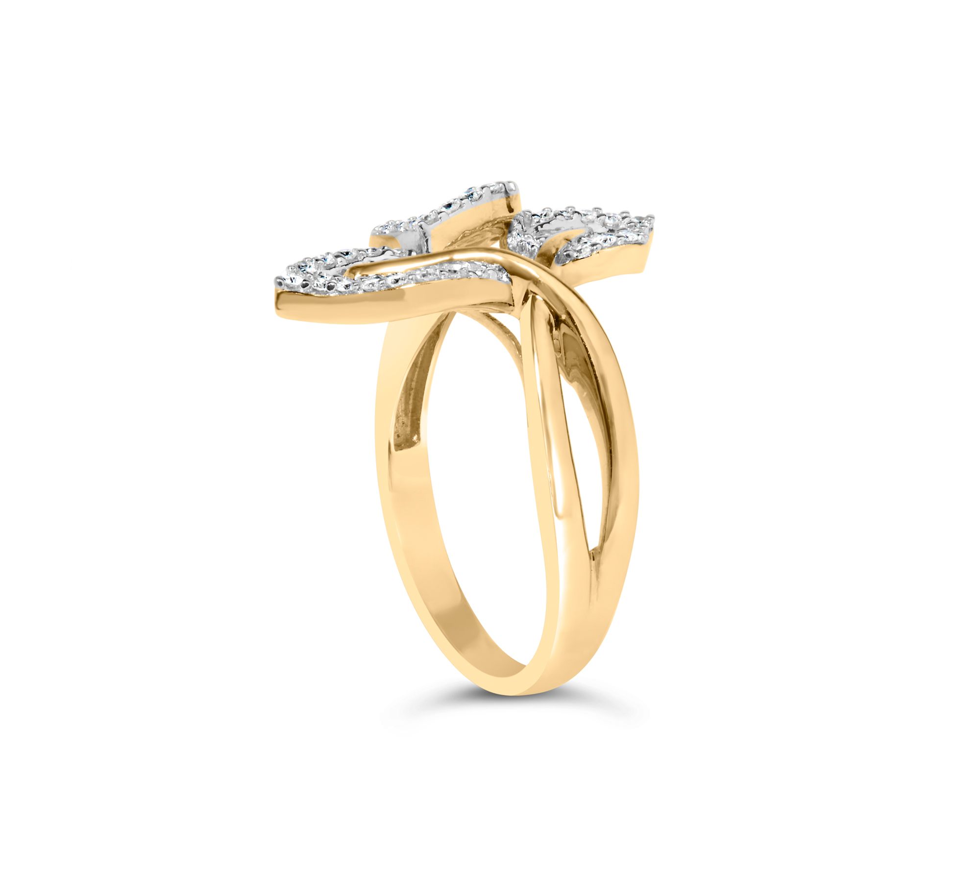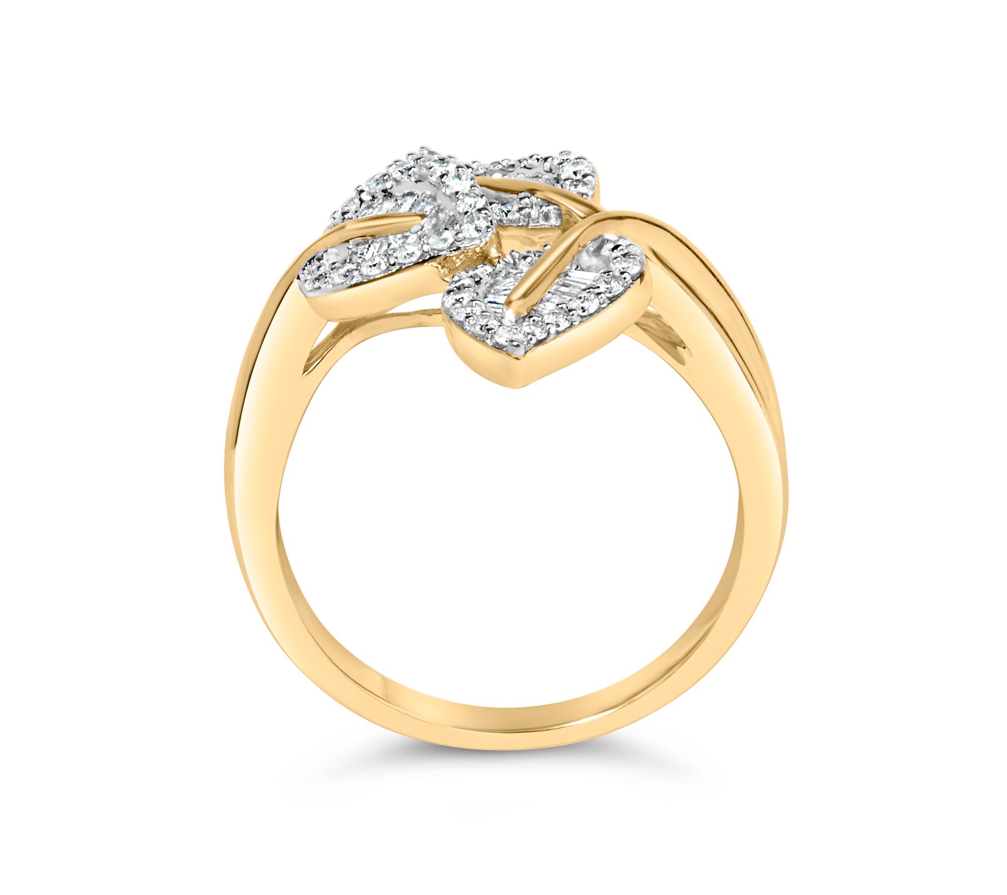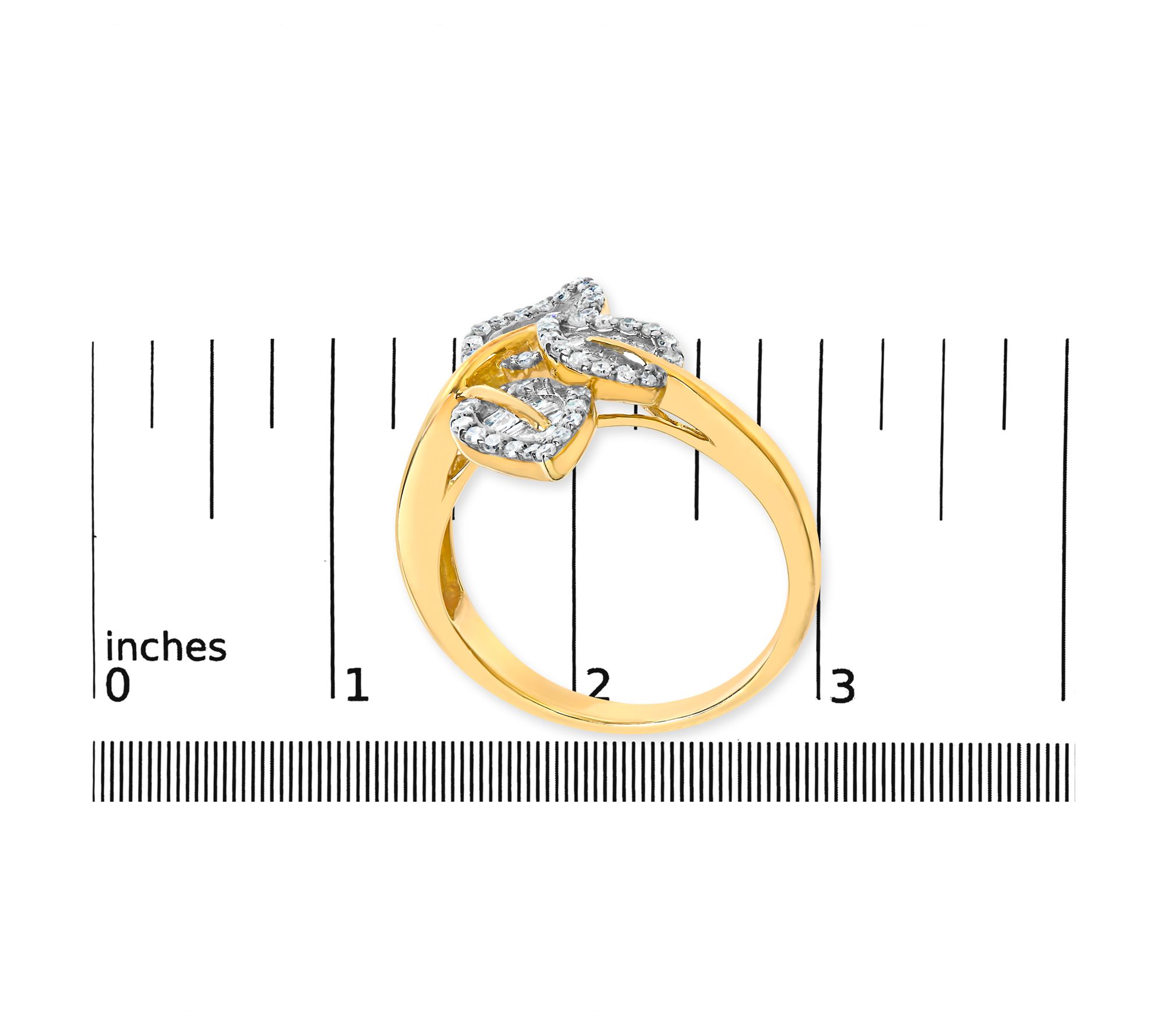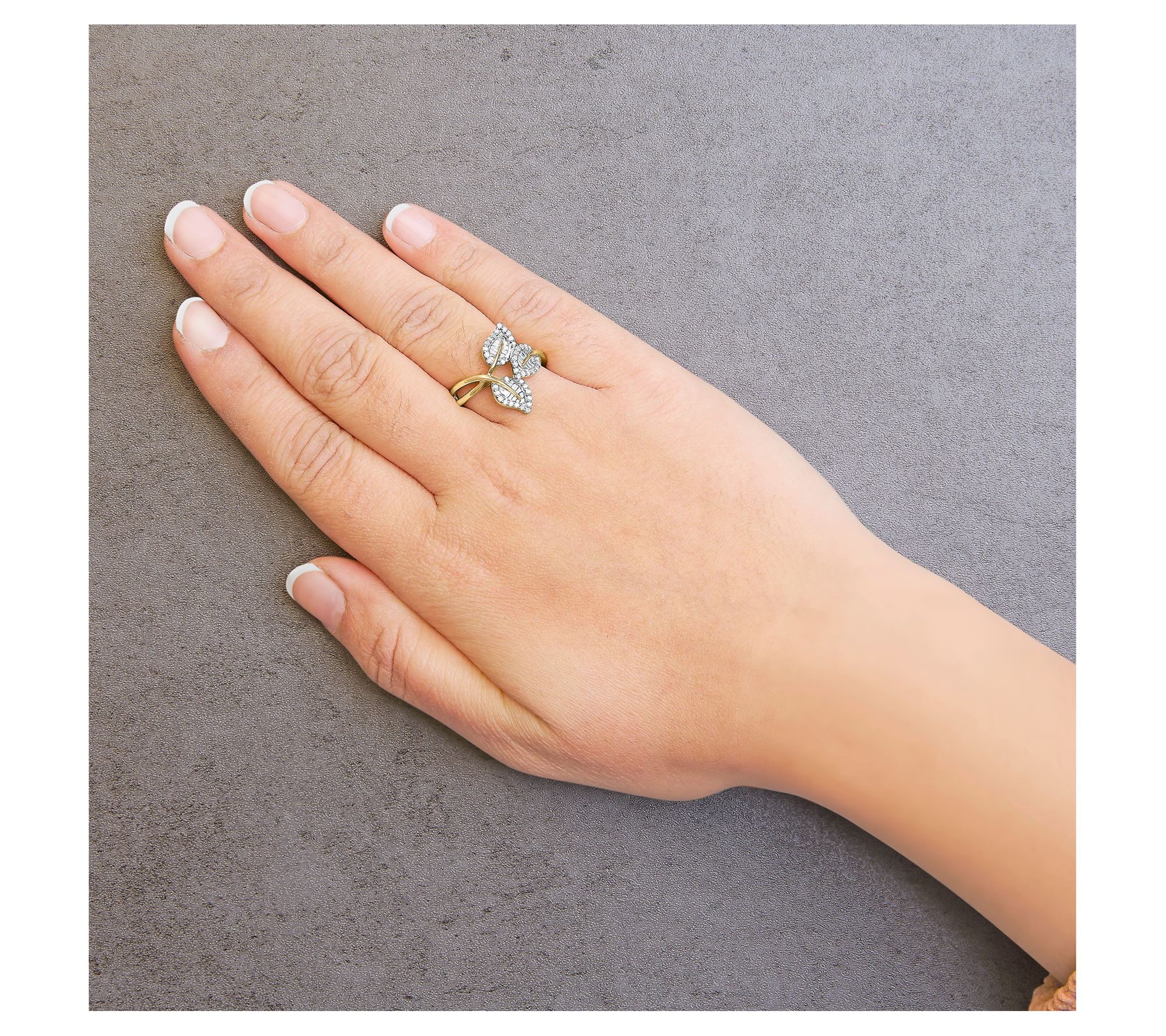 Discover the enchanting allure of the two-tone diamond bypass leaf ring, where elegance meets modern craftsmanship. This sterling silver masterpiece, adorned with 18K gold plating and rhodium, showcases a trio of leaf designs, each glistening with round-cut and baguette-cut diamonds. A perfect blend of nature-inspired beauty and luxurious sparkle, it's a statement piece that's bound to captivate. From Haus of Brilliance.