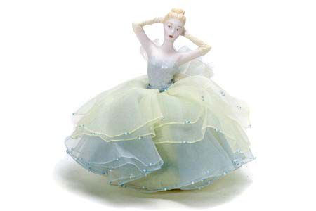 Being beautiful and being useful don't have to be opposite terms. "Haute Half-Doll" is inspired by the pin cushion dolls that were popular in Europe. Like those dolls, it can function as both a collectible and a sewing accessory. The doll is porcelain above the waist with blonde hair pulled into a bun and blue eyes. Her gloved arms are bent behind her head and her torso bears a light blue top. The pin cushion is made of sheer yellow and blue chiffon and the skirt is layered of the same fabric with bead accents. Measures approximately 8" tall. Manufacturer's Certificate of Authenticity. Individually hand numbered. Made in China.