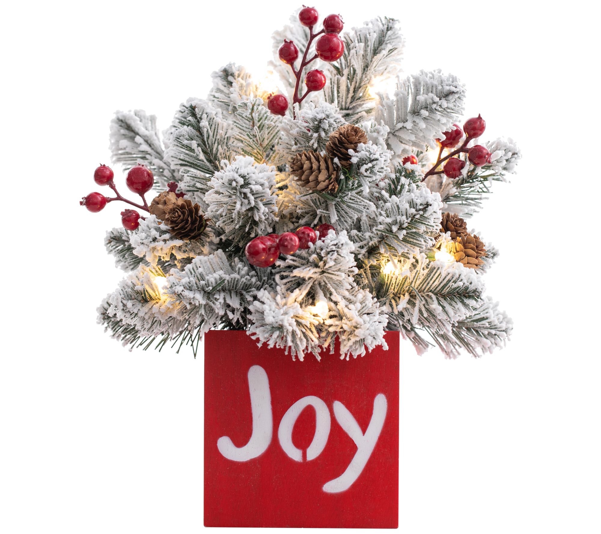 Fill your home with holiday spirit with this Joy frosted greenery tabletop decoration. Combining flocked greenery, faux red berries, real pinecones, and a festive sentiment, this piece is illuminated by 10 warm white LED lights. From Haute Decor.