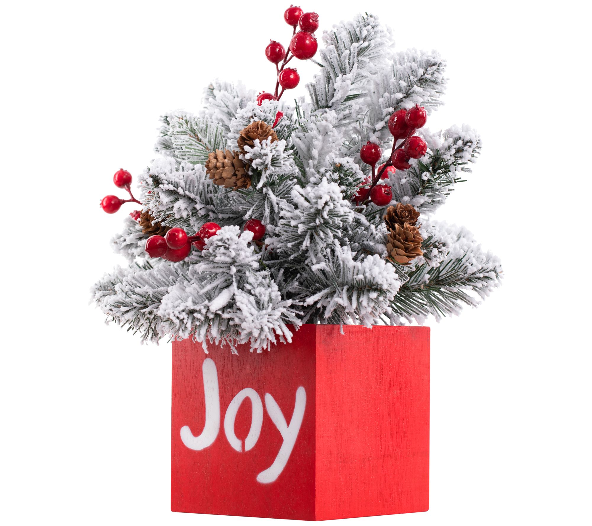• Flocked greenery, faux red berries, real pinecones wood container