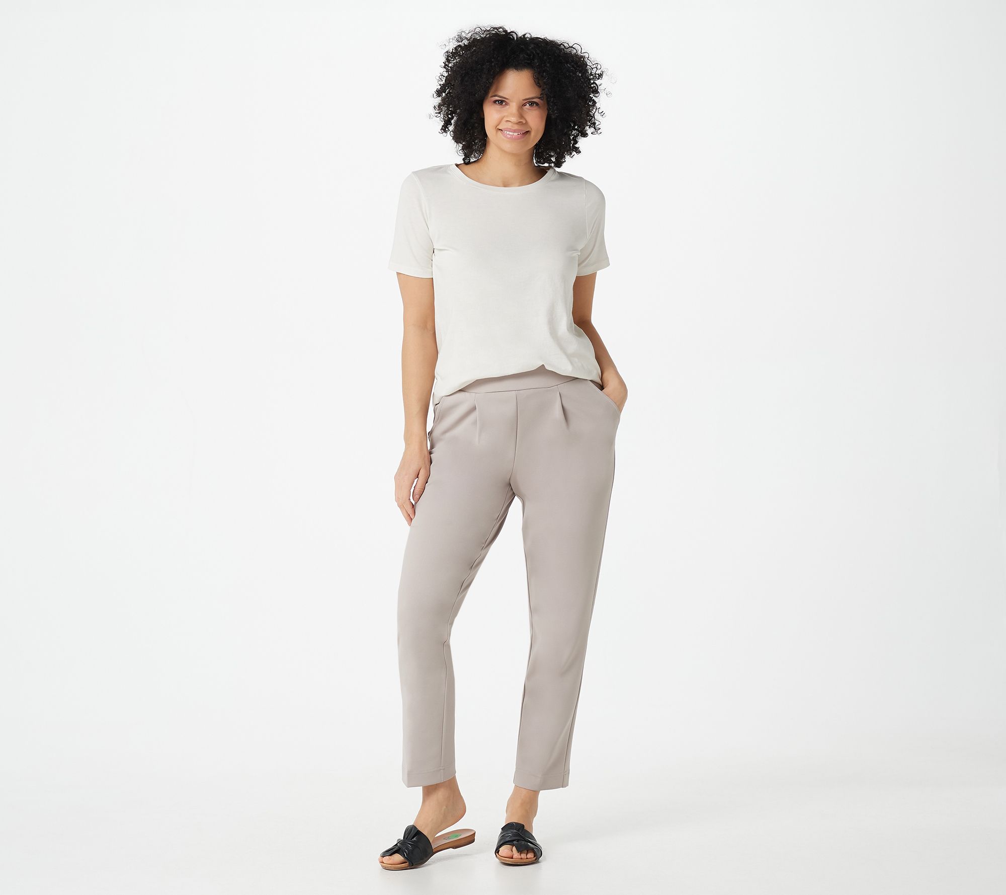 Features: pull-on style, flat elastic waistband, front pleat, front slash pockets, faux back welt pockets, ankle-length