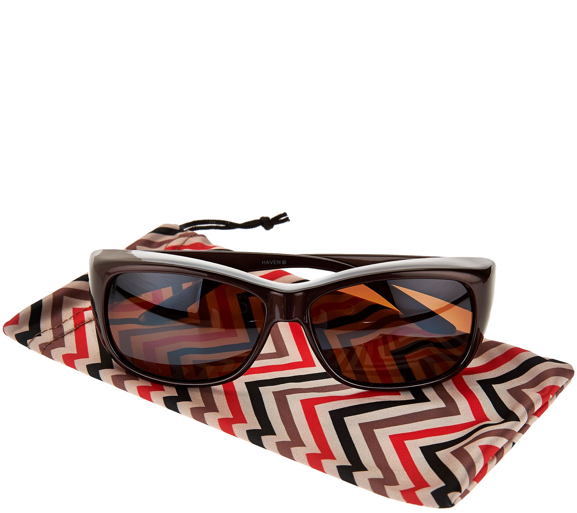 Over-the-top style. These chic, chevron-patterned sunglasses are designed to fit over your eyeglasses or readers, providing 100%UVA and UVB protection--with polarized lenses to block glare. From Haven by Foster Grant.