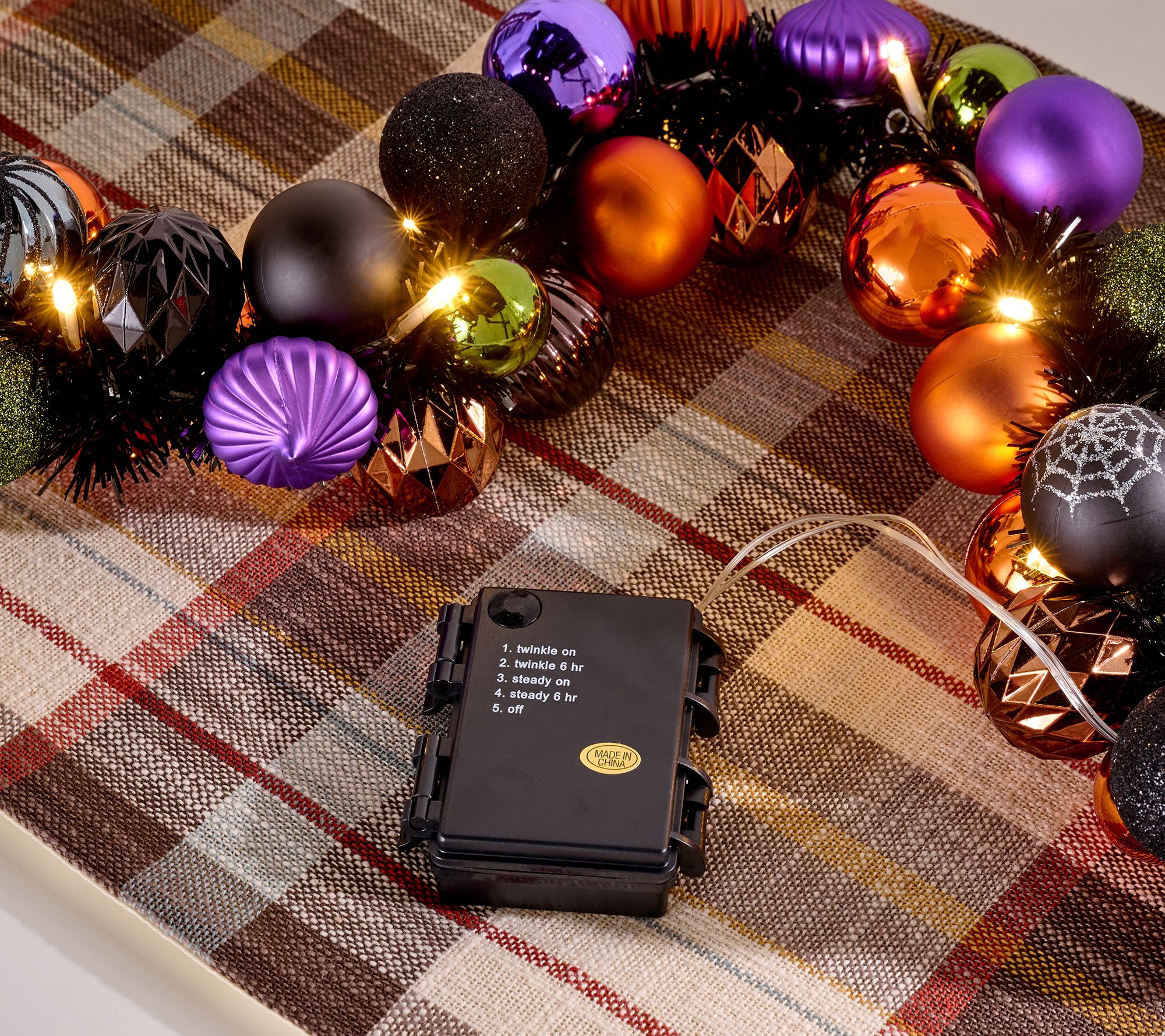 Pumkin spice days or spooky nights? It's your choice with this 6' prelit ornament garland, adding a festive glow to your banister, mantel, porch, or dining table for Halloween or harvest time. A selection of LED light modes -- including twinkle and steady-on options -- lets you set the mood for any fall gathering. From Hay & Harvest.