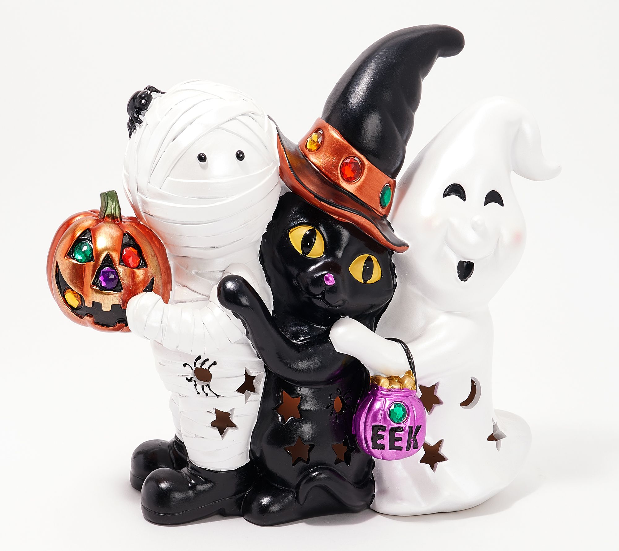 • Includes one figurine with mummy, cat, and ghost characters and one LED candle