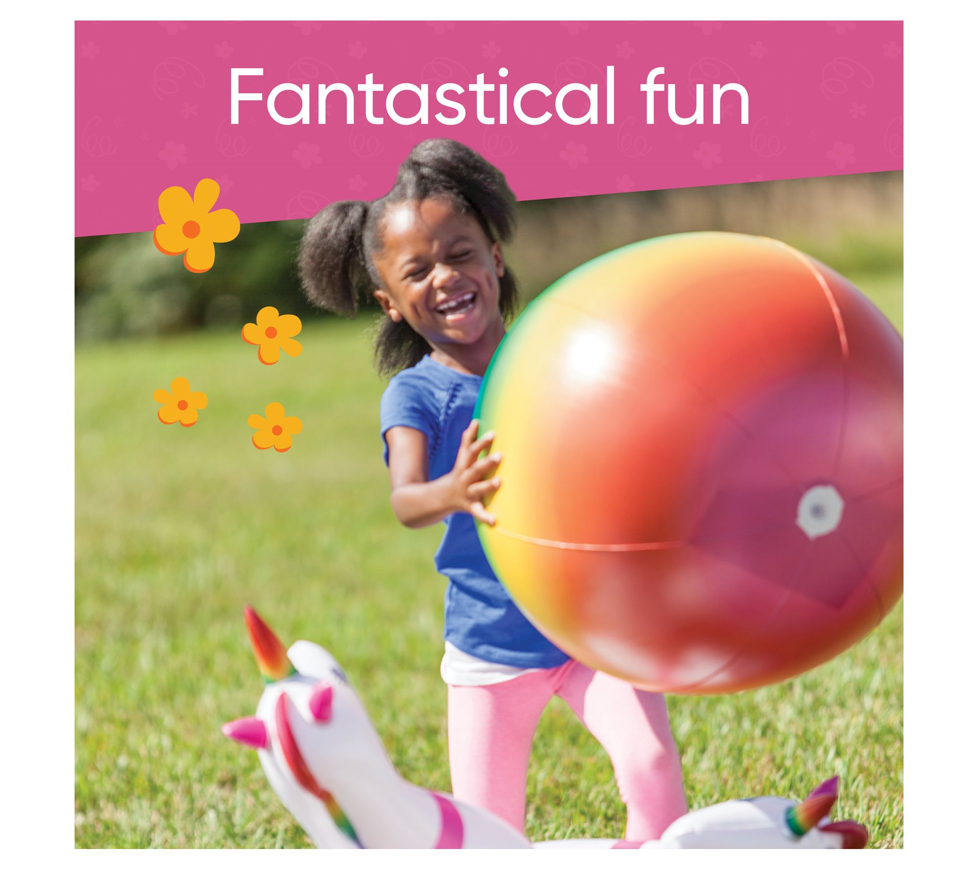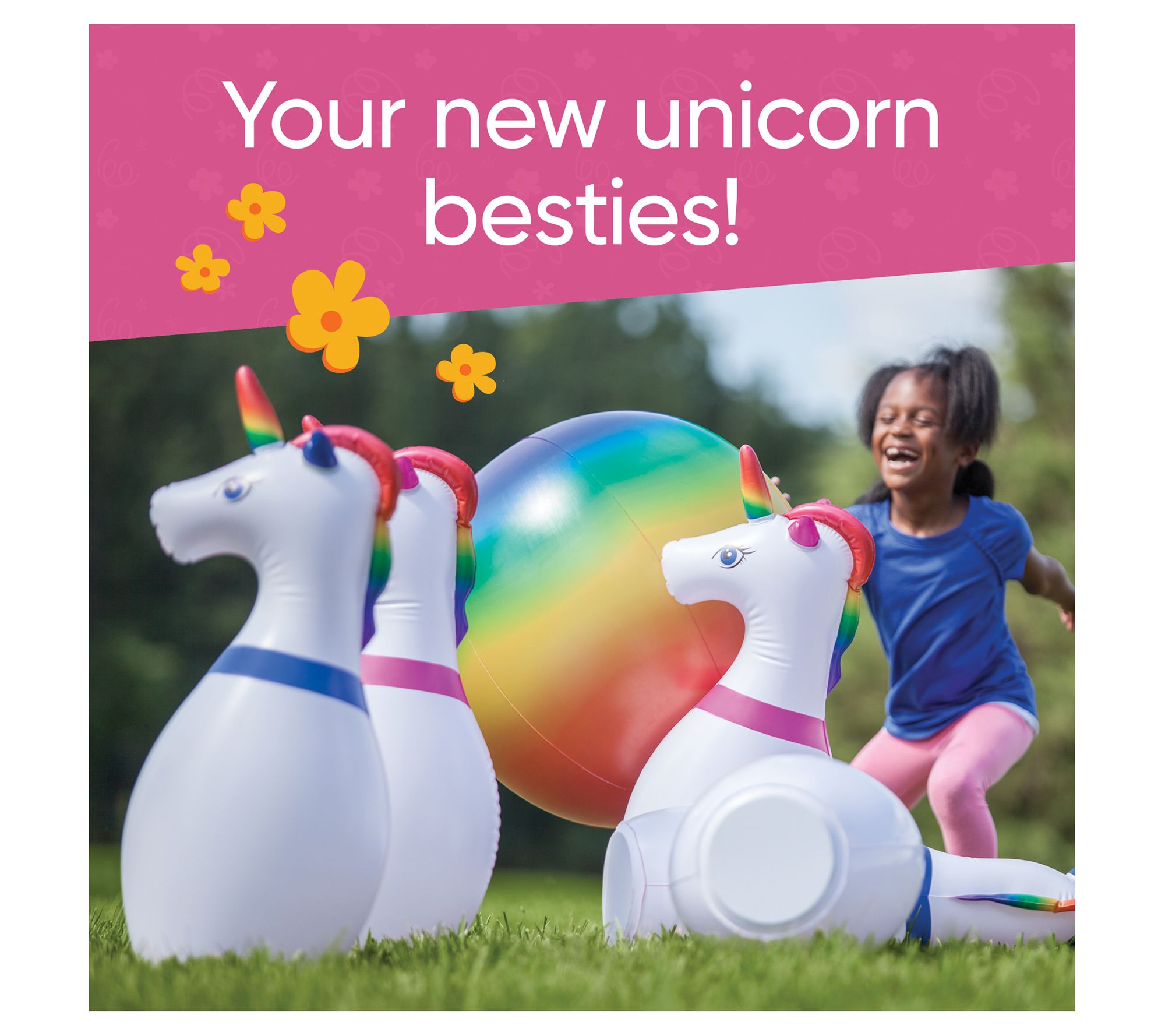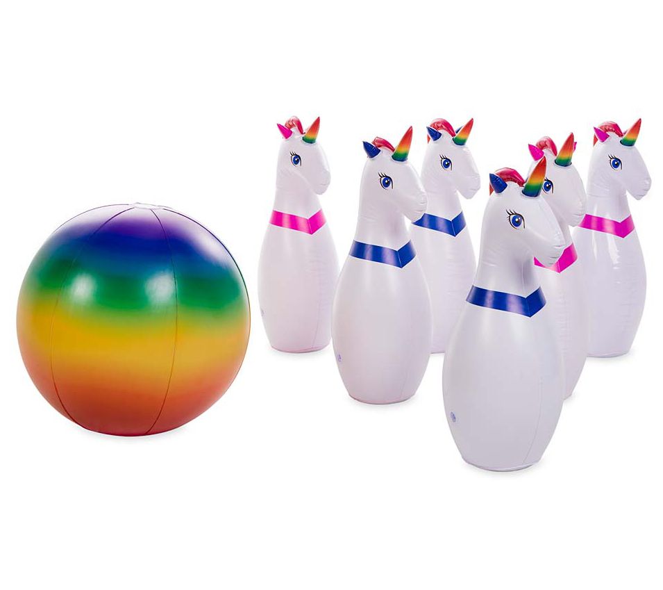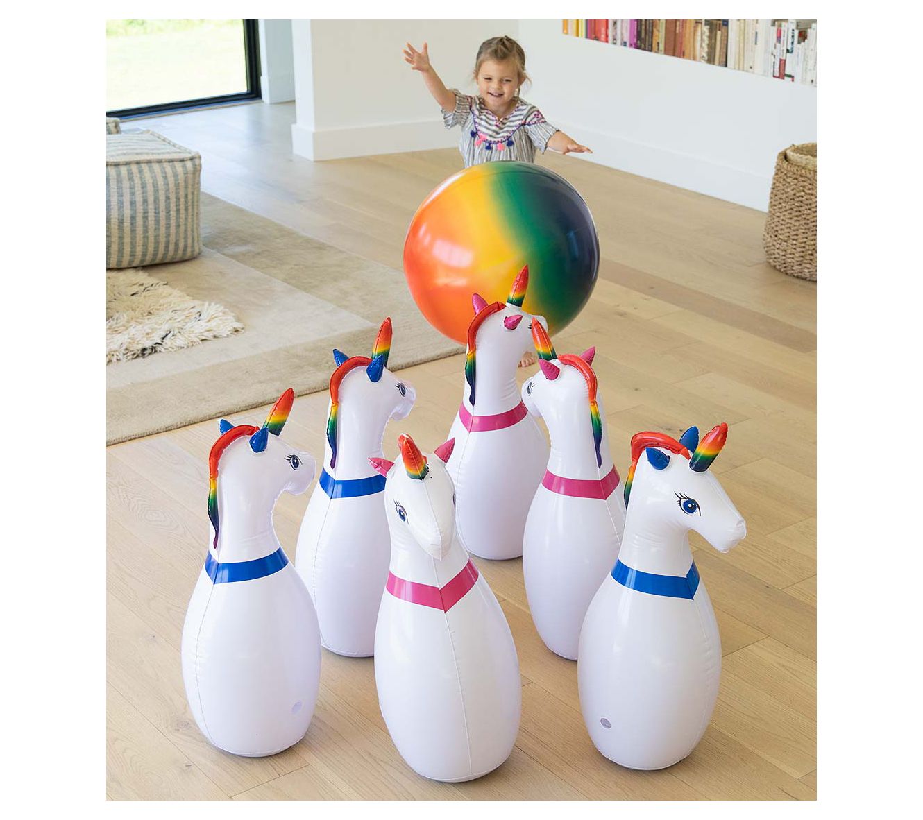 Kids take their playtime to unimaginable heights with this giant inflatable unicorn bowling game, offering a variety of fun ways to play and encouraging hand-eye coordination, good-natured competition, and sportsmanship, making it ideal for playdates and family barbecues. From Hearthsong.