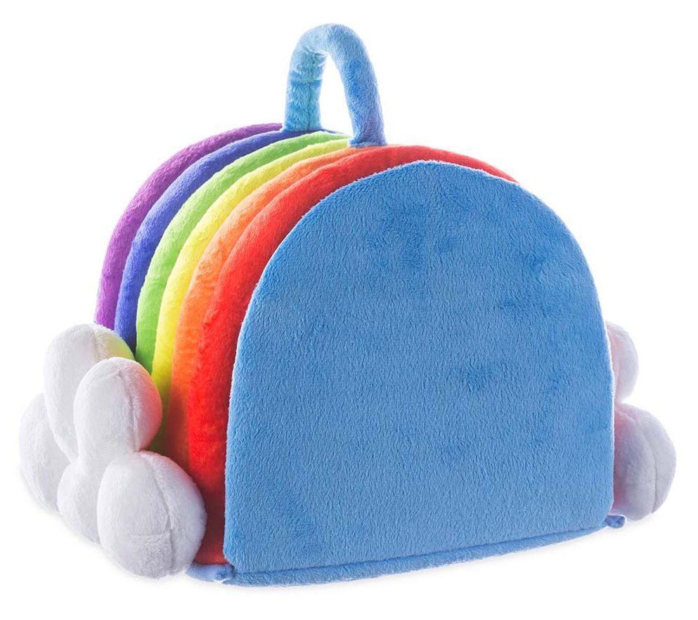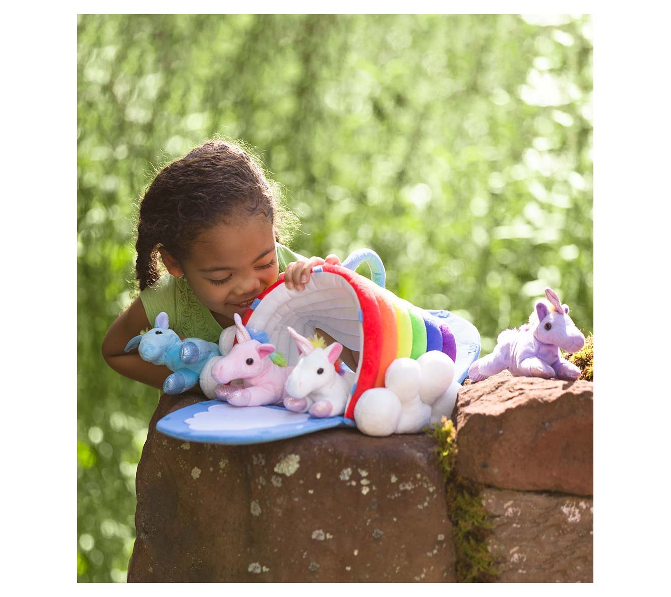 With glittery details, colorful manes and tails, and cuddly-soft construction, this set of four unicorns is perfect for playtime or bedtime, and the rainbow cottage carrier opens to reveal a convenient cloud play mat. From Hearthsong.