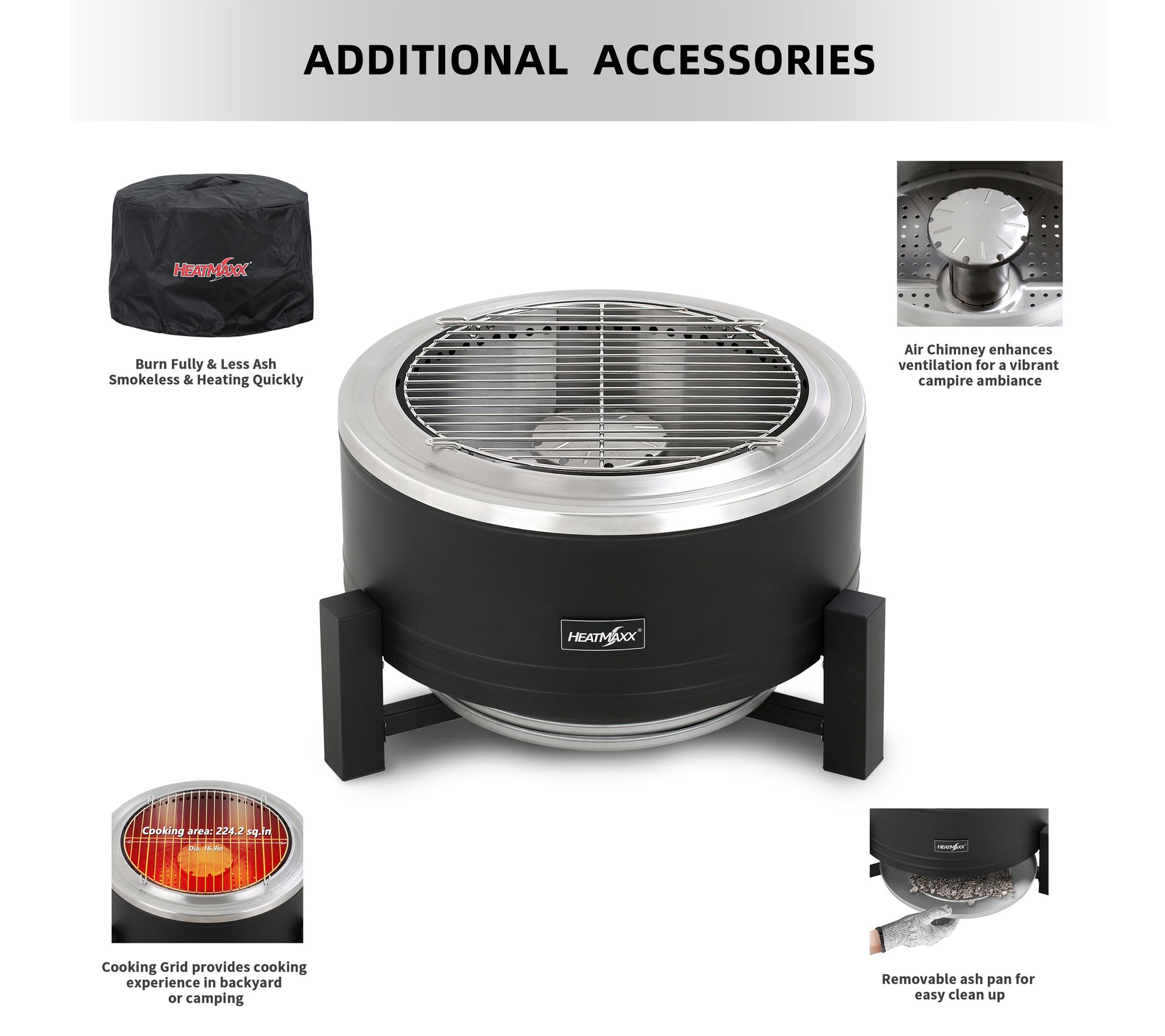 • Includes fire pit, stainless steel grill grate, removable ash pan, and cover