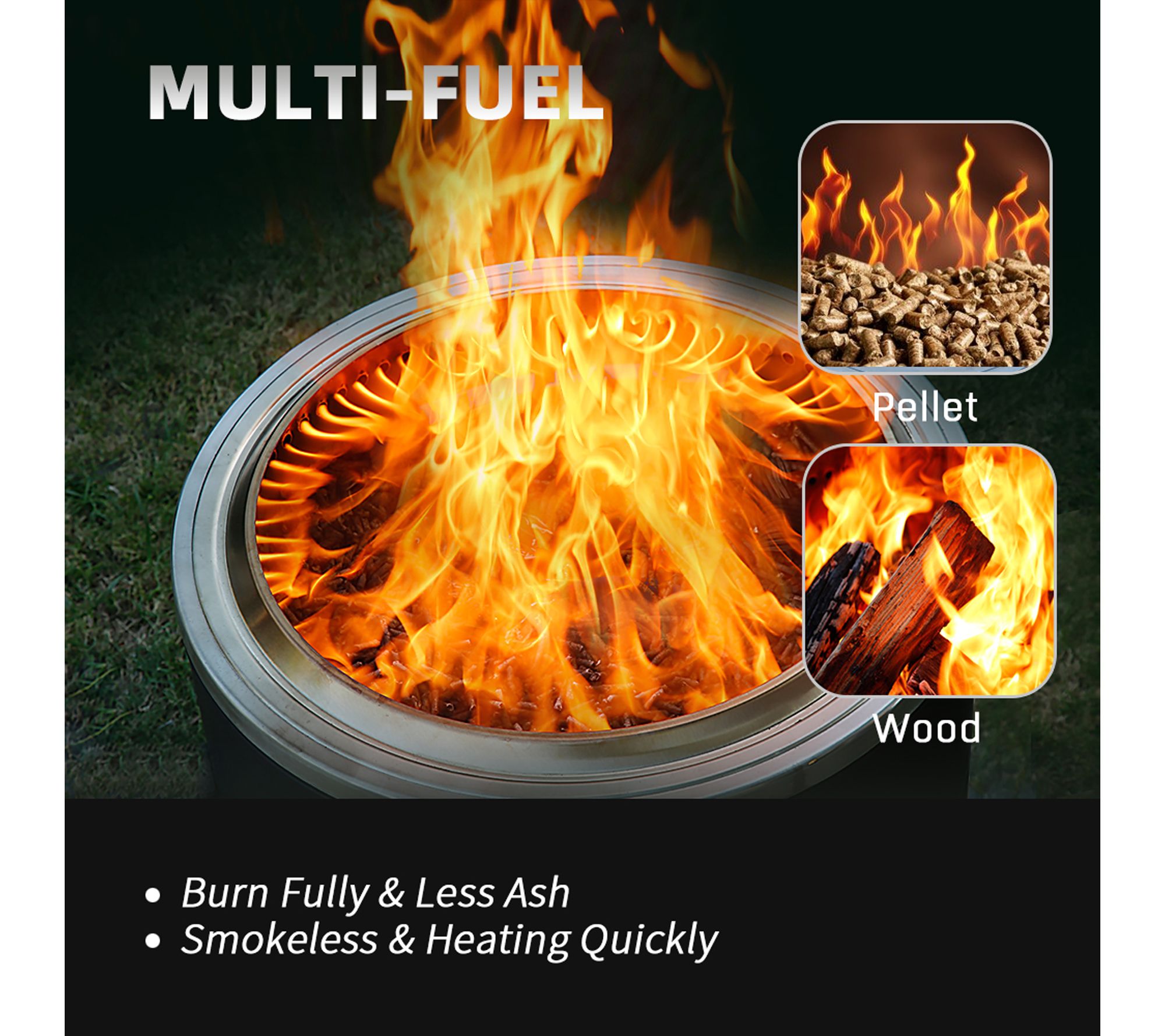 • Multi-fuel ready; for use with wood or pellets, not included