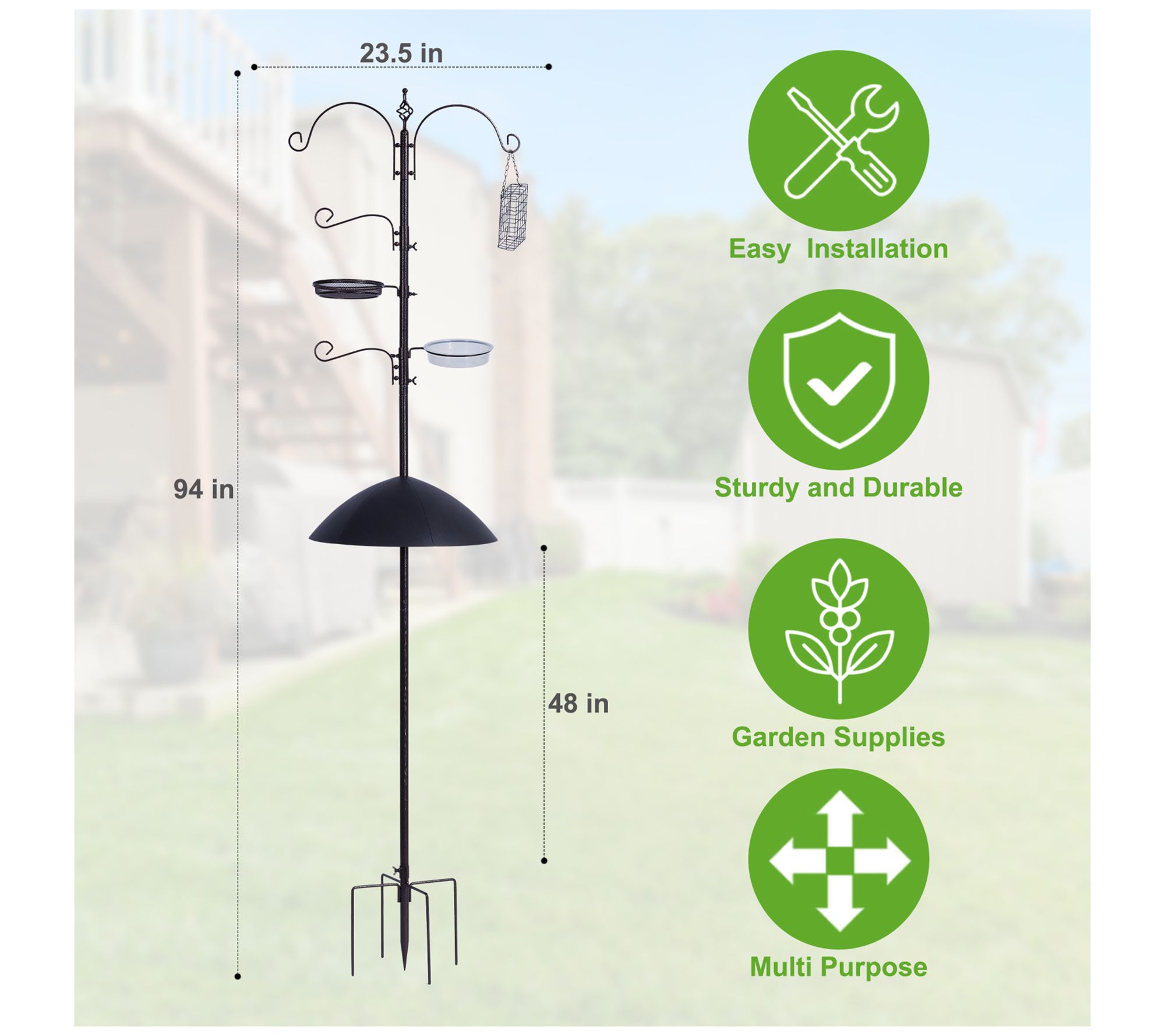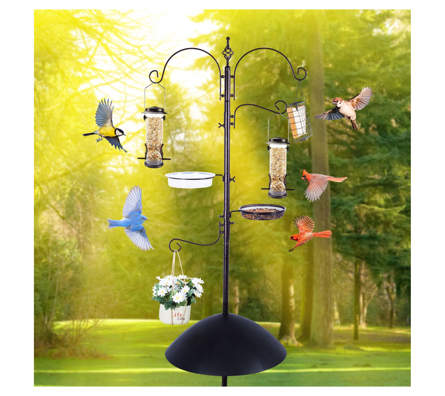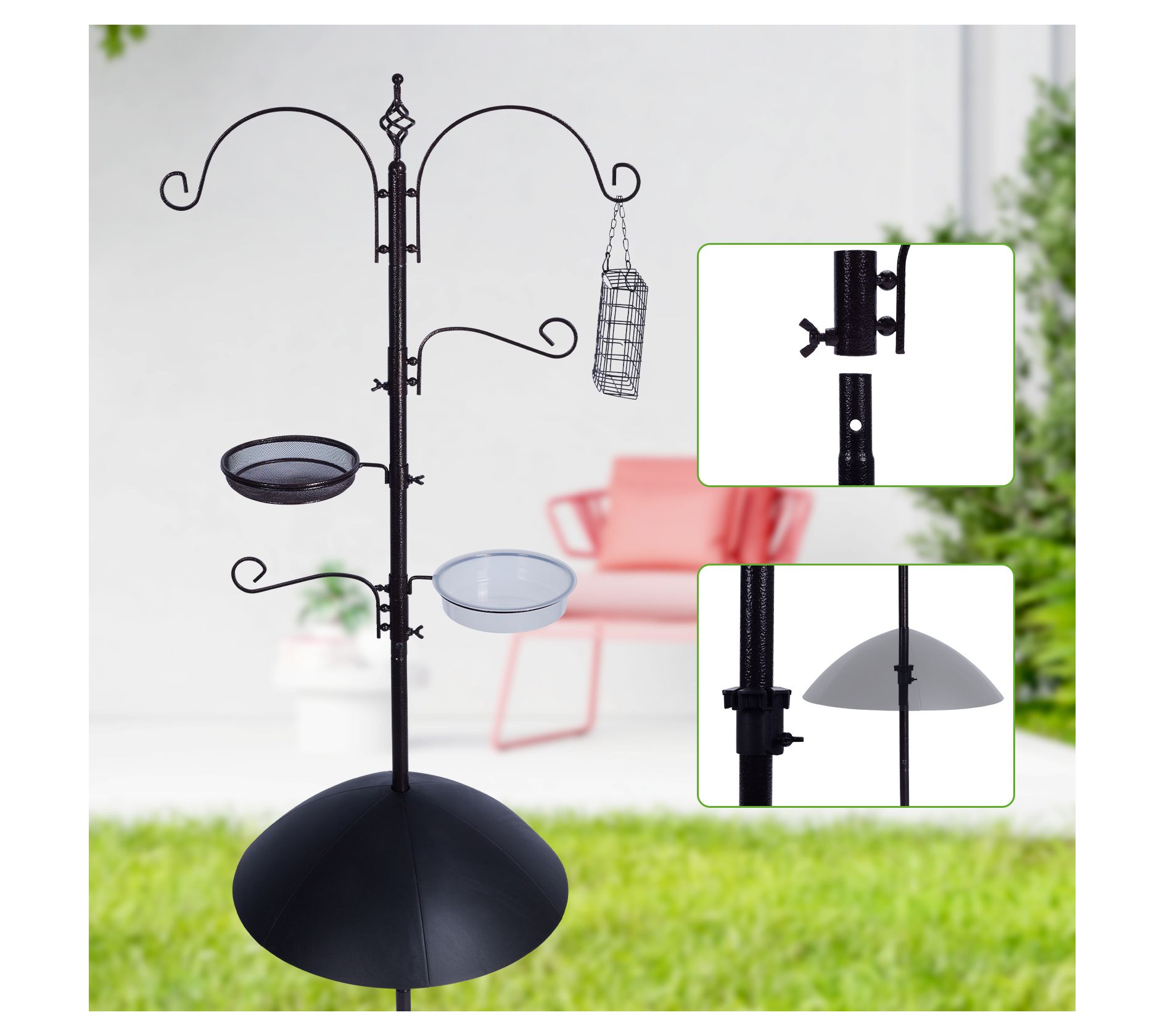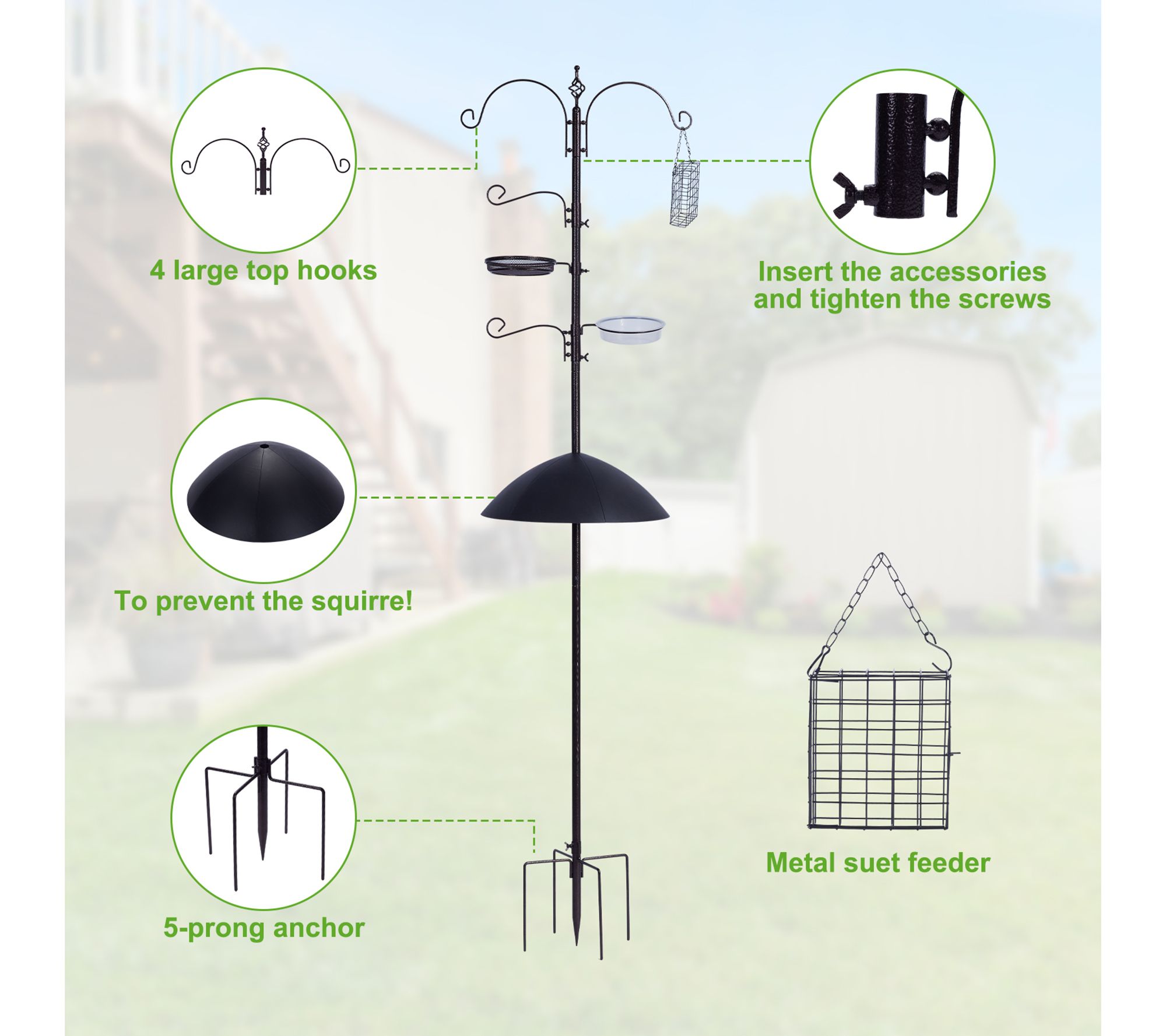 • Includes feeding station with four large top hooks, squirrel prevention cone, five-prong anchor, metal suet feeder, and hardware kit