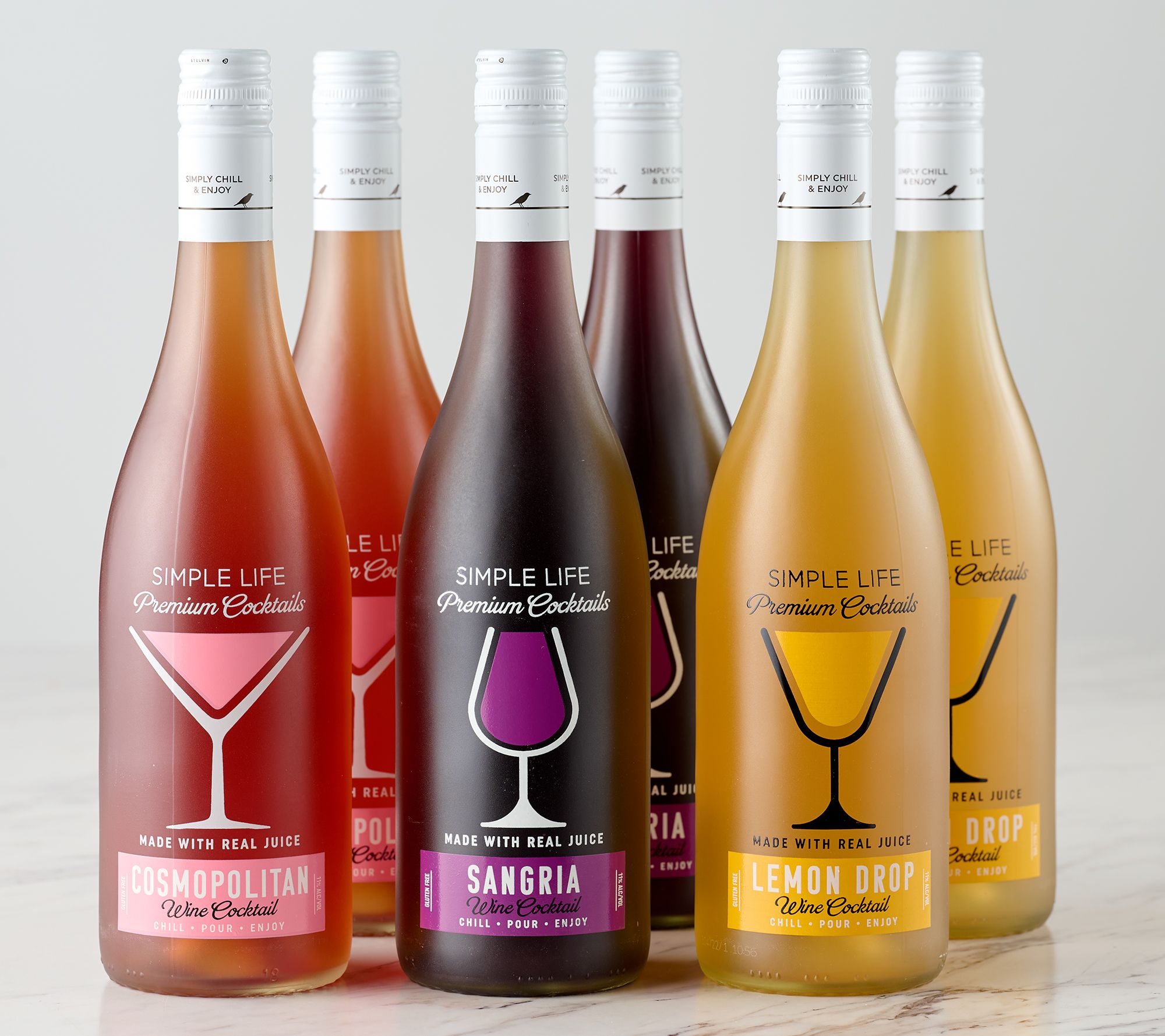 • Includes six 750-ml bottles of wine cocktails: two each of Lemon Drop, Cosmopolitan, and Sangria