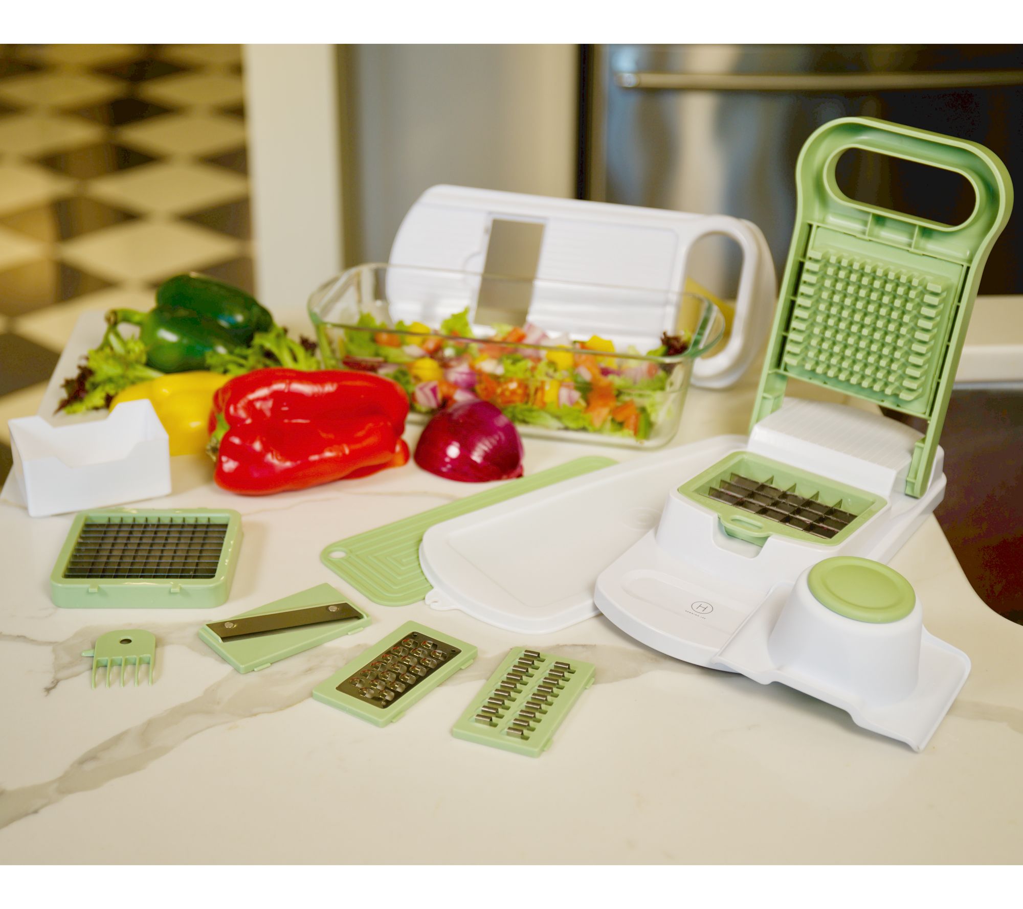 • Includes straight, julienne, and grater blades, glass container, storage lid, chopper lid, mandolin lid, medium and fine chopping blades, blade organizer, anti-slip silicone mat, safety holder, and cleaning tool