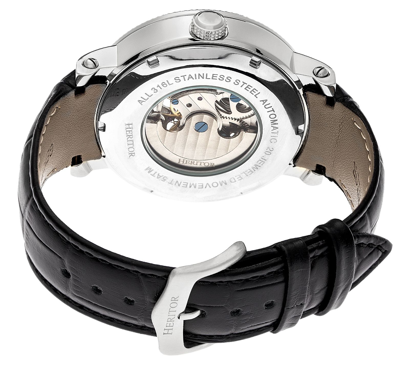 Elevate your style with the Heritor men's Aries stainless automatic leather skeleton watch. This sophisticated timepiece features a skeleton dial and observation caseback, allowing you to marvel at the intricate movement. The genuine leather crocodile-embossed strap adds a touch of luxury, making it perfect for any occasion. From Heritor.