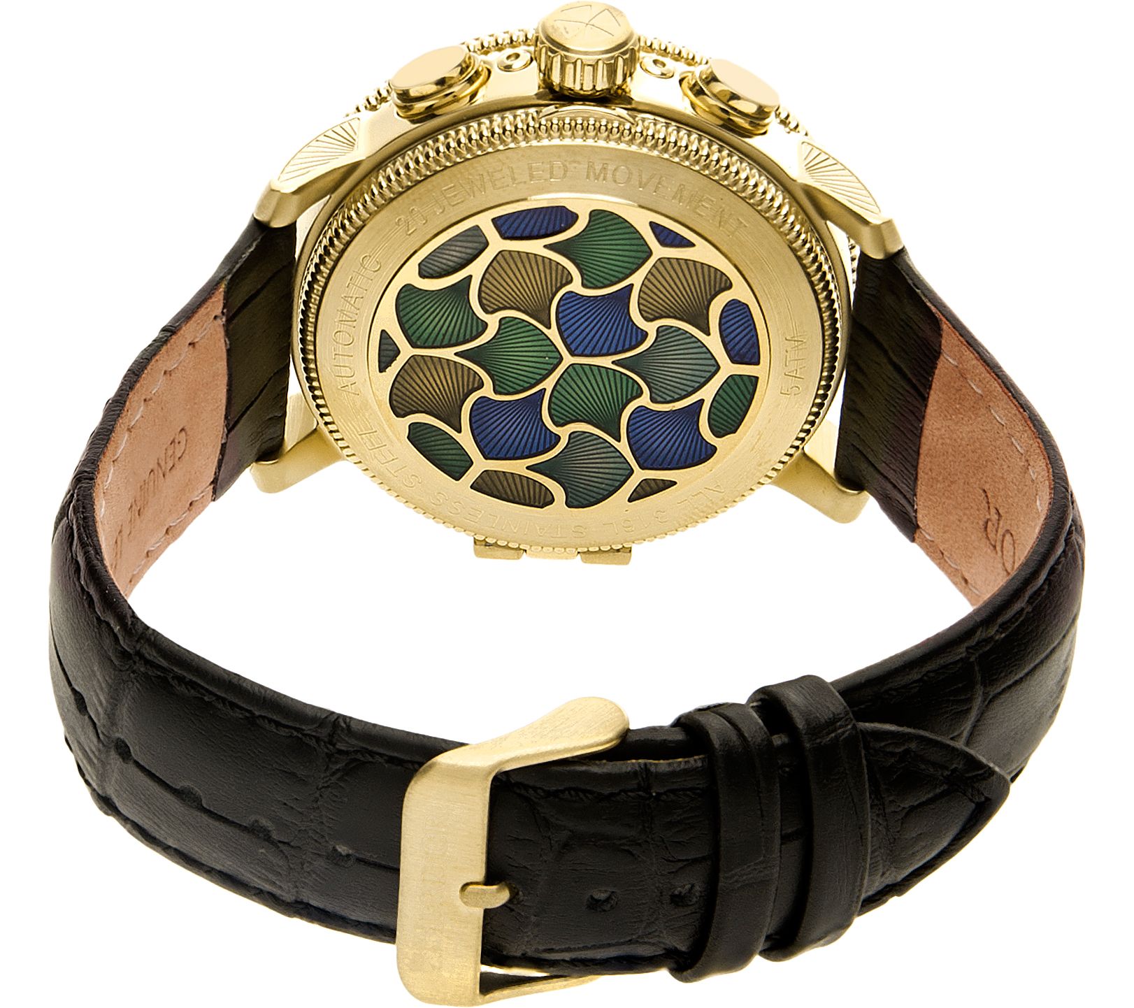 • White and vitreous enamel dial with semi-skeleton design; luminous hour and minute hands, goldtone second hand; day and date subdials