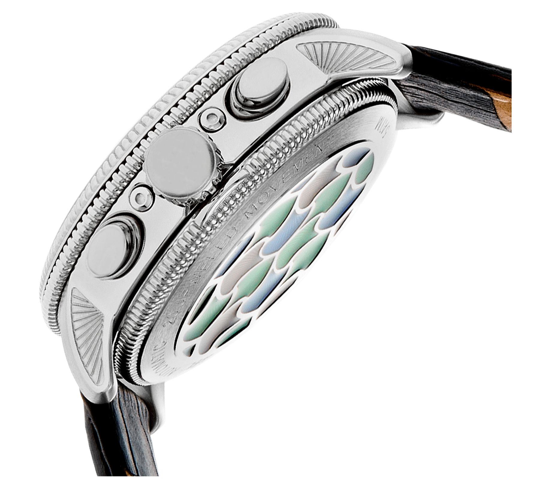 • Multicolor, semi-skeleton dial; luminous hands; day and date sub-dials