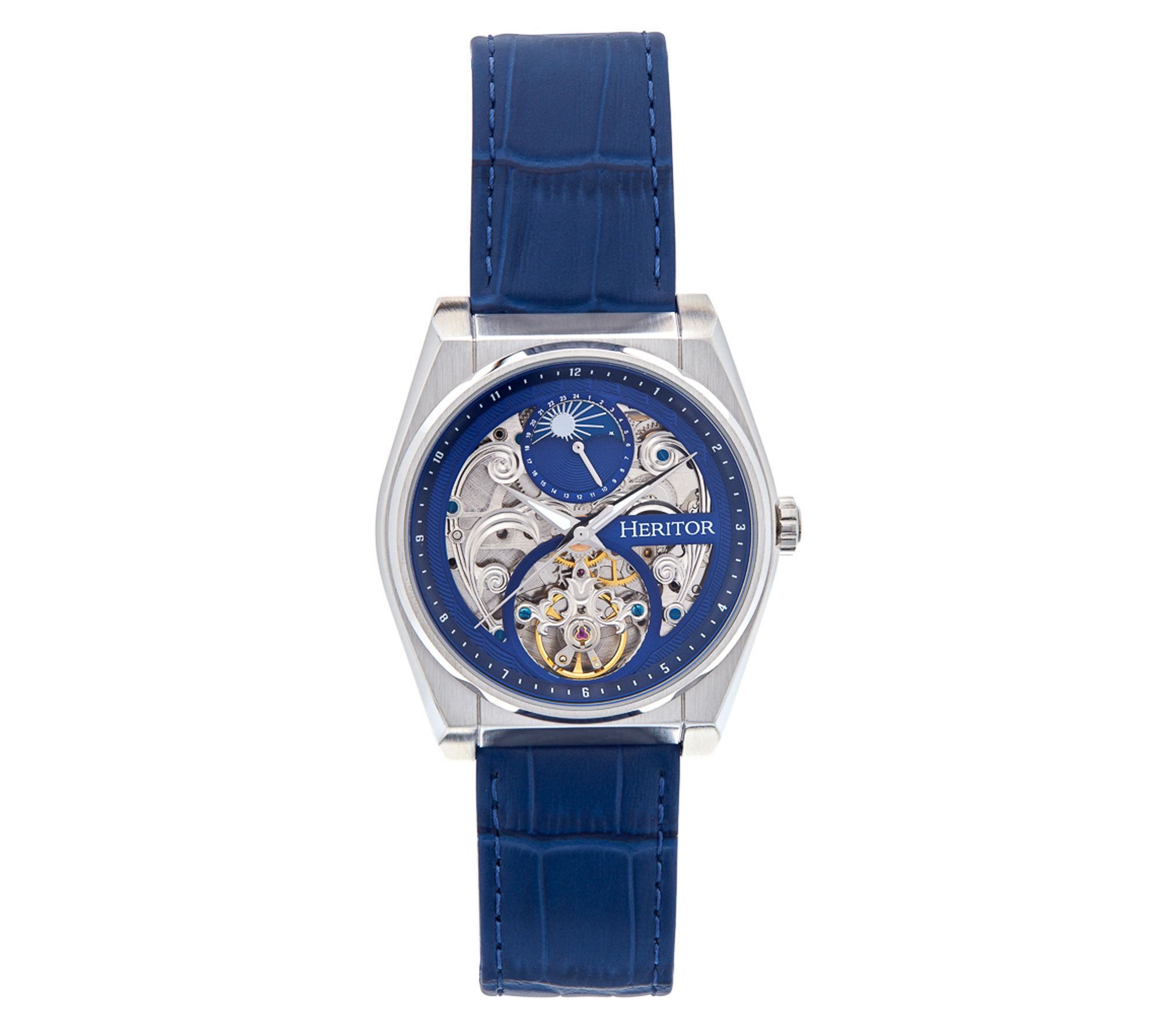 With its sophisticated design and intricate details, the Heritor Automatic Men's Daxton Leather Band Watch is a timeless addition to any collection. Whether you're heading to a formal event or just dressing up your everyday look, this watch adds an element of elegance and style. The genuine leather crocodile-embossed strap ensures comfort, while the luminous hands and moon phase display make it practical for both day and night wear. From Heritor.