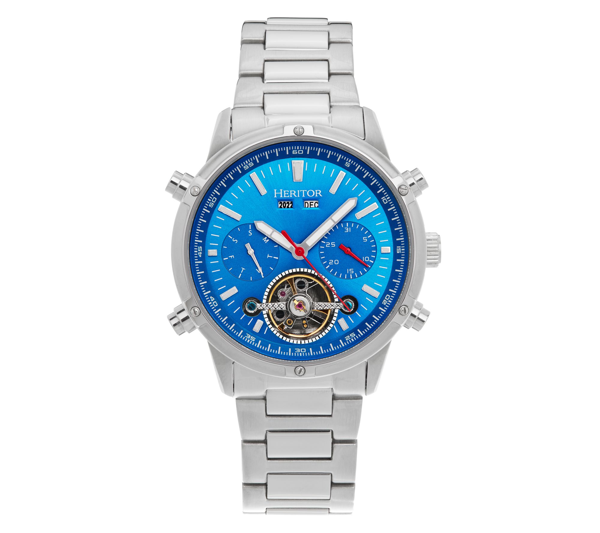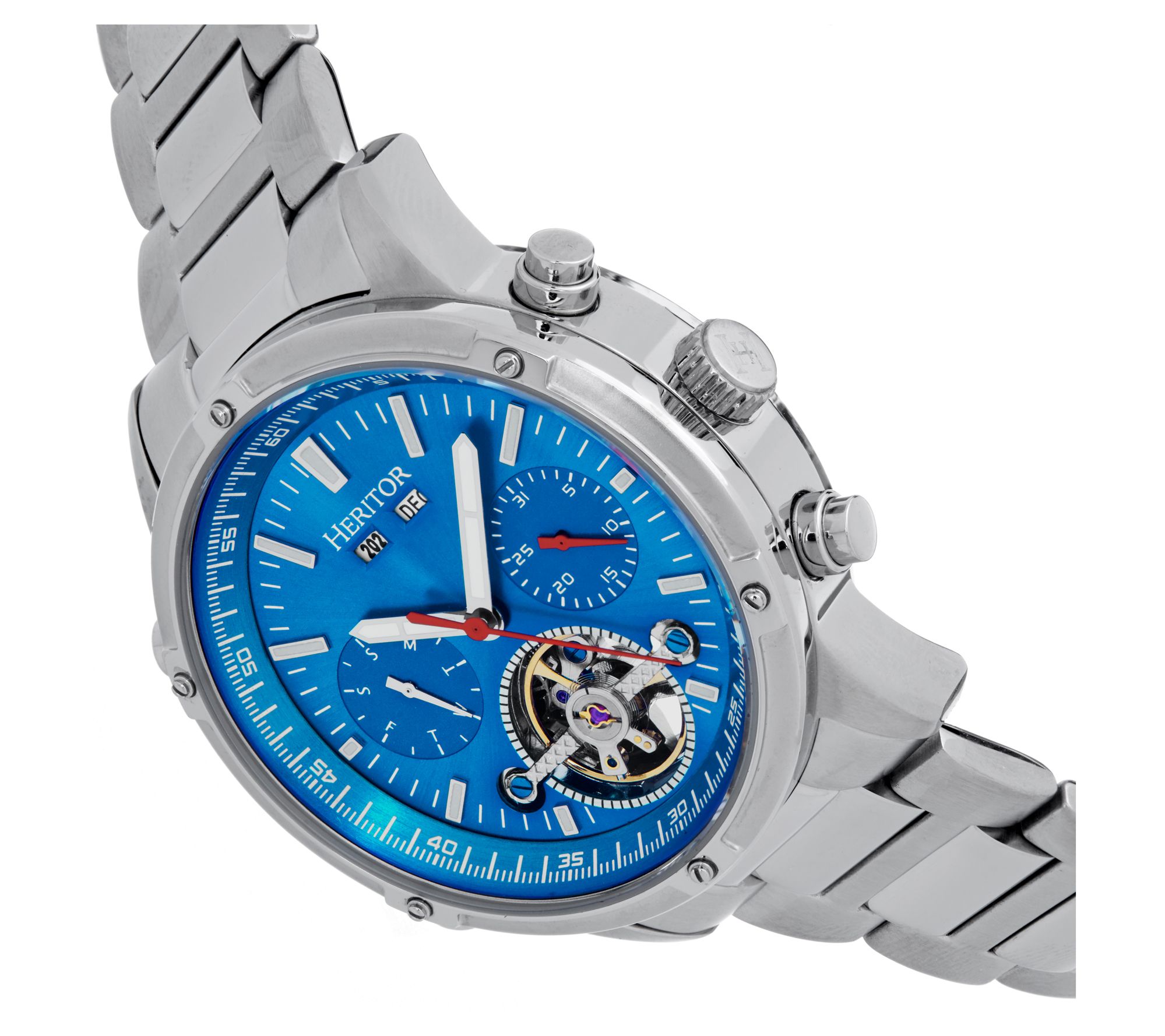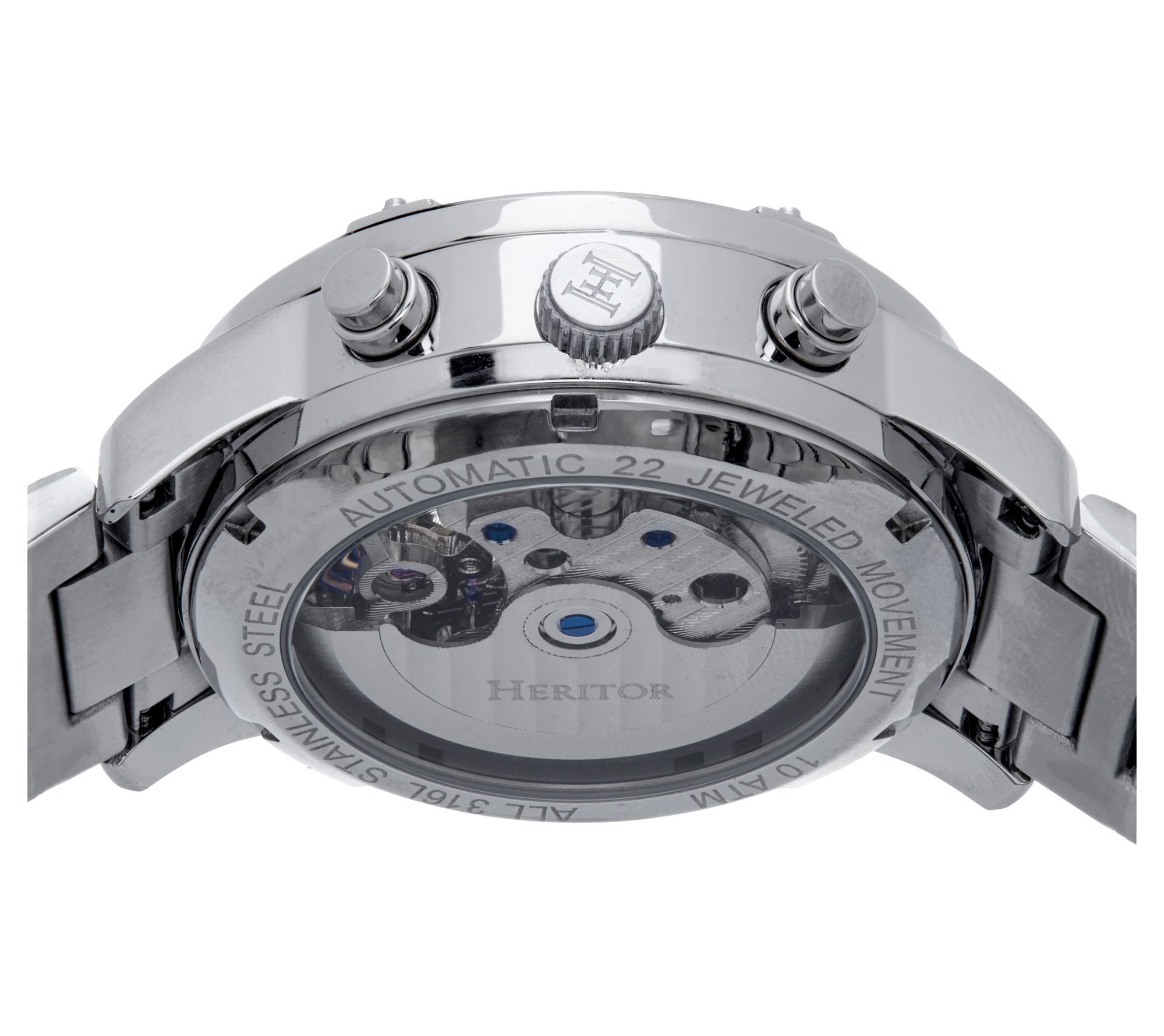 Showcase a sophisticated look with the Heritor Automatic Men's Stainless Wilhelm Skeletal Watch. Featuring a sleek design and the ability to view the intricate automatic movement through an observation caseback, this watch is both stylish and functional. Available in black, blue, or white dials, it’s perfect for any occasion. From Heritor.
