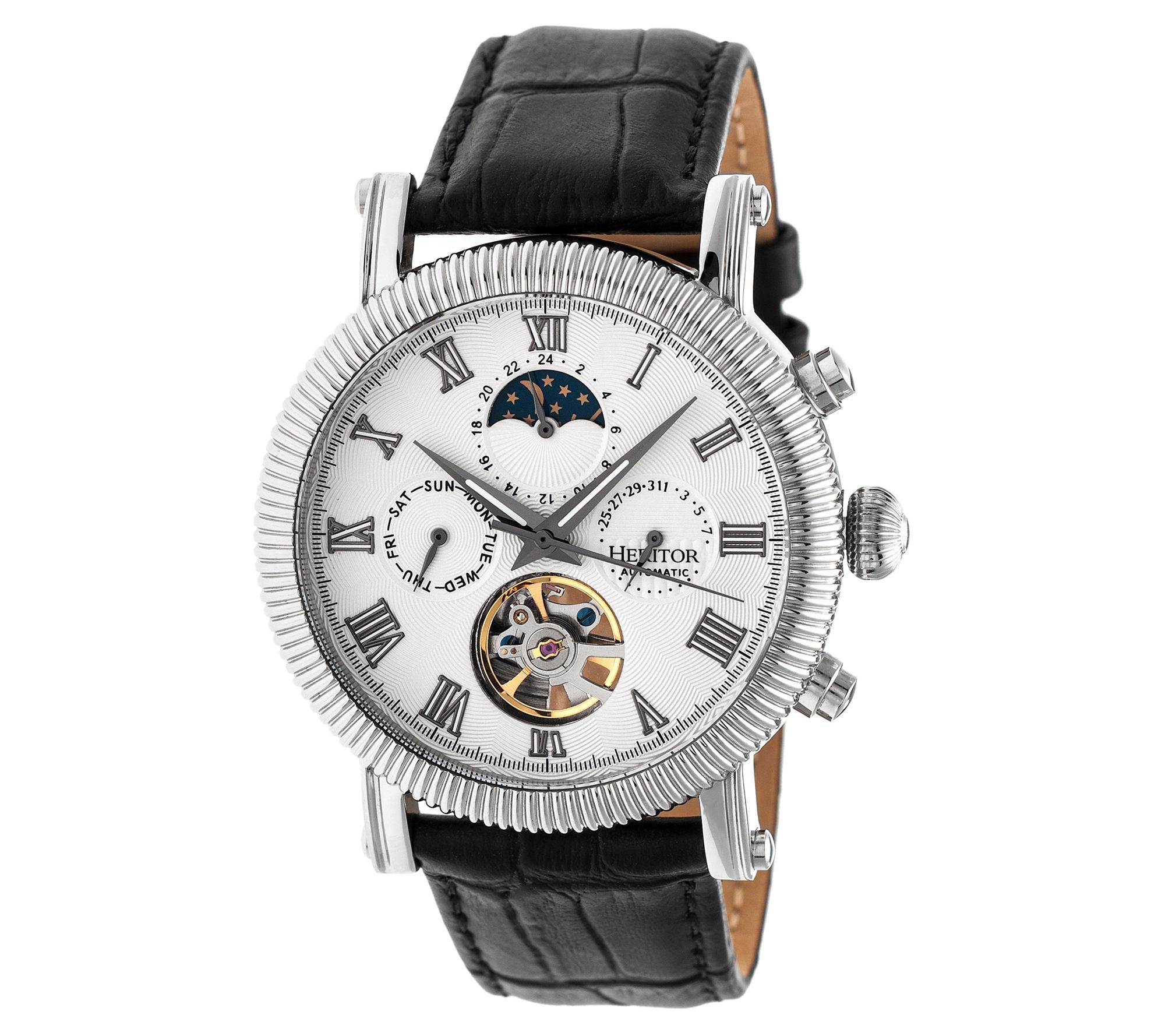Immerse yourself in the intricate craftsmanship of this Winston watch, featuring a jeweled automatic movement. A semi-skeleton dial, complemented by day, date, and moon phase sub-dials, allows a peek into the watch's inner workings, while the leather crocodile-embossed strap adds a touch of sophistication. From Heritor.
