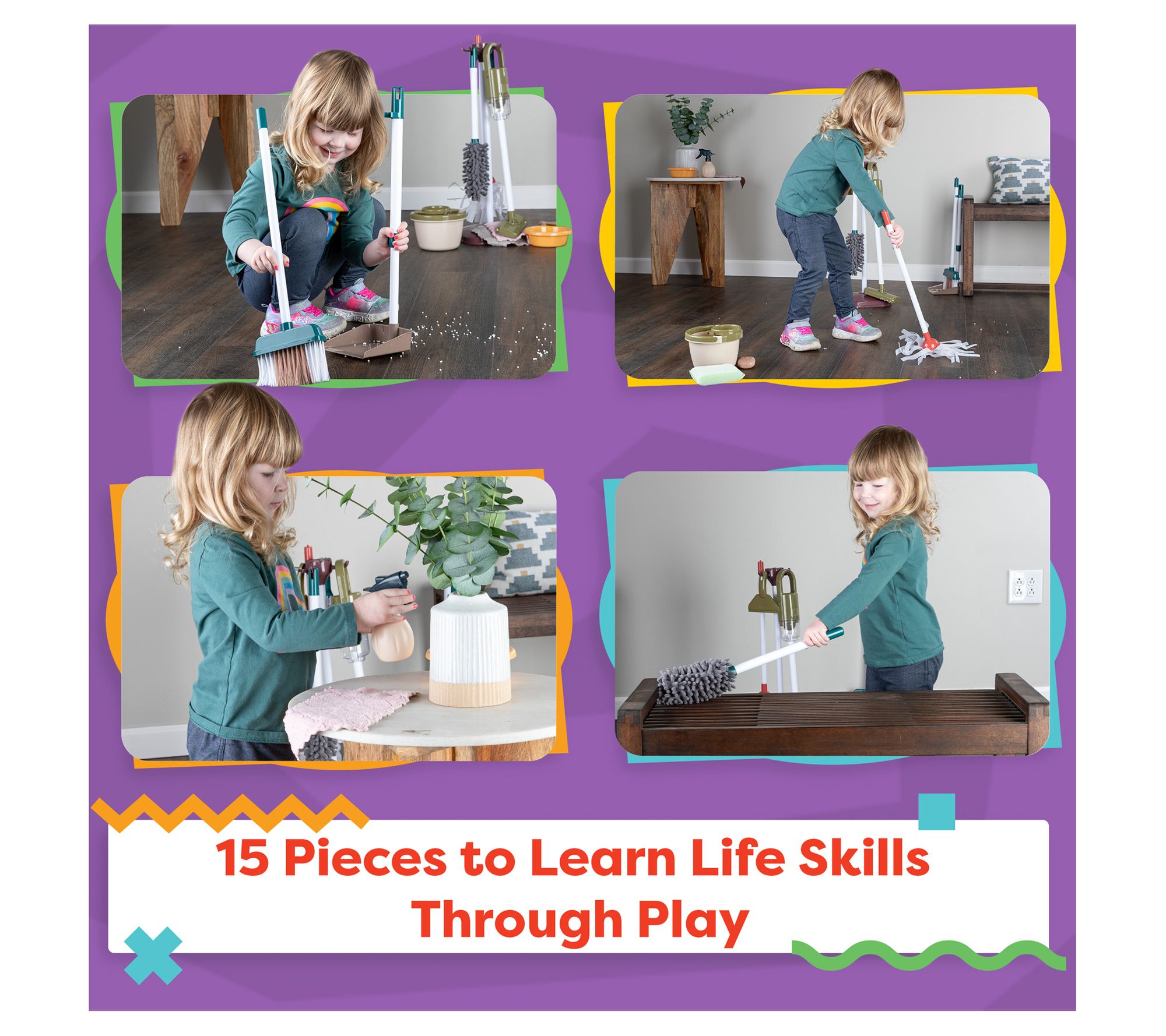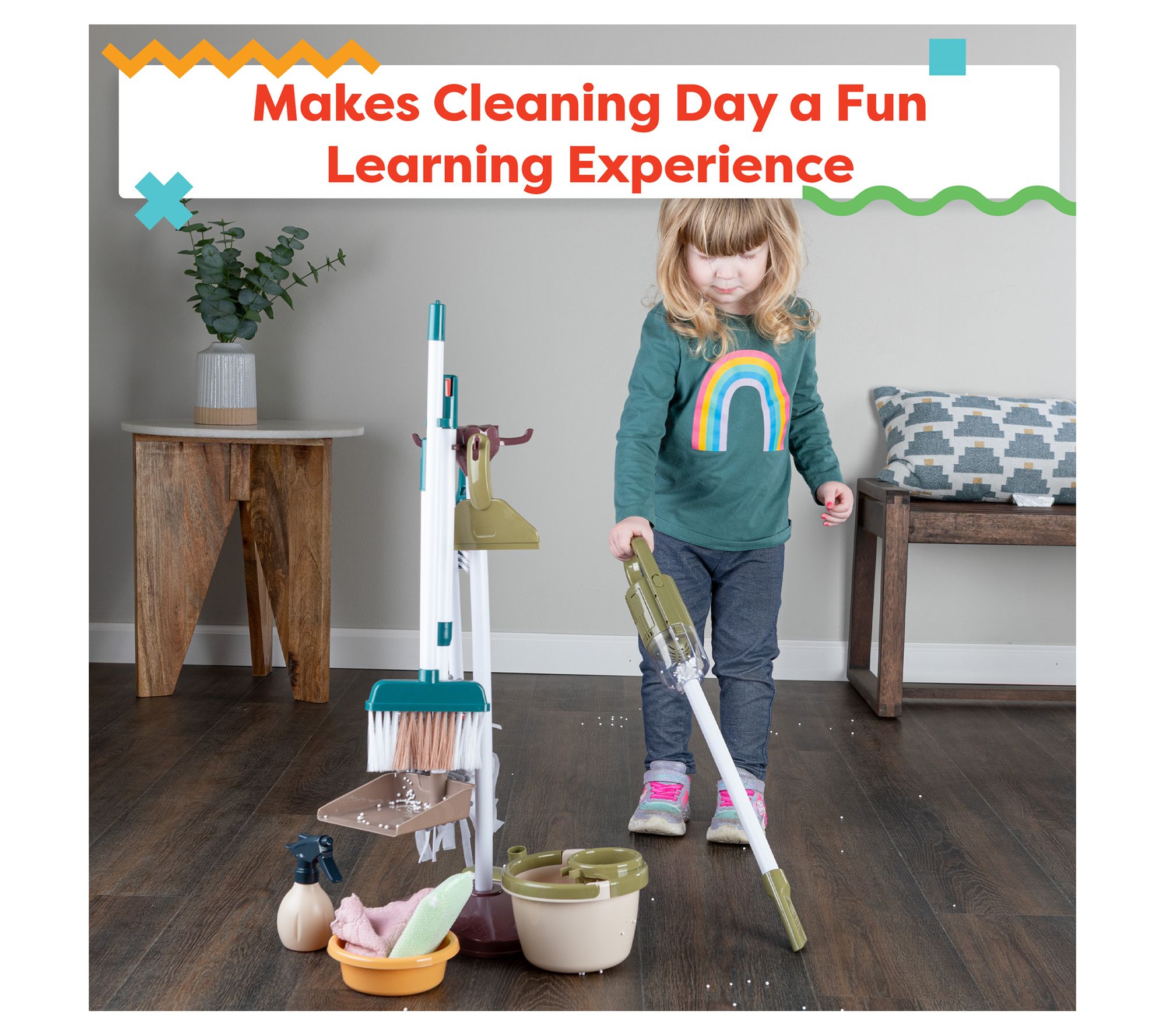 Spark interest in tidying up with this 15-piece kids cleaning set, designed for interactive role play and skill-building fun. The engaging pretend play cleaning tools -- like a working toy vacuum with real suction, mop and bucket, spray bottle, and more -- let kids take charge of their own play space while practicing good habits. From Hey! Play!
