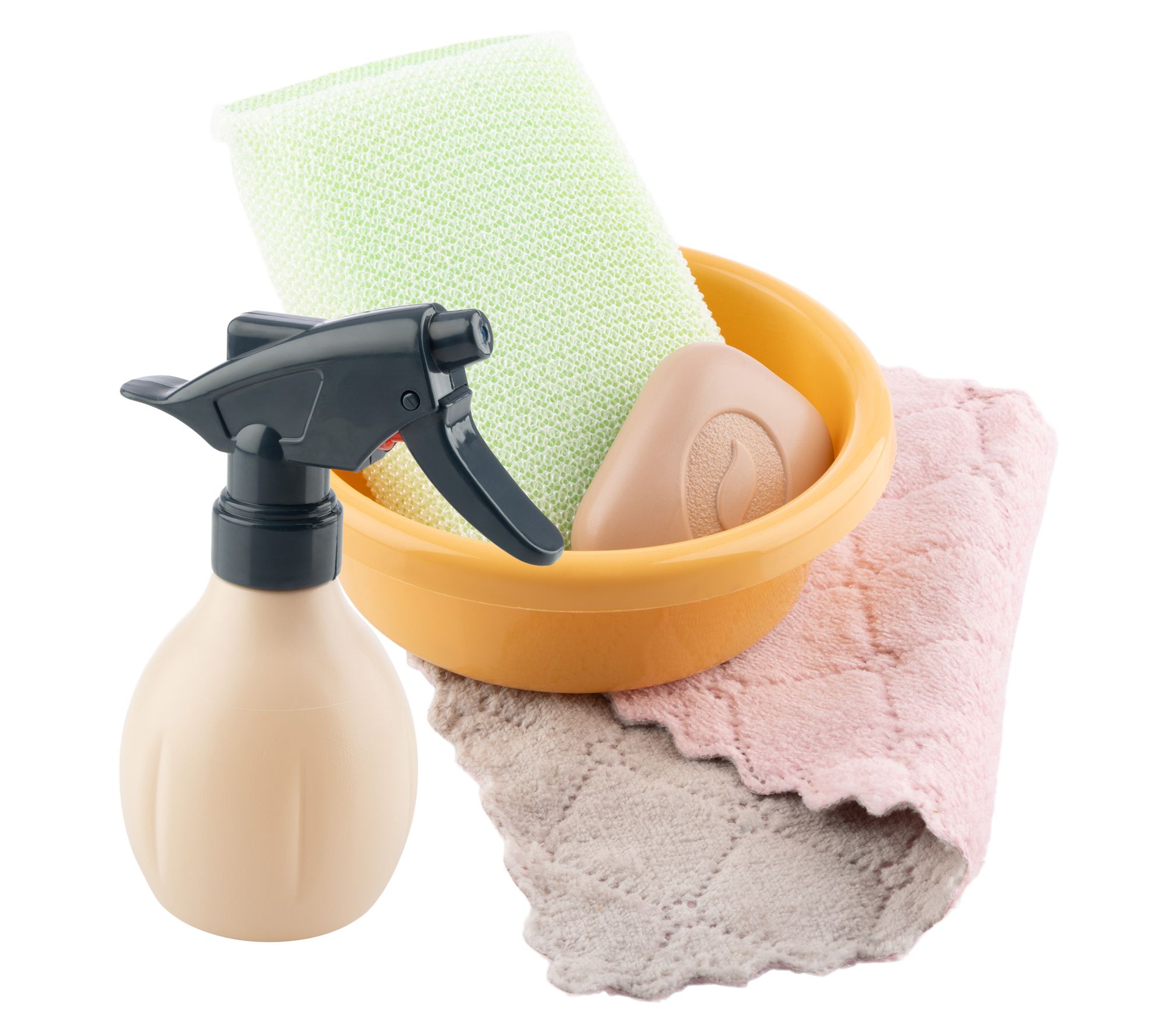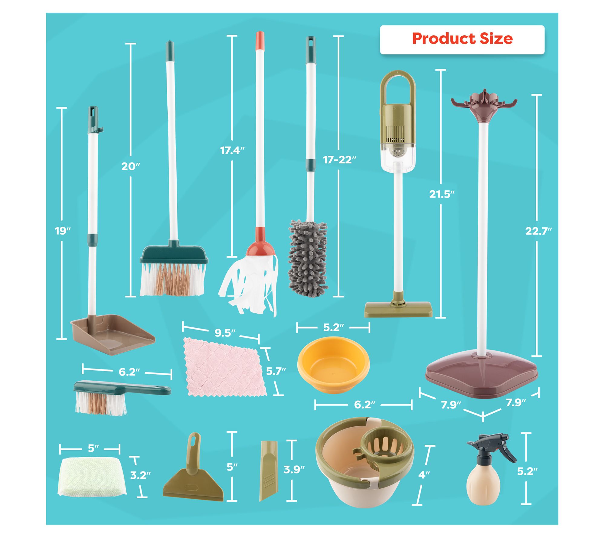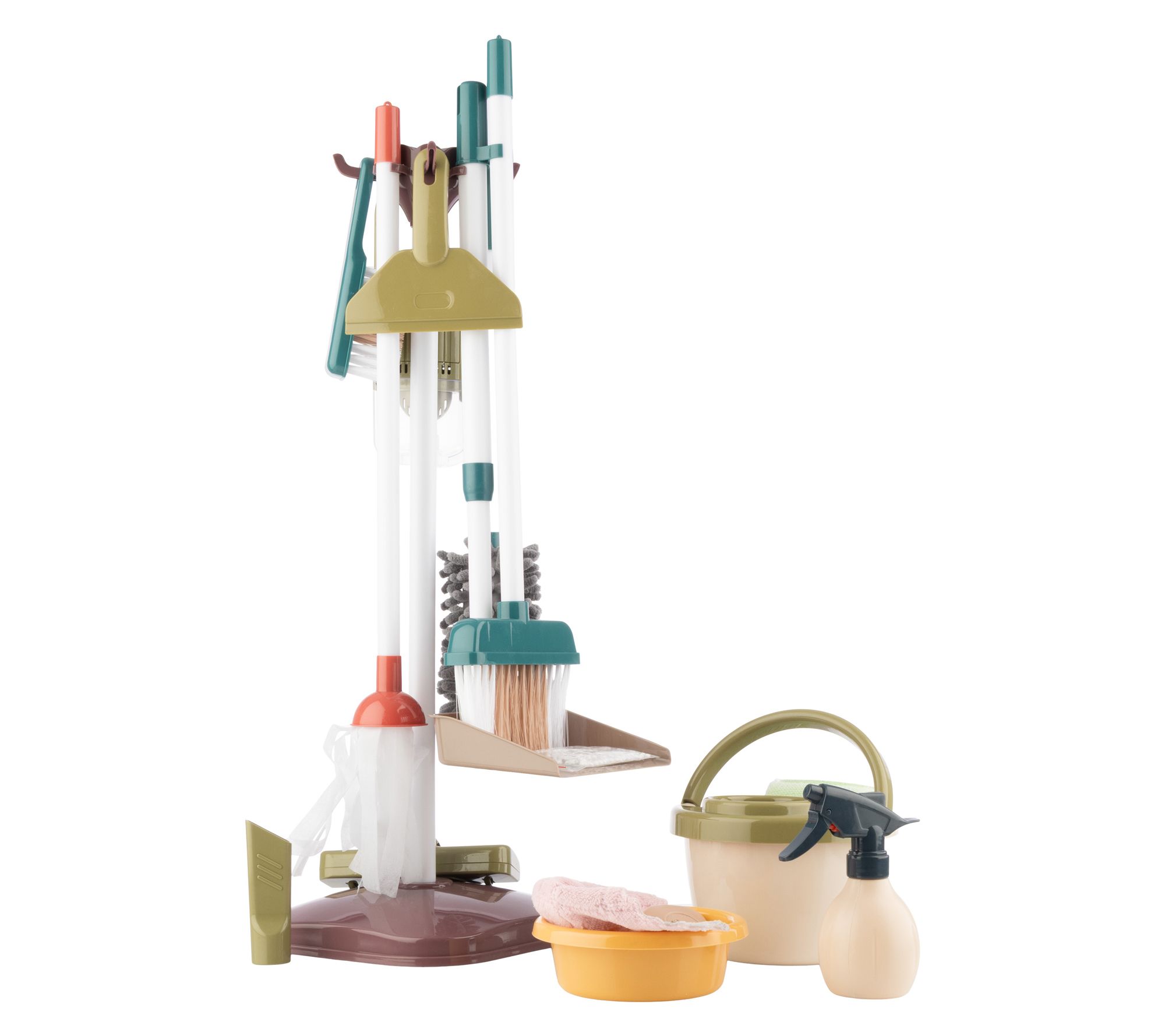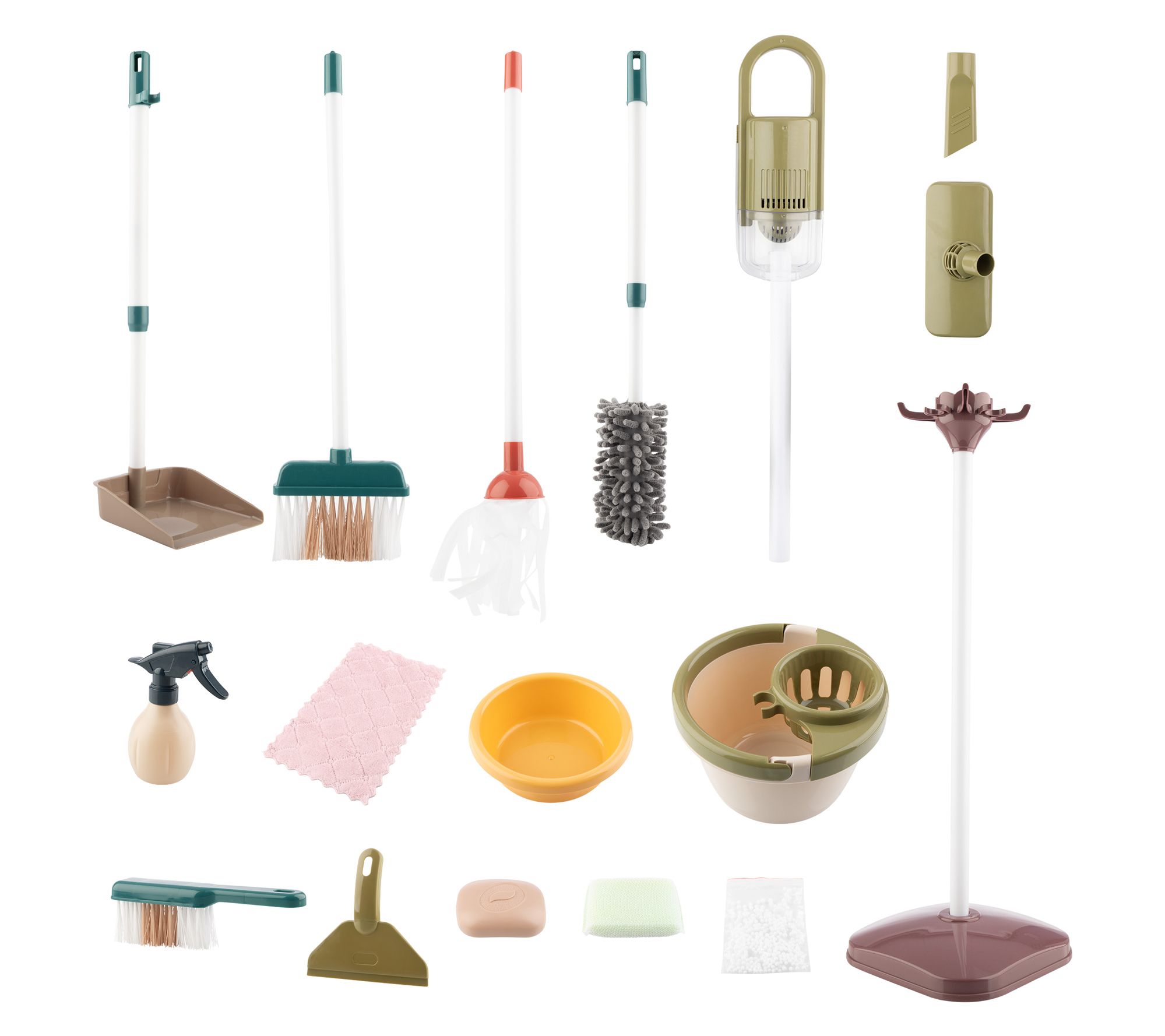 • Includes vacuum, two brooms, dustpan, duster, mop, cloth, bowl, stand, mop bucket, soap bar, sponge, squeegee, and spray bottle