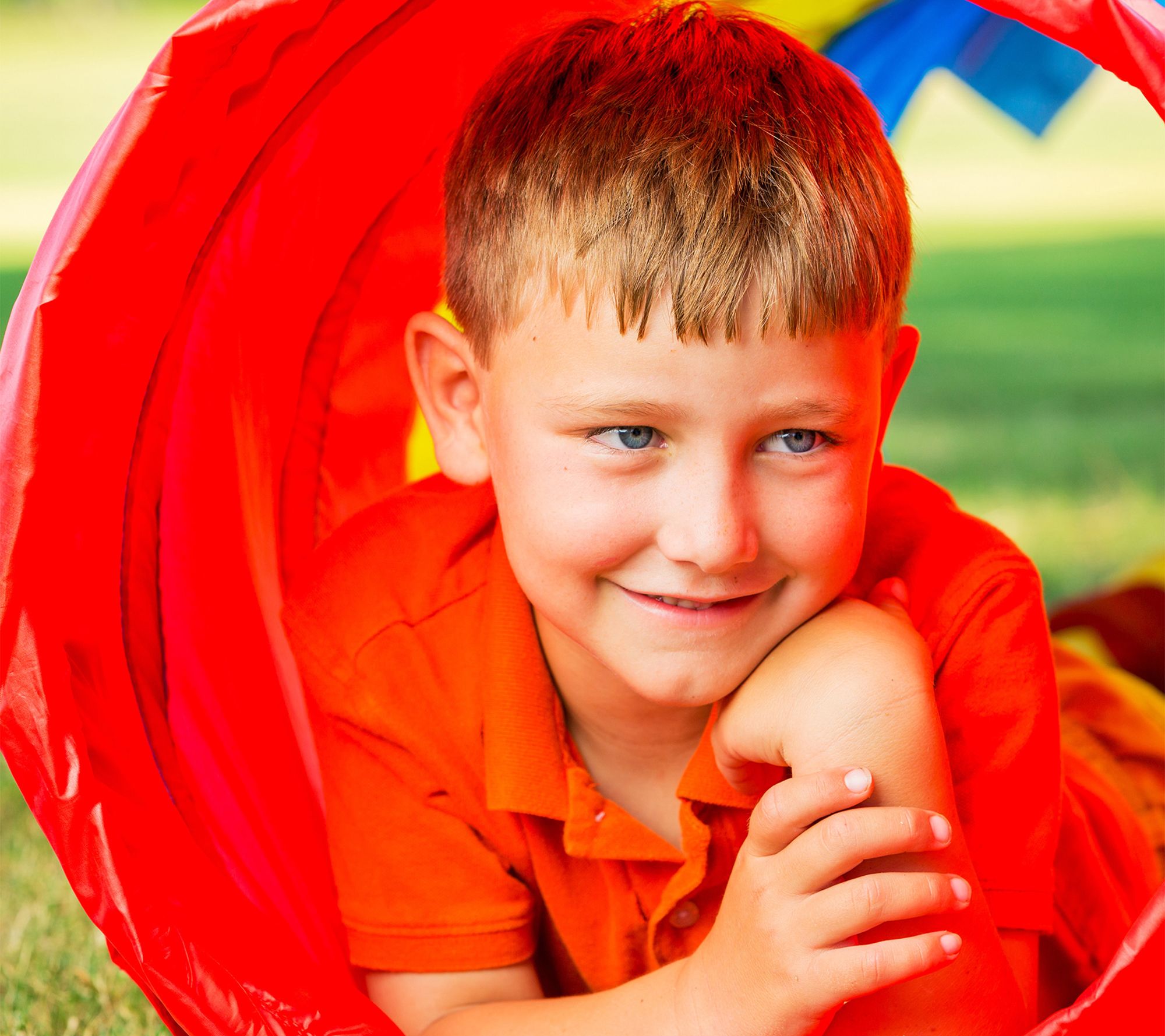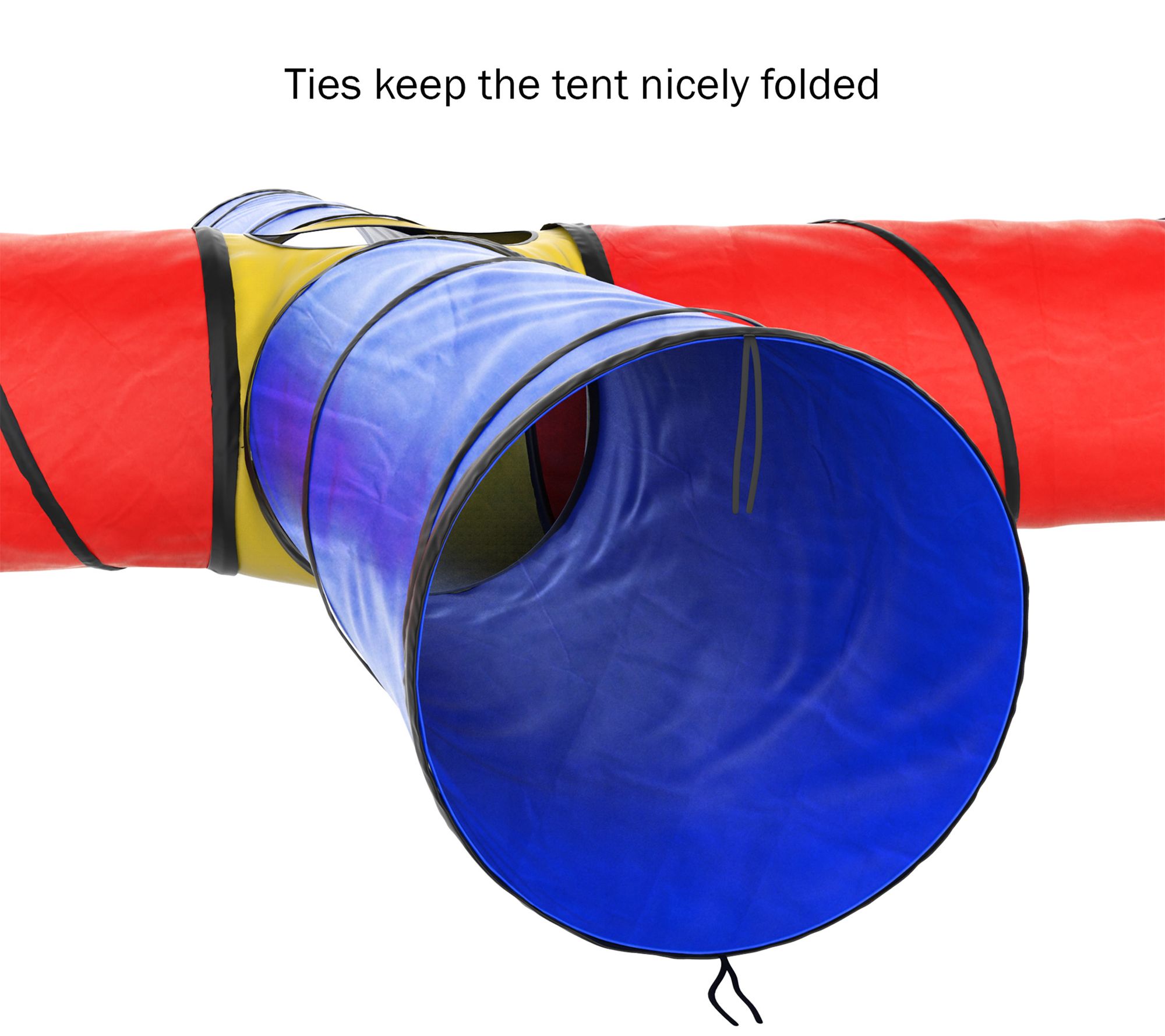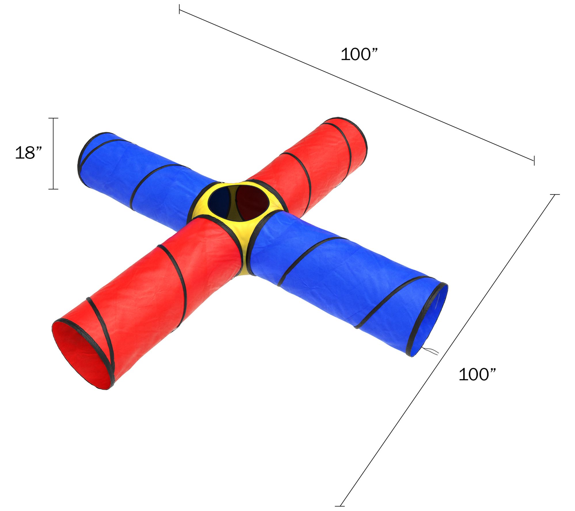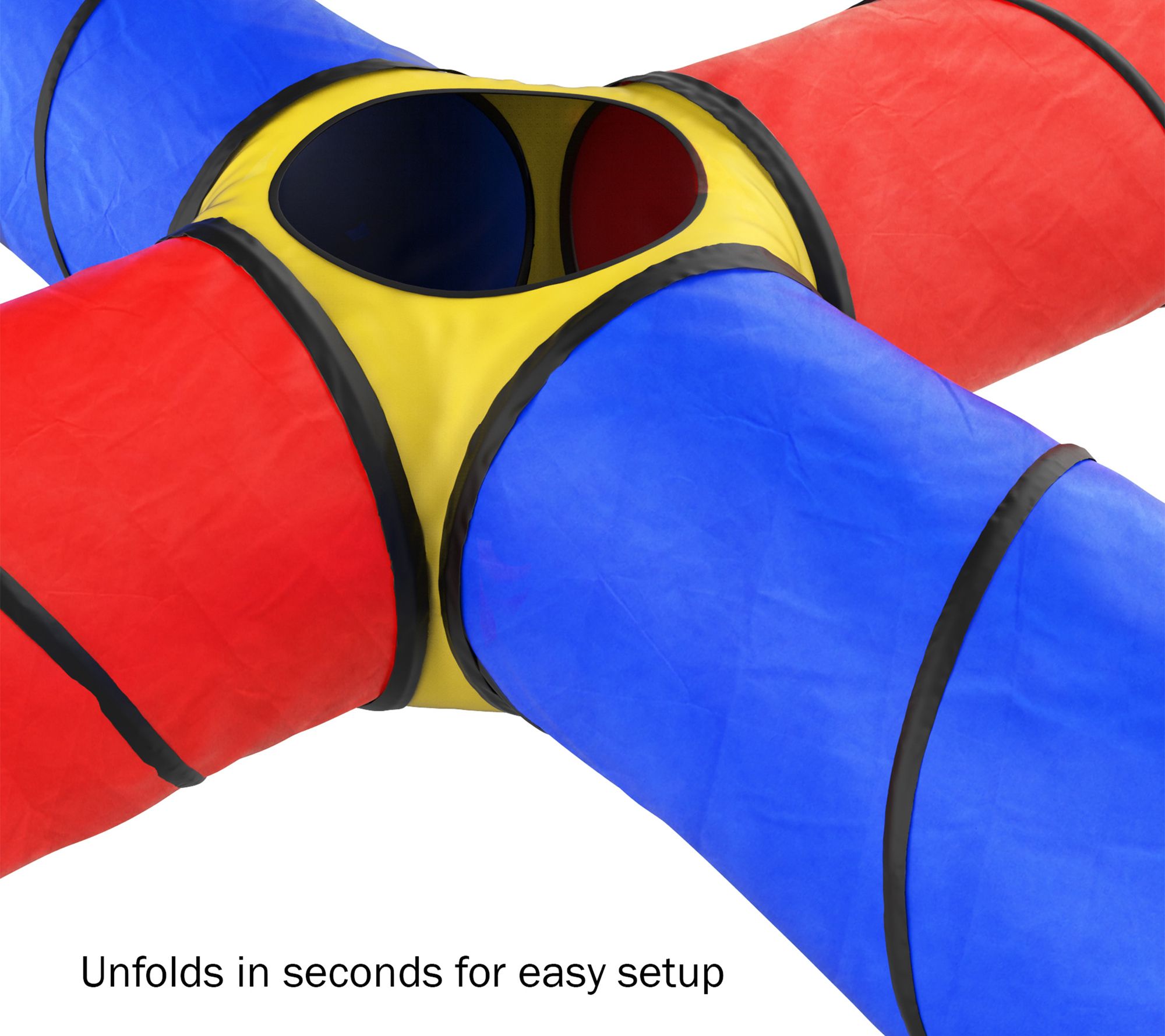 Encourage your child's love of exploring and imaginative play with this brightly colored play tunnel with an "X" shape and four tubes. It easily sets up inside or outside, and conveniently folds back up for storage. From Hey! Play!