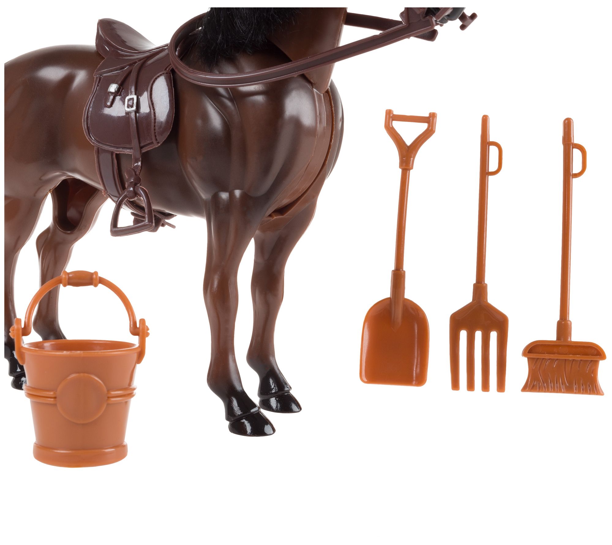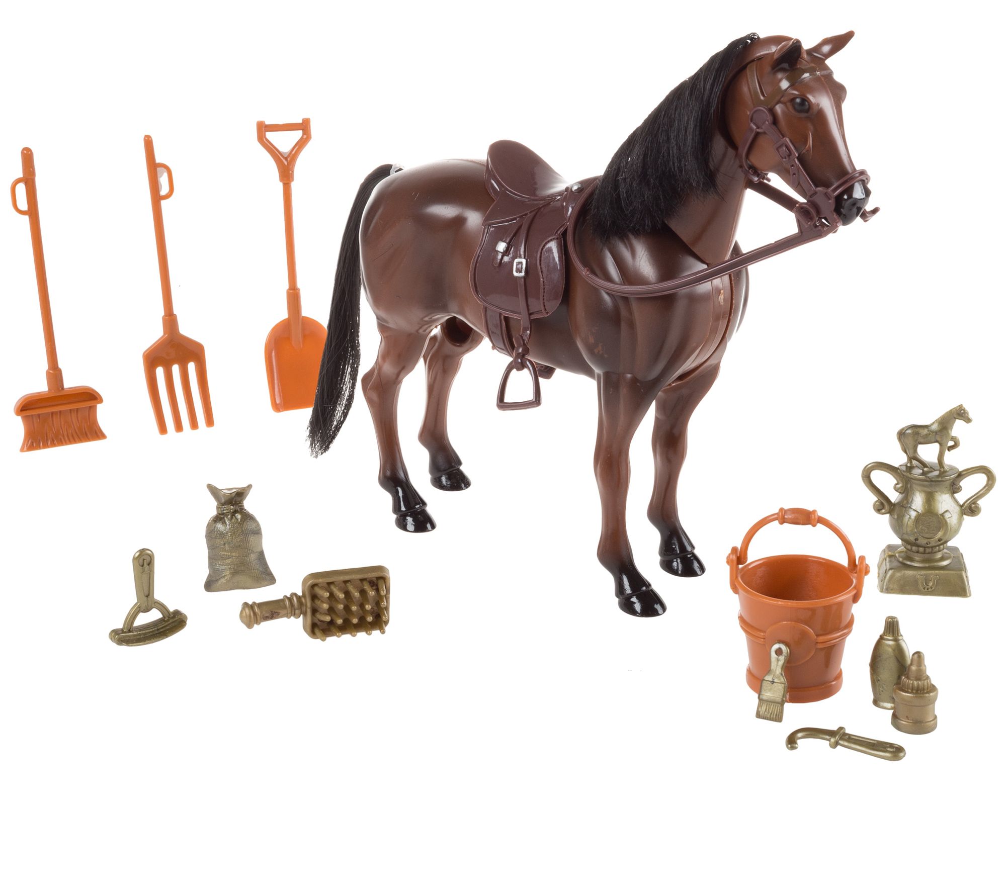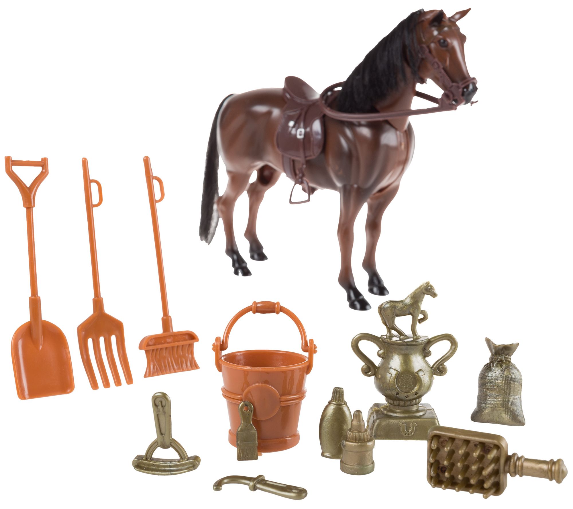• Includes toy bay-colored horse with moveable head/neck, and brushable mane/tail; removable saddle; brush; hoof pick; bucket pitchfork; shovel; and championship trophy