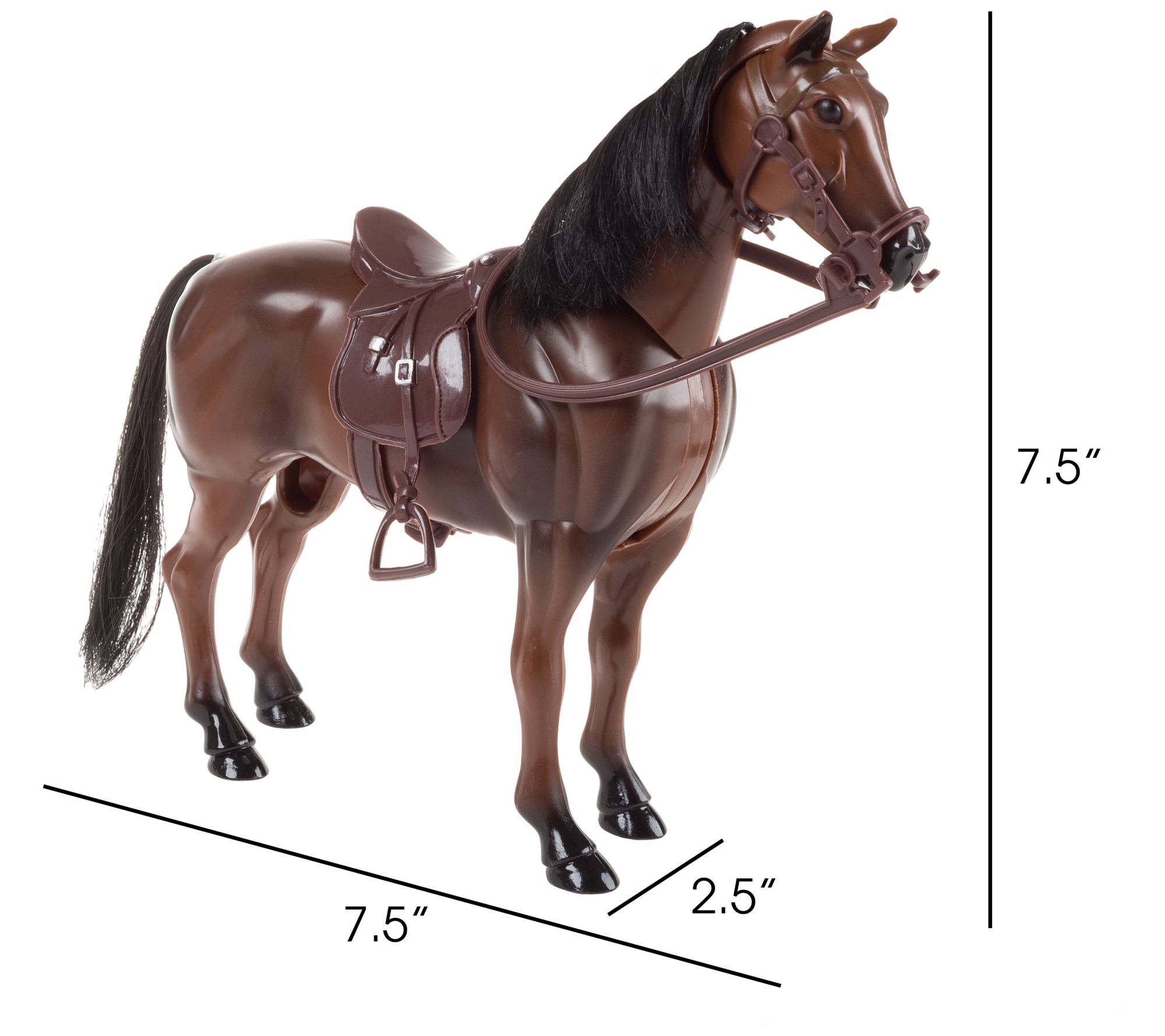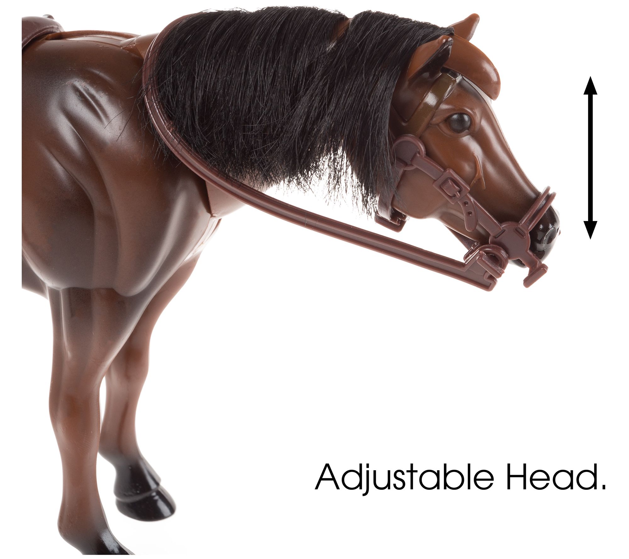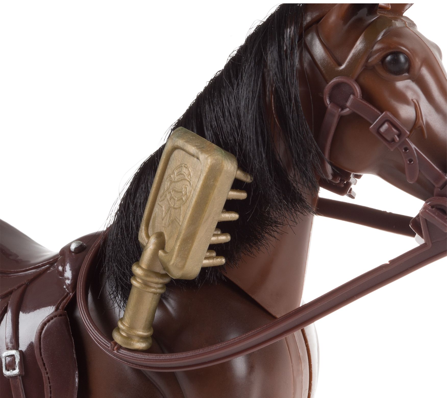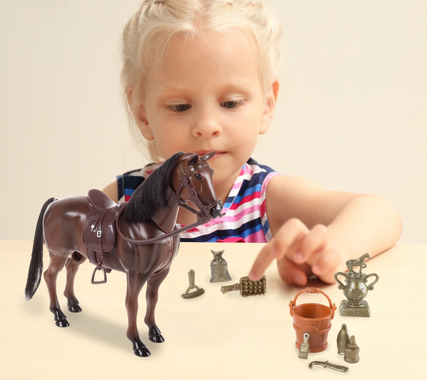 • Includes toy bay-colored horse with moveable head/neck, and brushable mane/tail; removable saddle; brush; hoof pick; bucket pitchfork; shovel; and championship trophy
