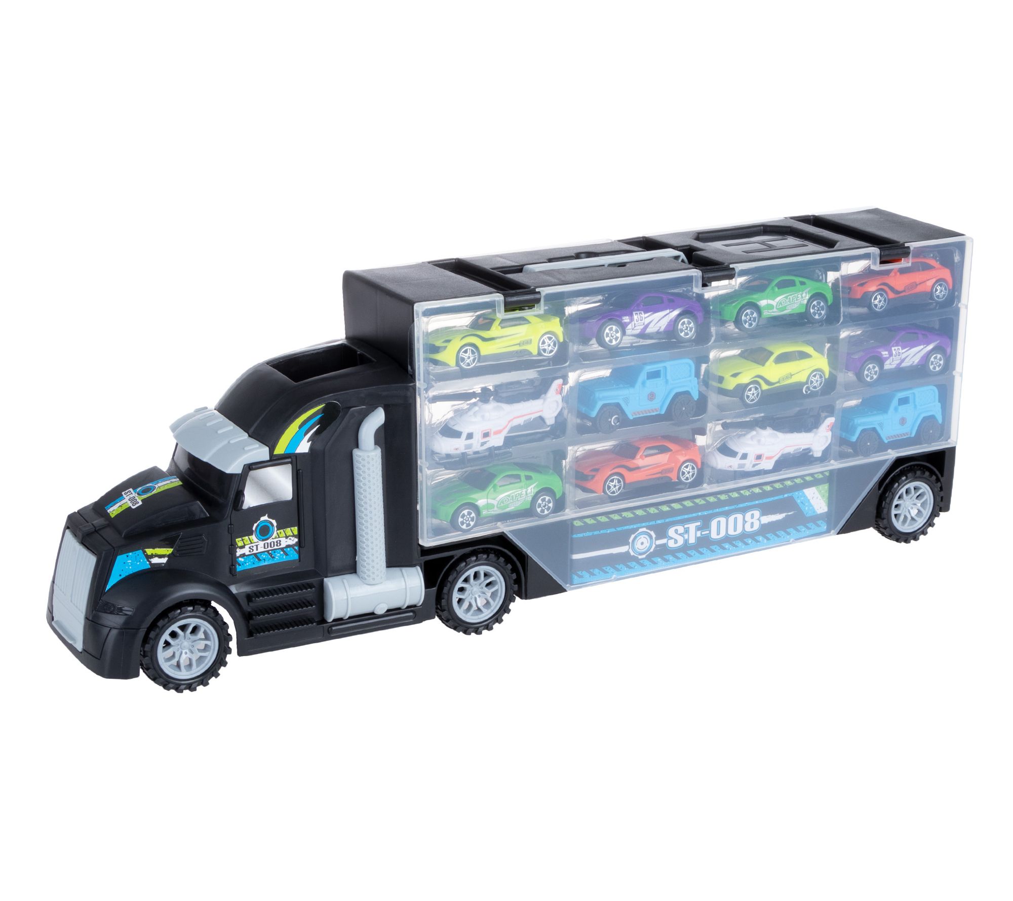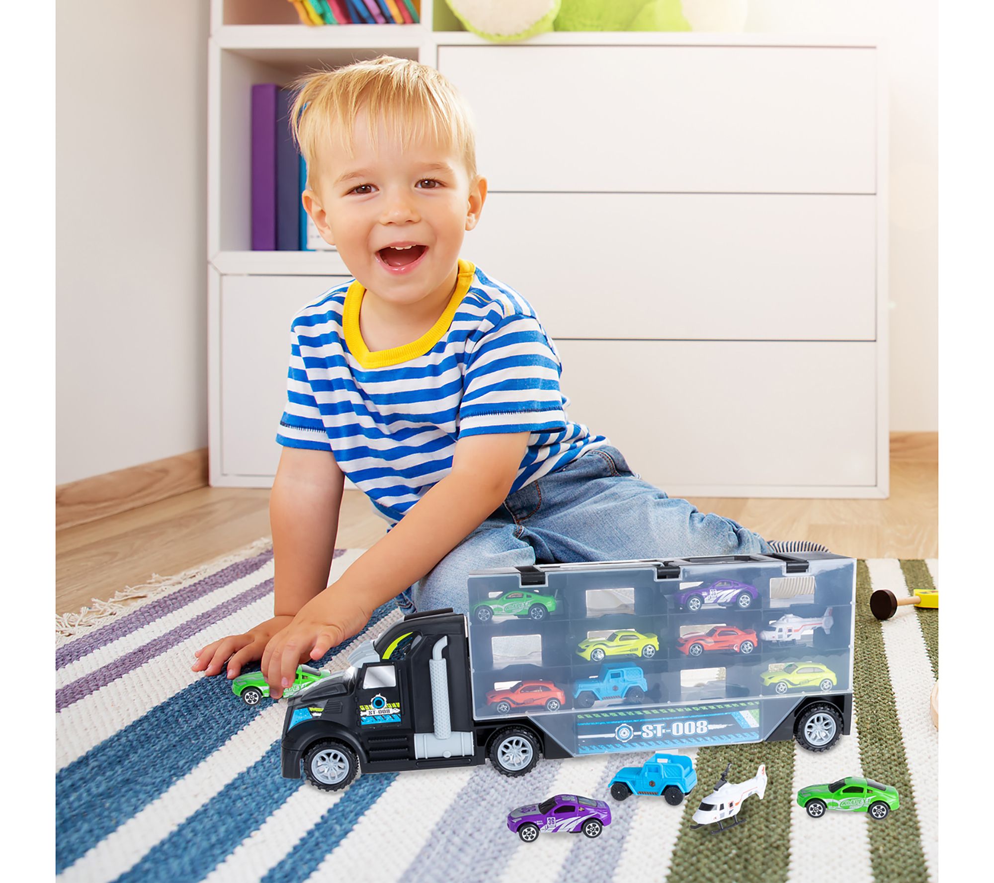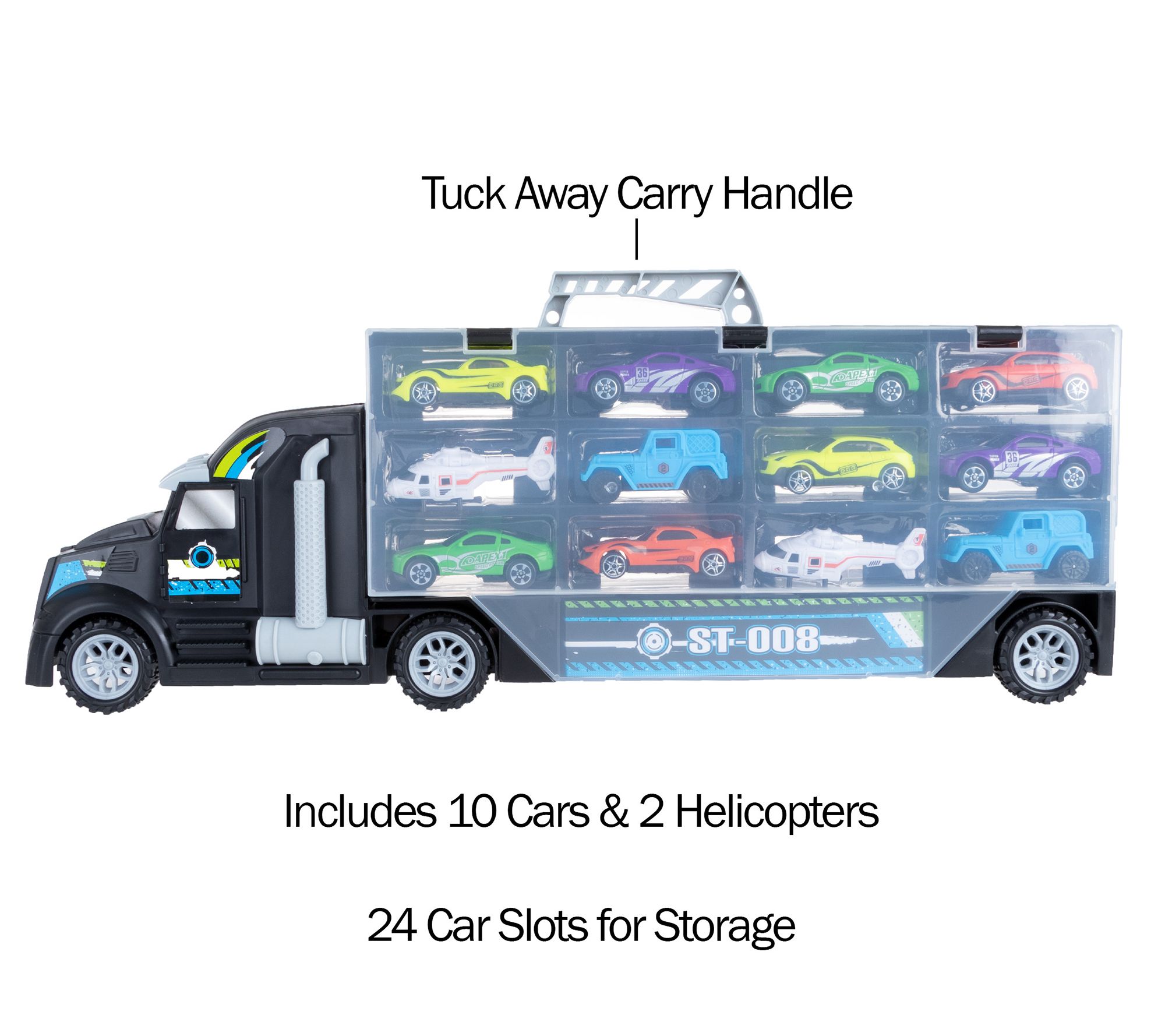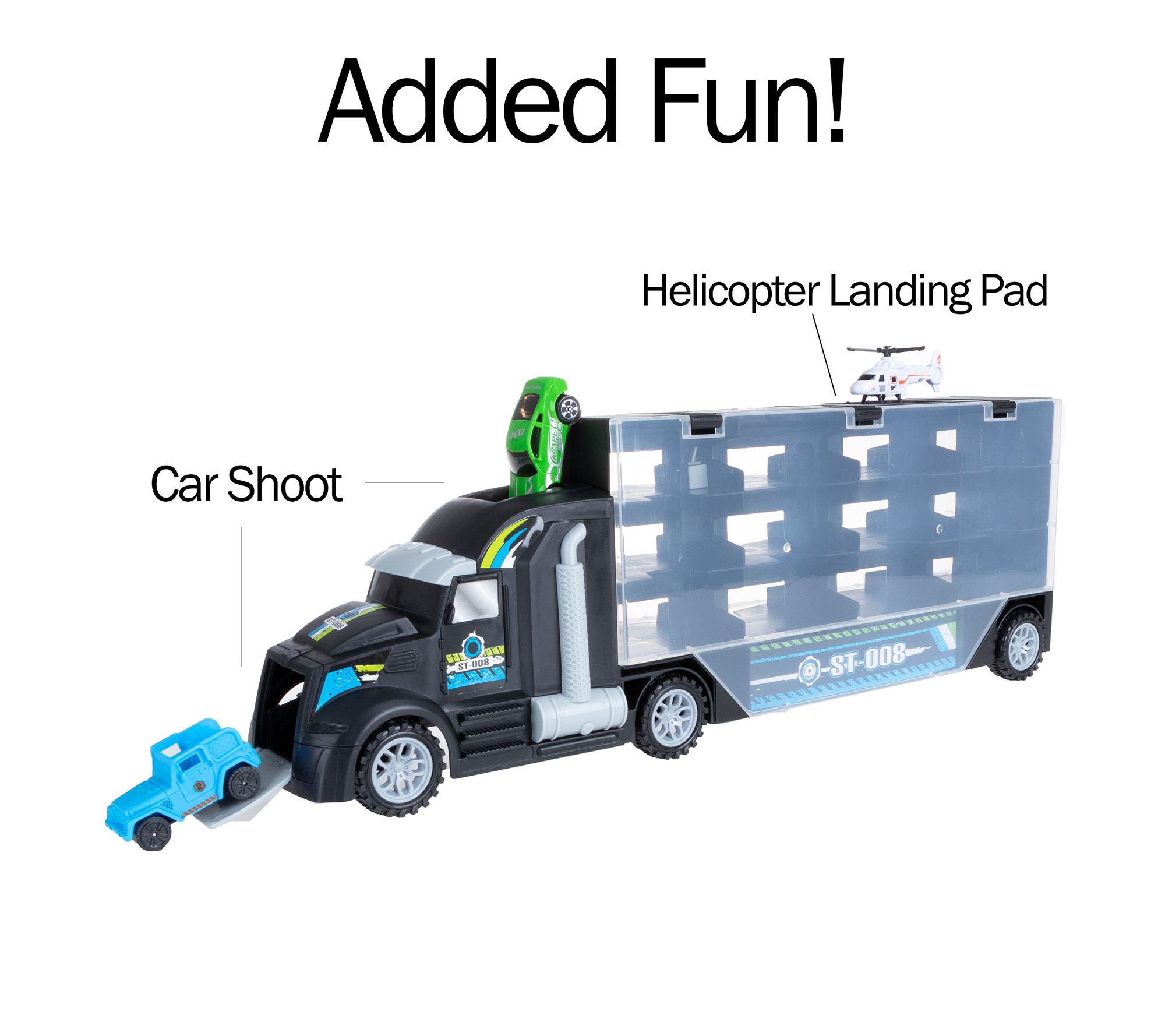 Provide your little one with hours of fun and imaginative play with the car carrier semi-truck toy by Hey Play. This toy easily holds up to 24 vehicles and includes 10 toy cars, two helicopters, a car shoot, and a helipad. With a built-in carry handle, it's easy for kids three years and older to transport this set to a playdate at a friend's house. From Hey! Play!