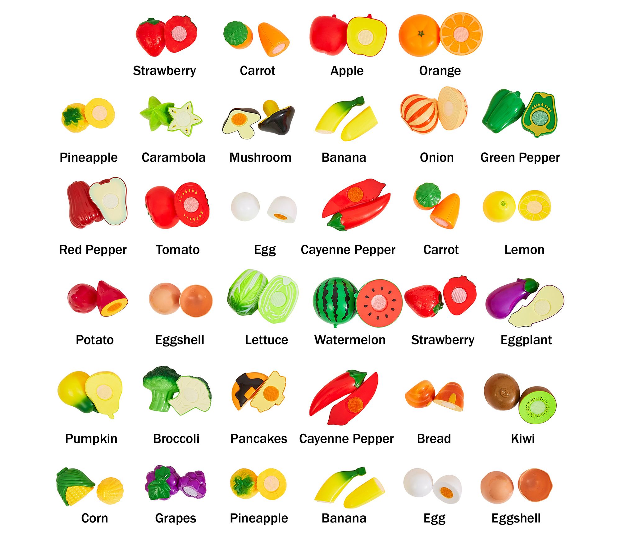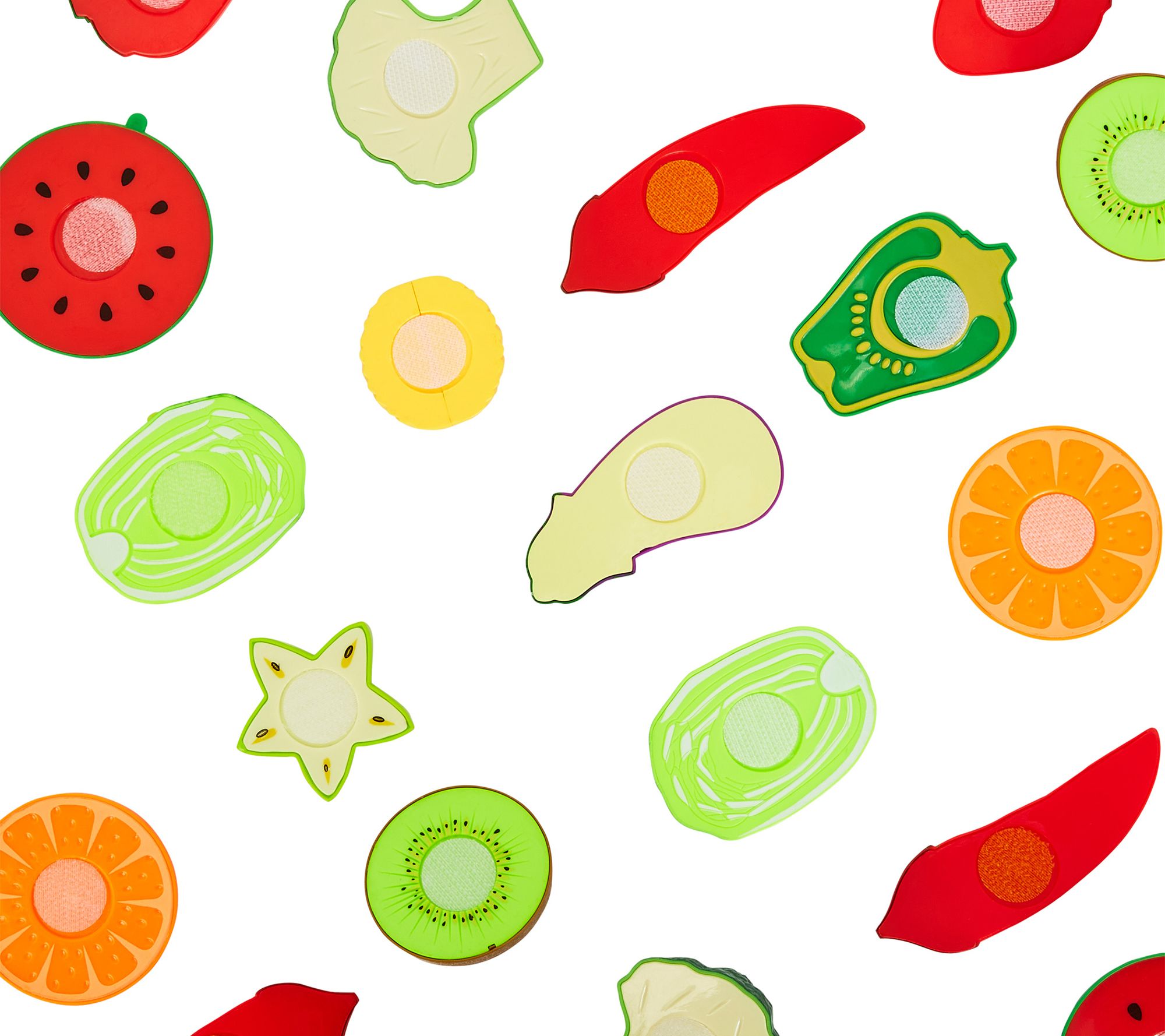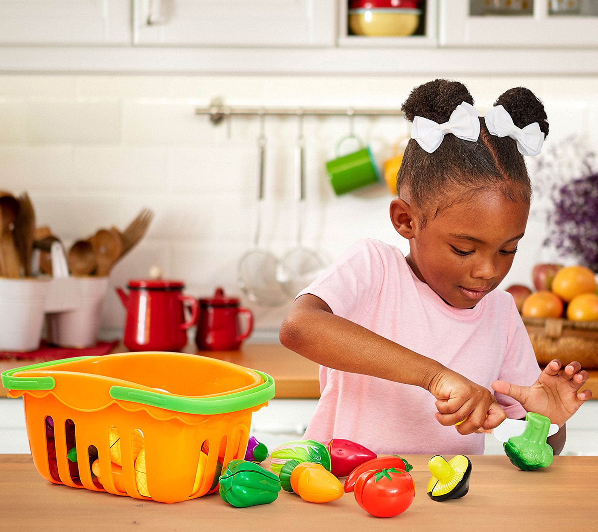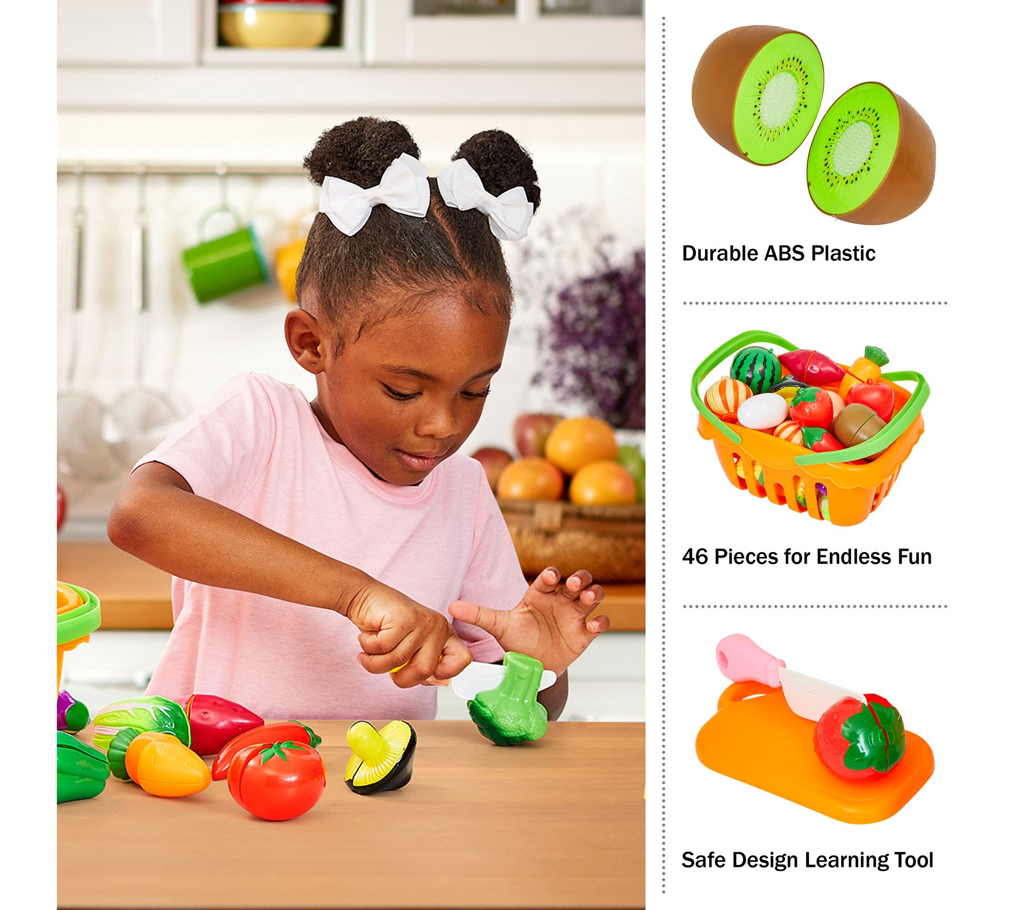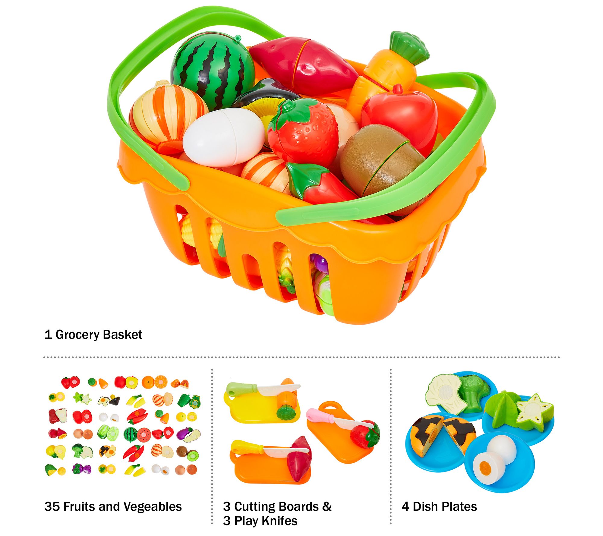 • Includes 35 play fruits and vegetables, 3 cutting boards, 3 knives, 4 dishes, and toy grocery basket