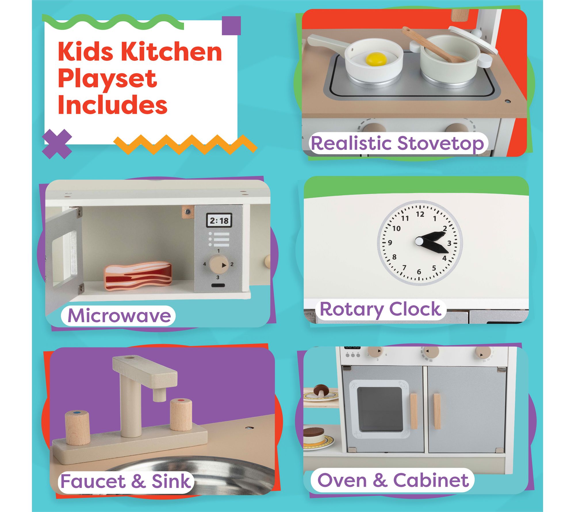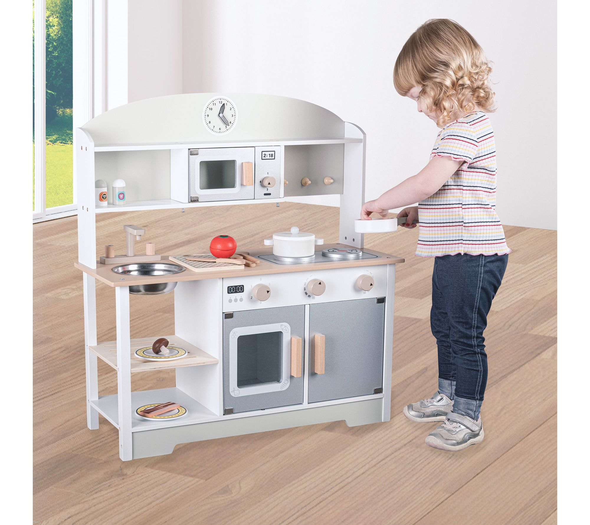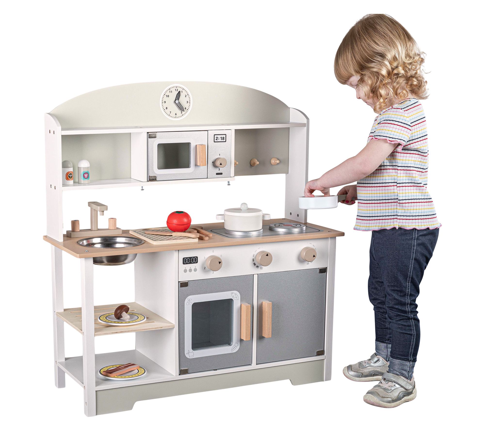 Make your child’s culinary dreams come true with the Hey! Play! wooden kitchen playset. This set includes all they need to play chef, featuring a pot with lid, pan, cutting board, utensils, dishes, and a variety of play food. Imaginative fun awaits with built-in appliances like a microwave, sink, stovetop, and more. From Hey! Play!