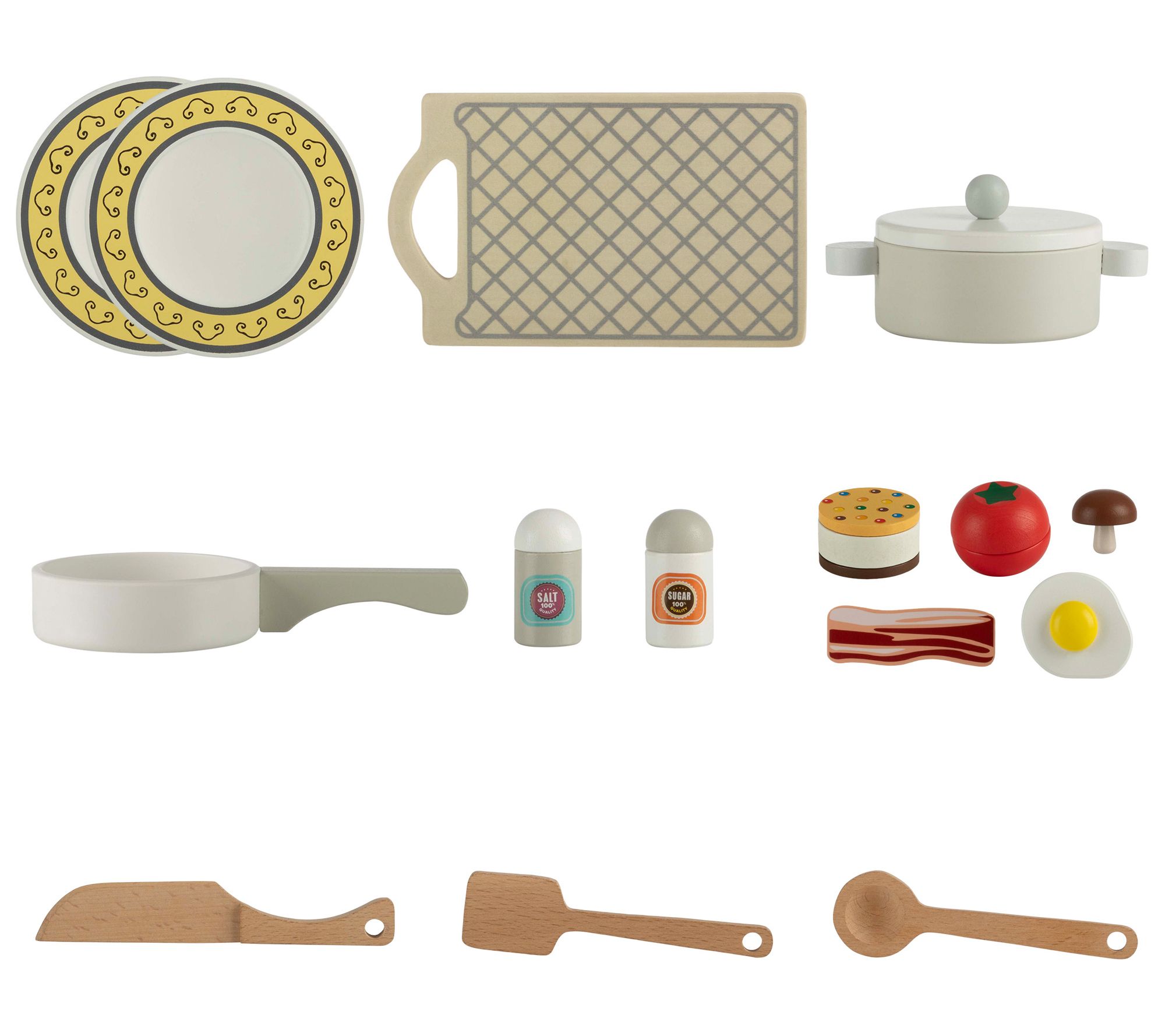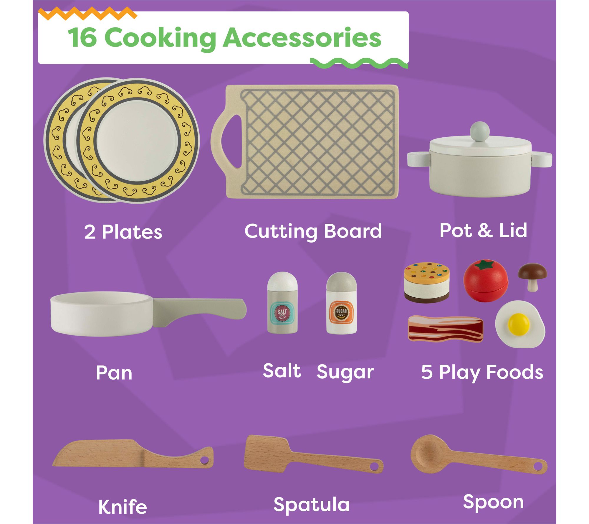 • Includes kitchen playset, pan, pot and lid, cutting board, 3 utensils, 2 dishes, salt, sugar, and a variety of play food