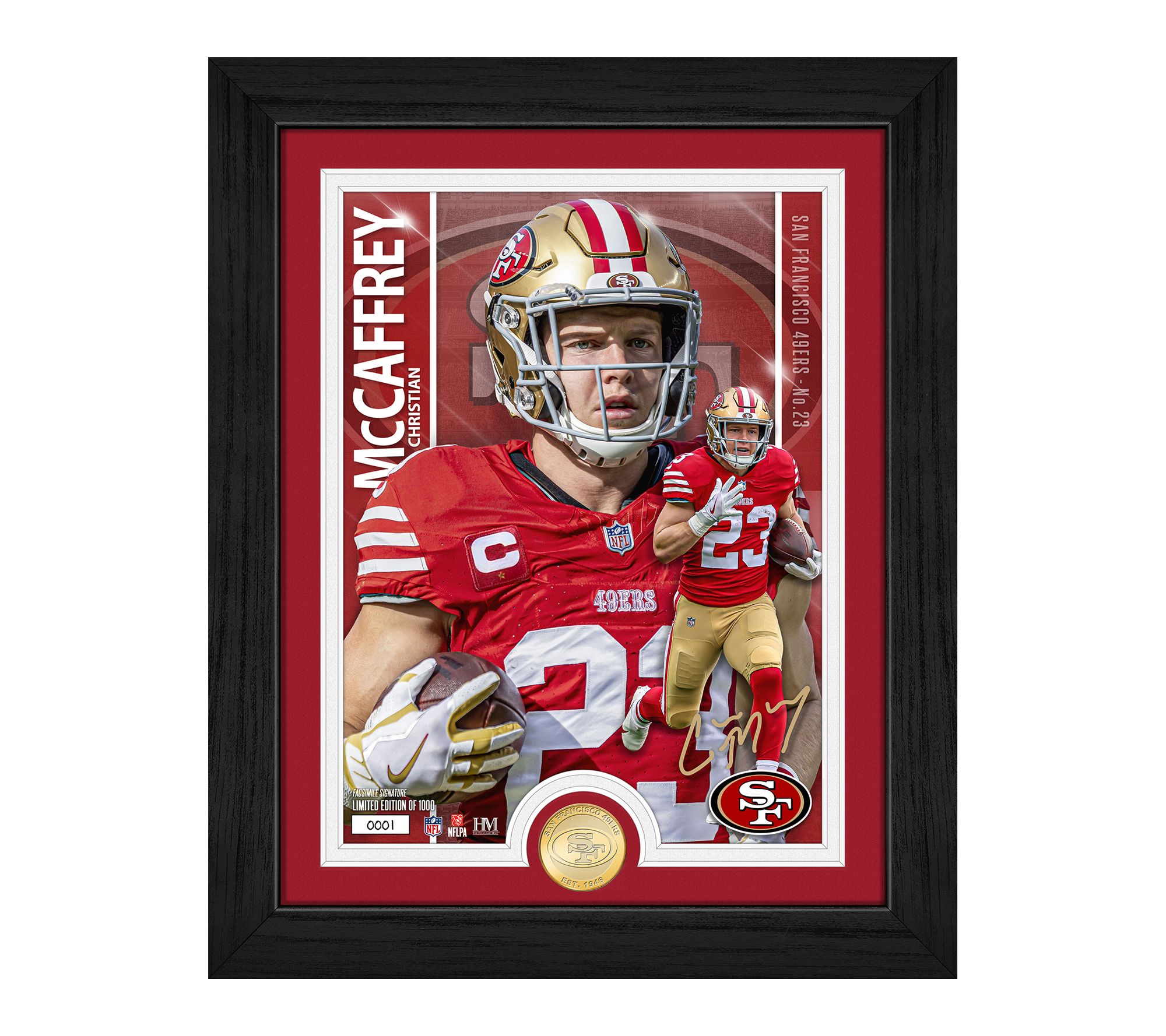 Honor your NFL fandom with this striking framed memorabilia, starring San Francisco 49ers' Christian McCaffrey. With a vibrant artist print and a gleaming bronze coin showcased under acrylic glass, this collectible adds undeniable spirit and sophistication to any space -- ready to hang and sure to awe fans and collectors alike. From Highland Mint.