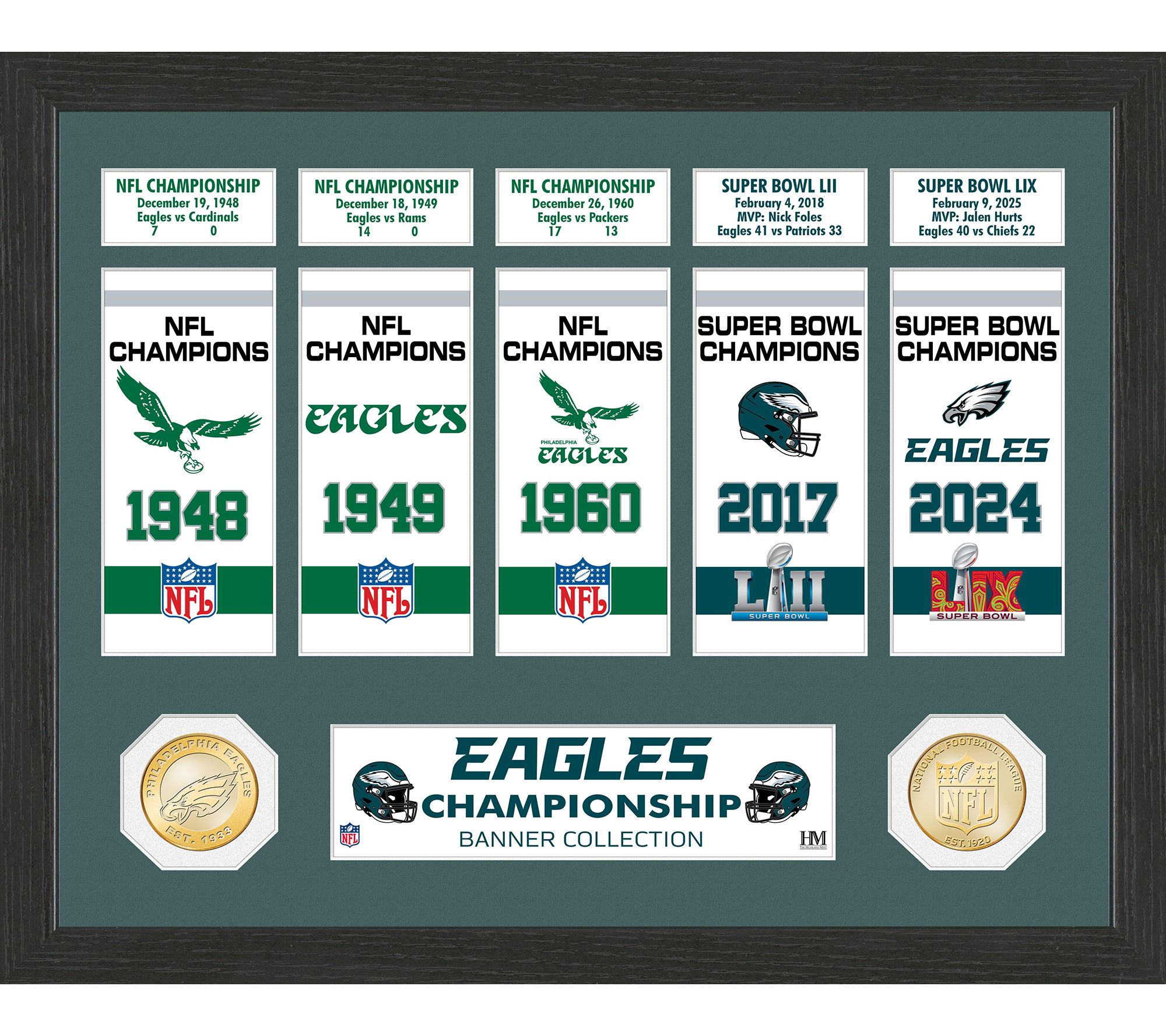Celebrate the Philadelphia Eagles’ unforgettable victories with this beautifully framed championship banner. This stunning 12" x 15" collectible showcases five commemorative banners, each marking the Eagles’ World Championships from 1948, 1949, 1960, and two Super Bowl wins. Nestled in double matting under acrylic glass, it also features two solid bronze coins and is officially licensed by the NFL. Perfect for any Eagles fan, the frame comes with a Certificate of Authenticity and is ready to hang. From The Highland Mint.