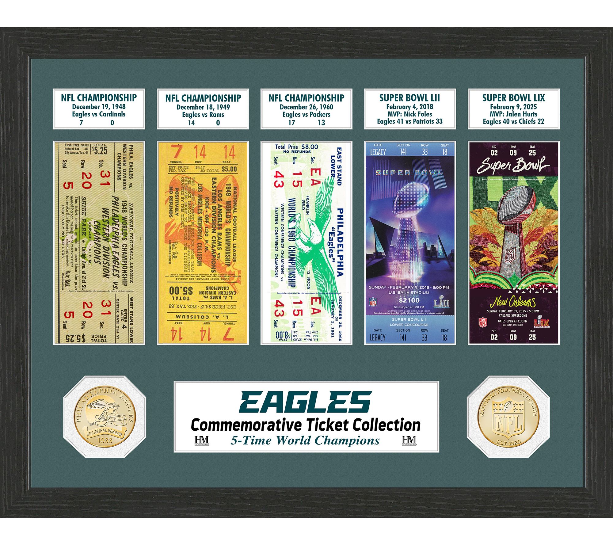 Show off your Philadelphia Eagles pride with this stunning collectible frame. Featuring replica tickets from five World Championship games and two solid bronze coins, it's the perfect way to celebrate the team's legacy. Officially licensed by the NFL, this beautifully matted piece comes with a Certificate of Authenticity and it's ready to hang in your home or office. It makes an incredible gift for any devoted Eagles fan. From The Highland Mint.
