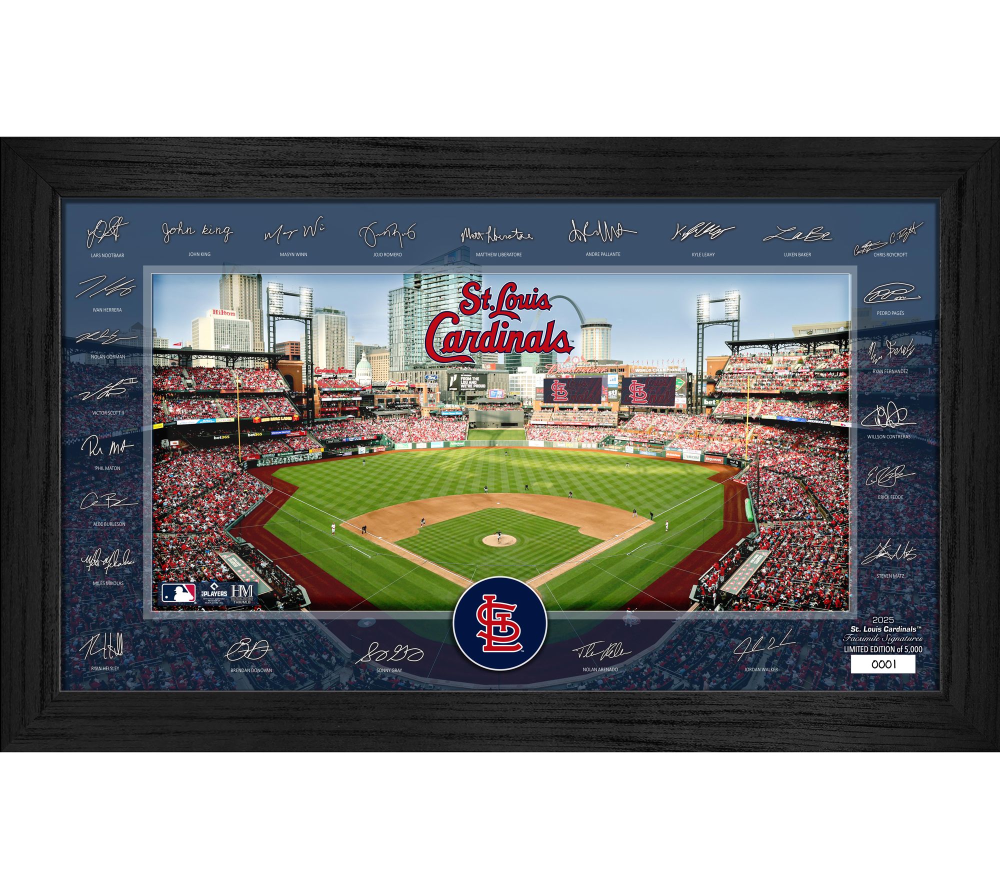 Celebrate your love of baseball with this Cardinals collectible memorabilia, designed to showcase facsimile signatures from the 2025 roster around a vibrant depiction of the team's home field. Individually numbered and framed for display, this special edition piece is ready to add history and excitement to your home or office. From Highland Mint.