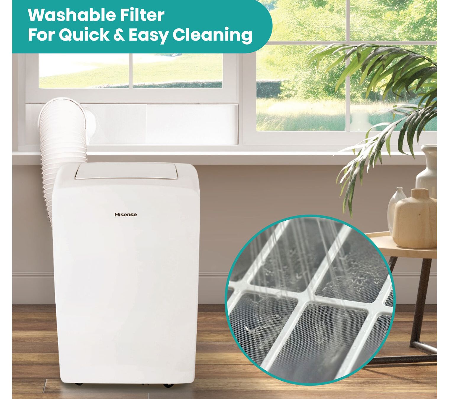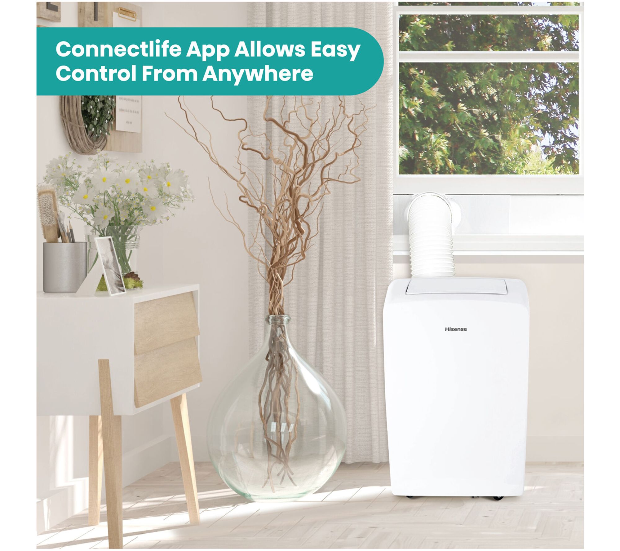 Cool comfort awaits when heat and humidity strike, and it's all at your fingertips. Set up this portable air conditioner in your home office or bedroom, then run errands or relax and adjust the settings with your phone. Three modes keep you comfortable no matter the forecast, and the simple installation means you'll enjoy a breezy atmosphere in minutes. From Hisense.