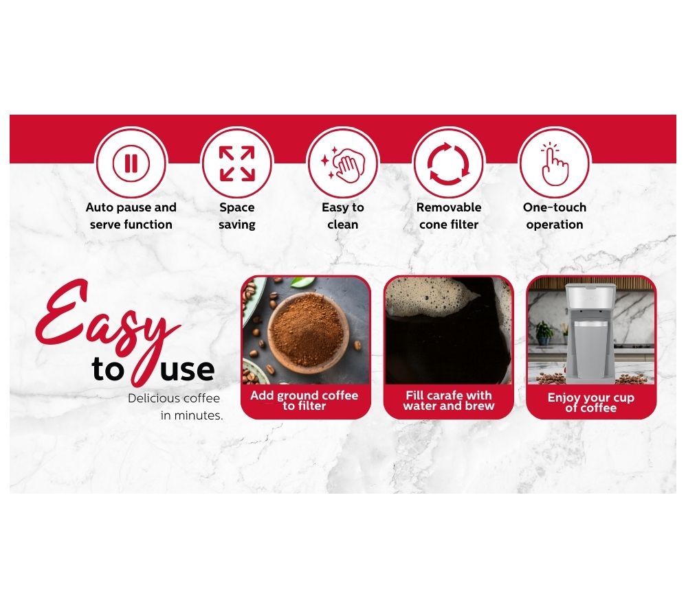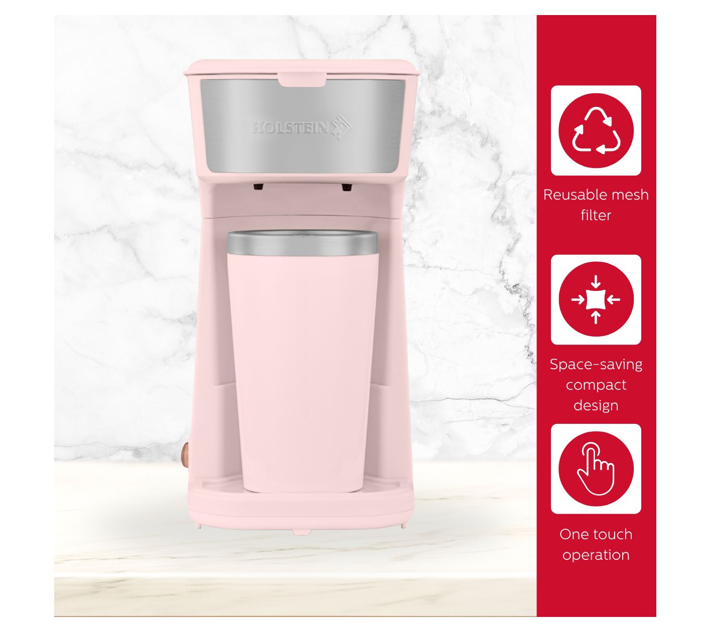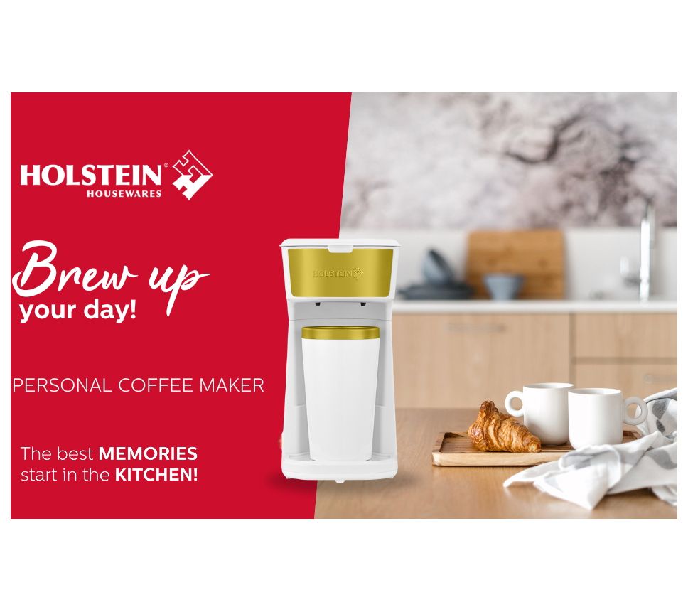 Kickstart your mornings with ease using the Holstein Housewares personal coffee maker. With a user-friendly one-touch operation, you can savor freshly brewed coffee in minutes. Conveniently grab the included travel mug and enjoy your cup of joe on-the-go. Its compact design saves space on your countertop and offers hassle-free storage. From Holstein Housewares.