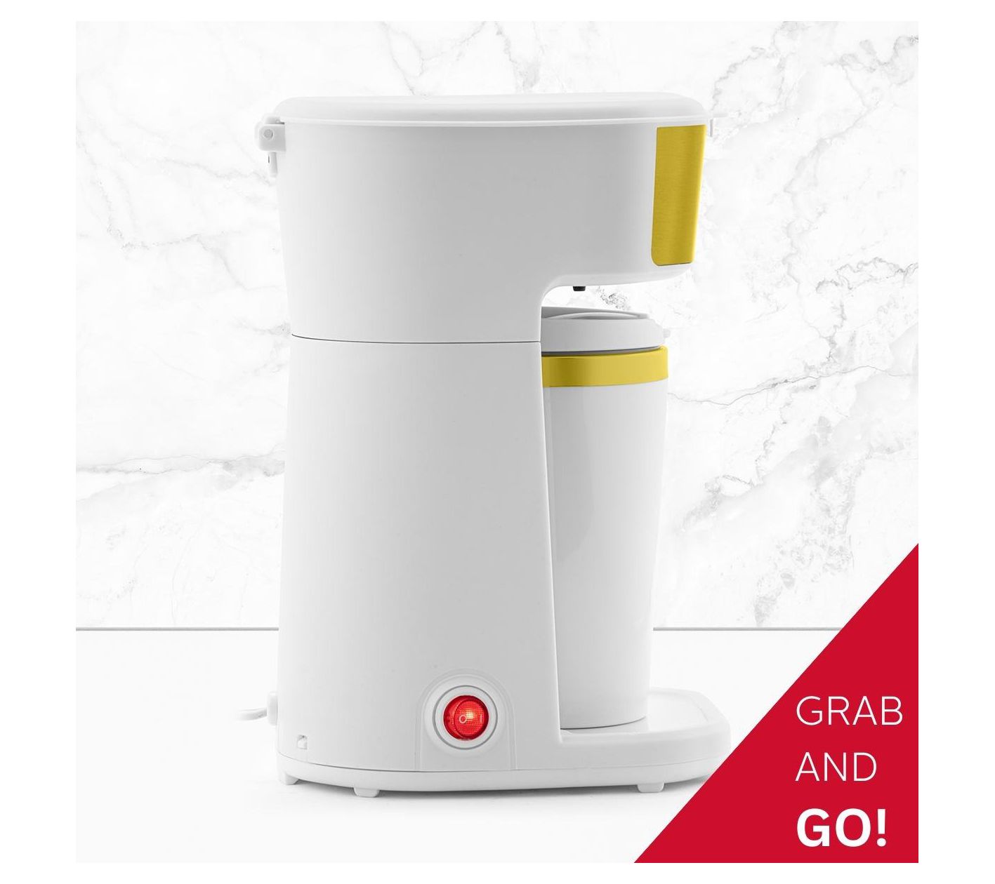 • Includes a personal coffee maker and 14-oz stainless steel and silicone travel mug