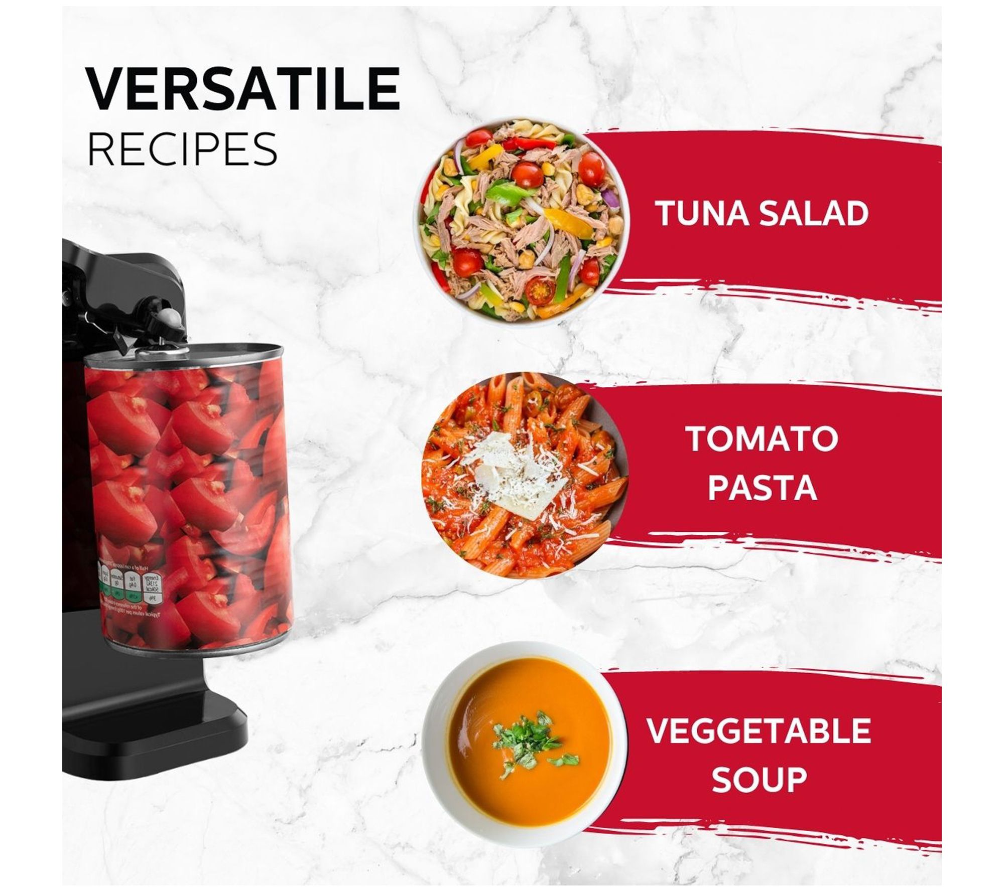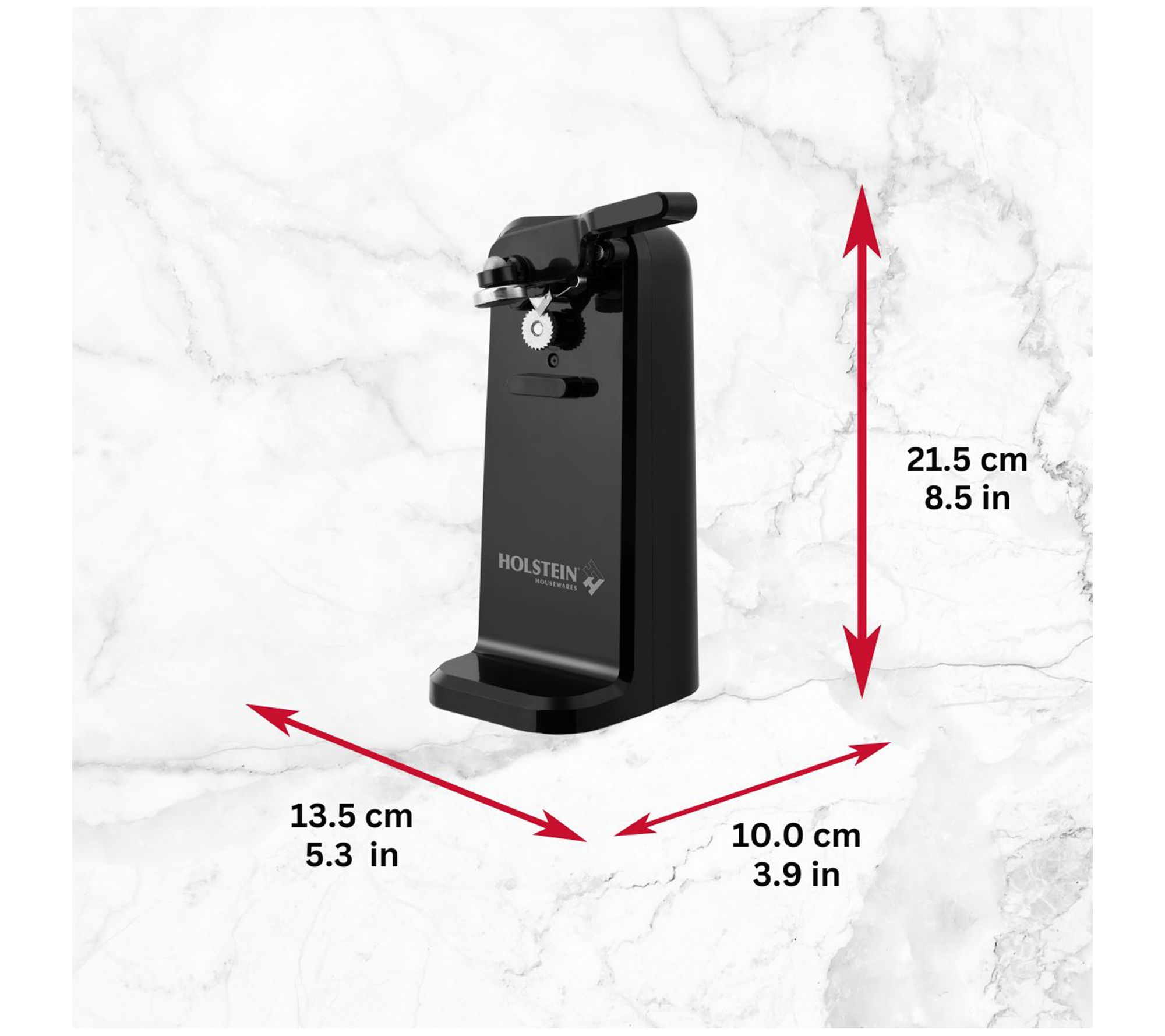 Experience the convenience of opening cans with ease using the Holstein Housewares Electric Can Opener. This innovative tool not only opens any round can within seconds but also ensures safety by eliminating most sharp and irregular edges. Its modern design incorporates a blade sharpener and a bottle opener, making it a versatile addition to your kitchen essentials. From Holstein Housewares.