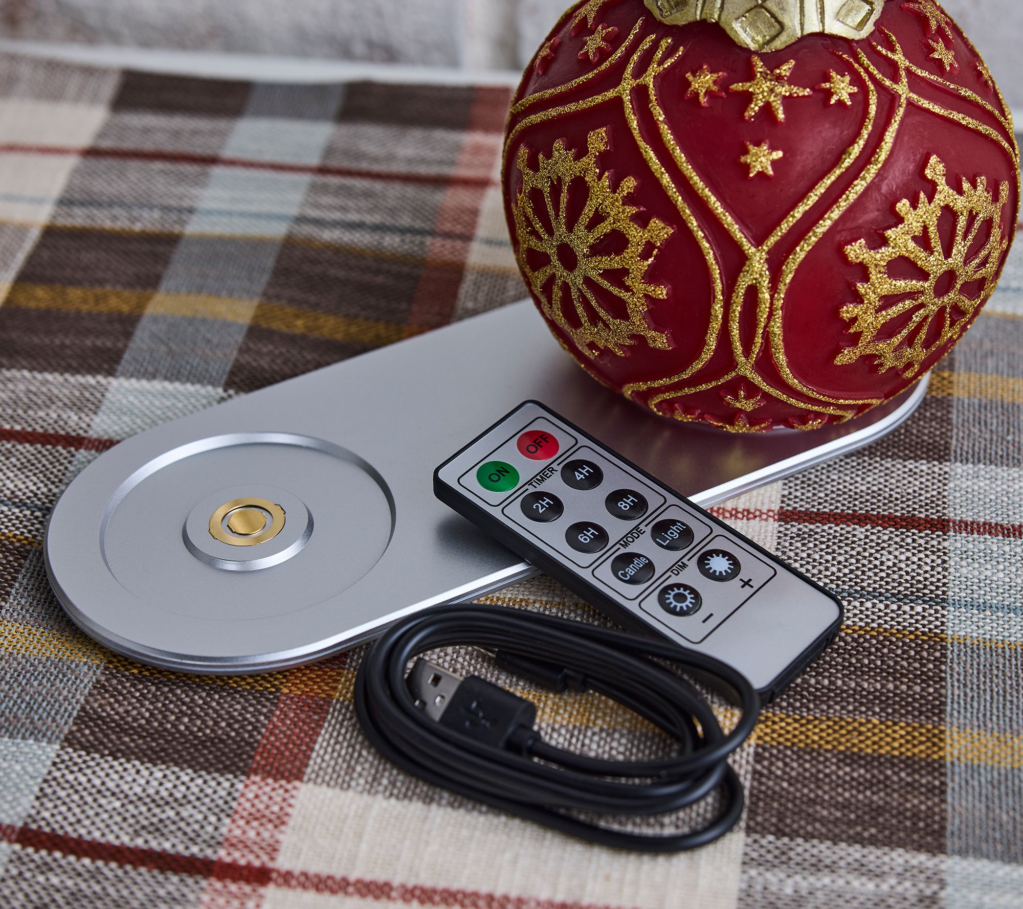 • Includes two flameless ornament candles, charging base, remote, and USB cable
