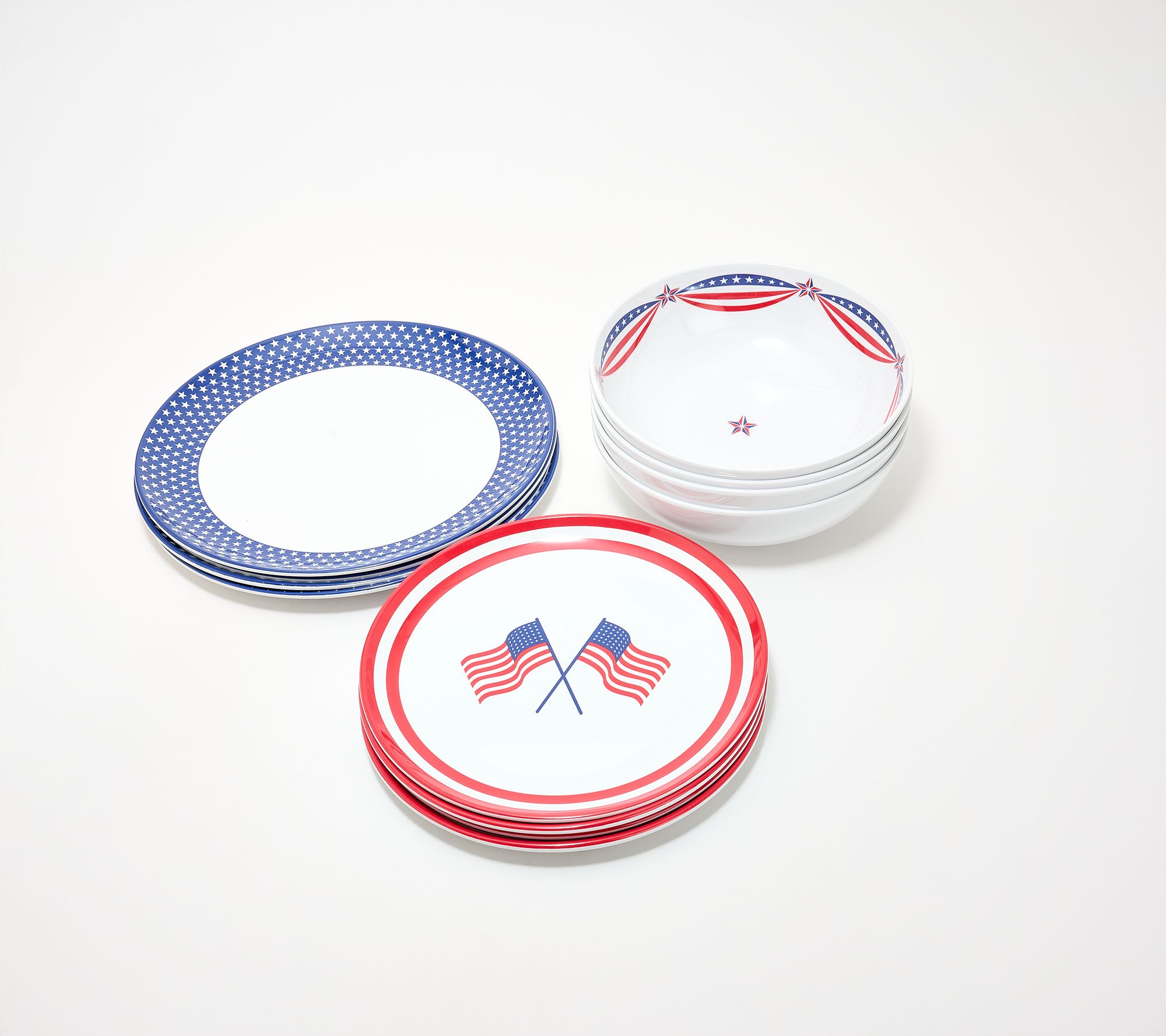 Love of country and a family feast? This 12-piece dinnerware set has you covered. Whether you're hosting your crew for a casual brunch, weeknight dinner, or backyard barbecue, BPA-free melamine with a patriotic motif matches the celebratory vibe -- especially around kids and pets! From Home Reflections®.