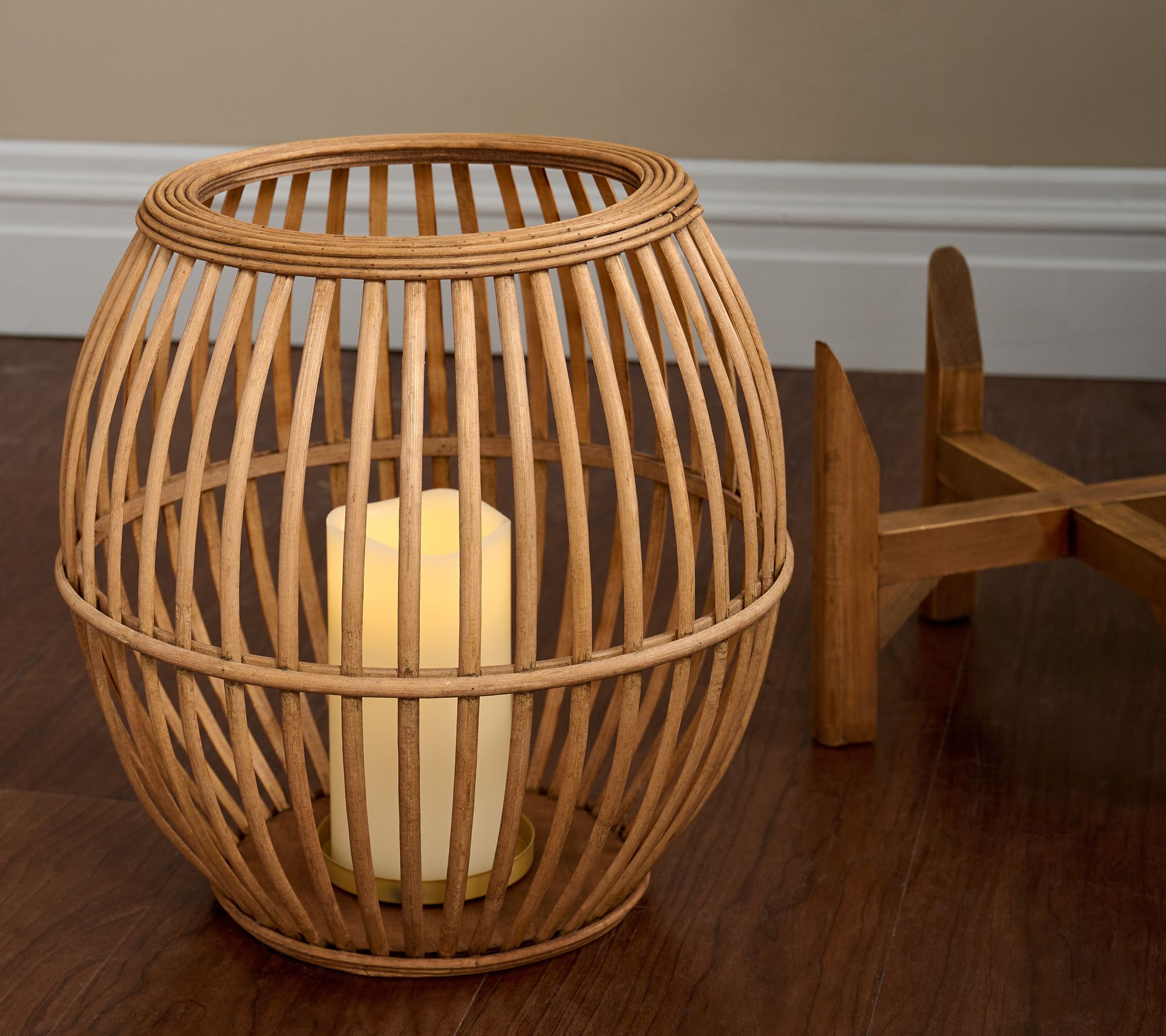 Brighten your nights with the enchanting glow of this bamboo lantern. Its warm, wood tones harmonize with any decor, offering a serene flameless experience -- and less worry around pets and kids! Perfect for cozy nights or gatherings with loved ones, it includes a convenient remote for easy operation, making it simple to set the mood anytime. From Home Reflections®.
