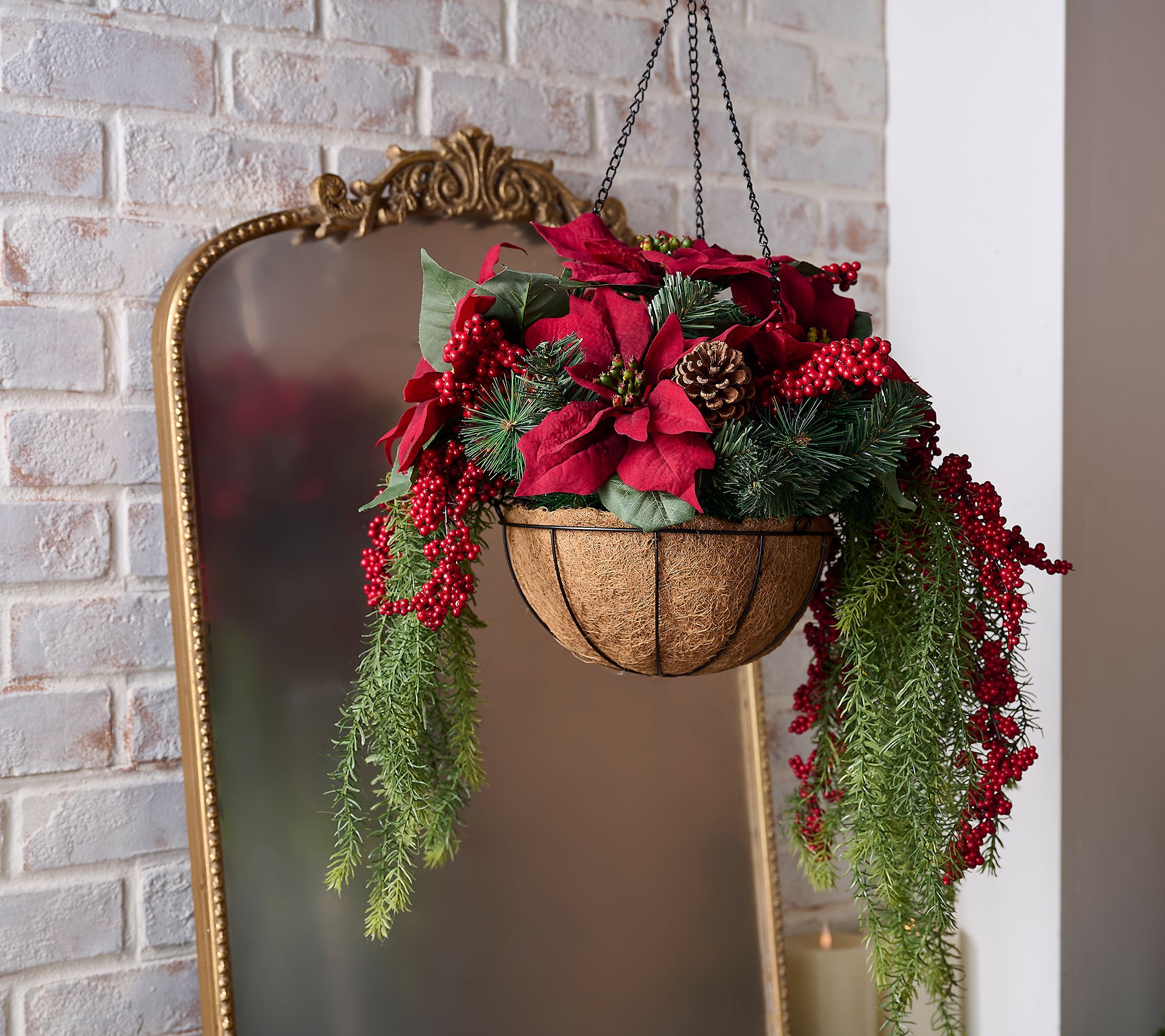 Add a touch of festive flair to your outdoor space with the Home Reflections 18" faux poinsettia hanging basket. Featuring vibrant faux poinsettia flowers, pine branches, and red berries, this hanging basket brings holiday cheer to any setting. The black metal wire basket and coco liner ensure durability and charm. From Home Reflections.