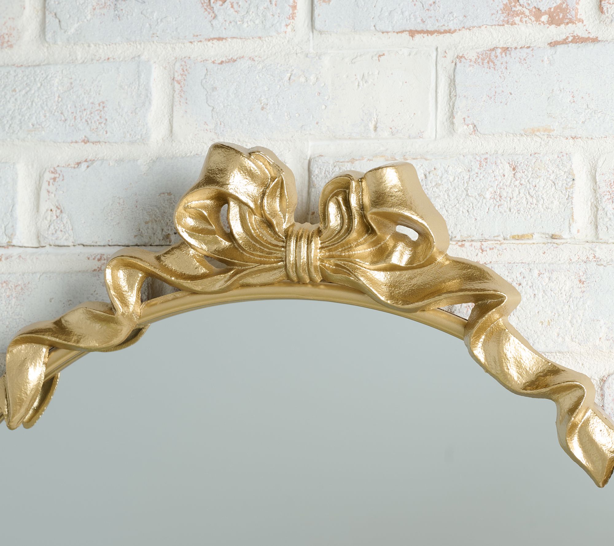 A charming accent for entryways or bedrooms, this metal bow-top mirror adds a dash of whimsy and elegance to your space. Its gleaming frame and playful bow detail instantly brighten walls, making it easy to check your look before you head out or reflect more light throughout the room. From Home Reflections®.