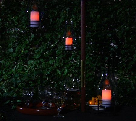 Includes lantern with flameless LED candle, hanging chain, stake, and table clamp