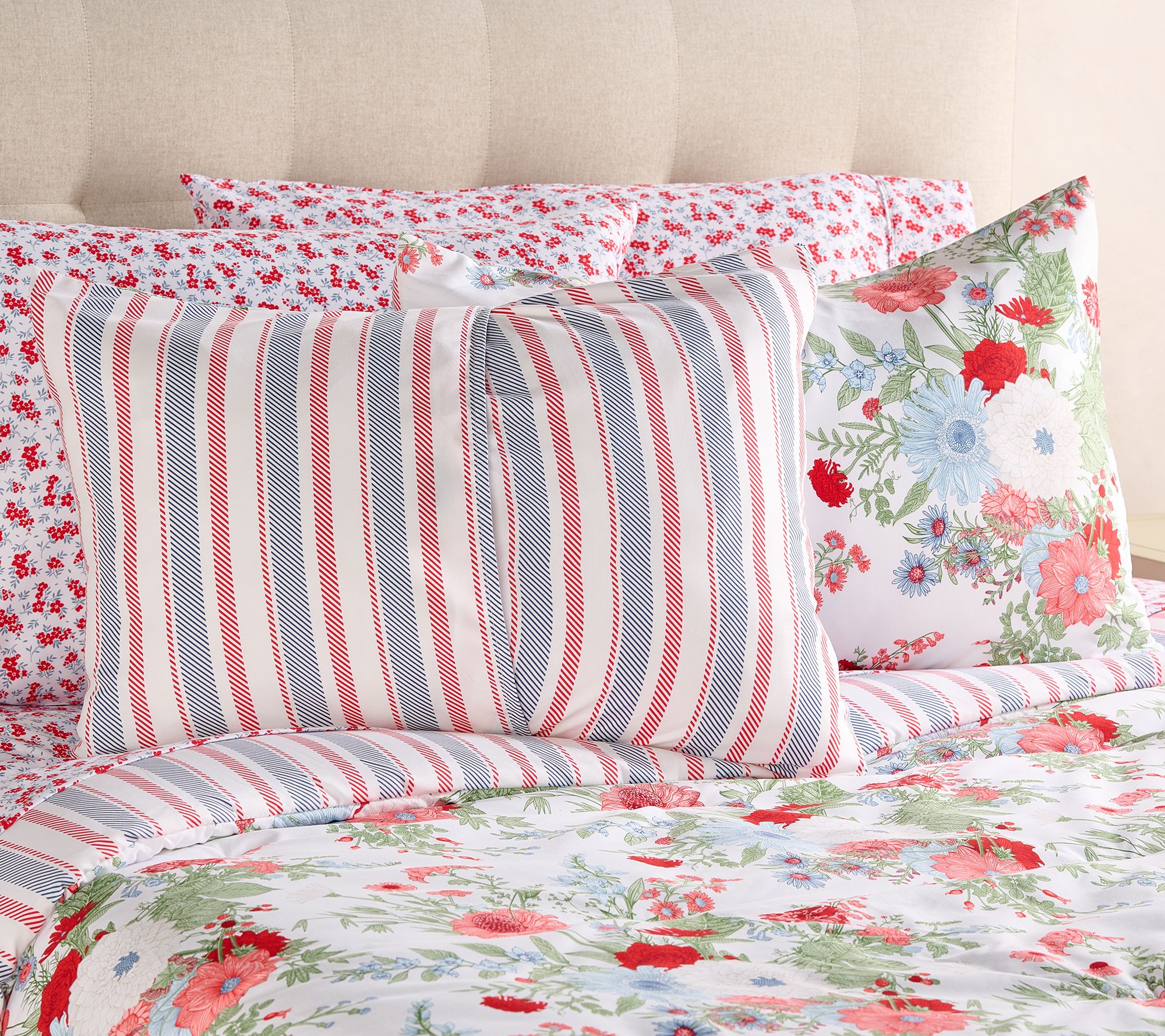 Set the stage for a patchwork of color and print with this Americana-inspired bedding set -- an ensemble designed to bring cozy charm and patriotic hues to your sleep space. Whether it's a cozy night in or a festive holiday weekend, enjoy the inviting feel of its soft embrace and striking pattern year-round. From Home Reflections®.