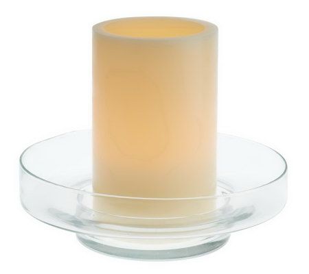 Includes glass dish and ivory-colored flameless candle