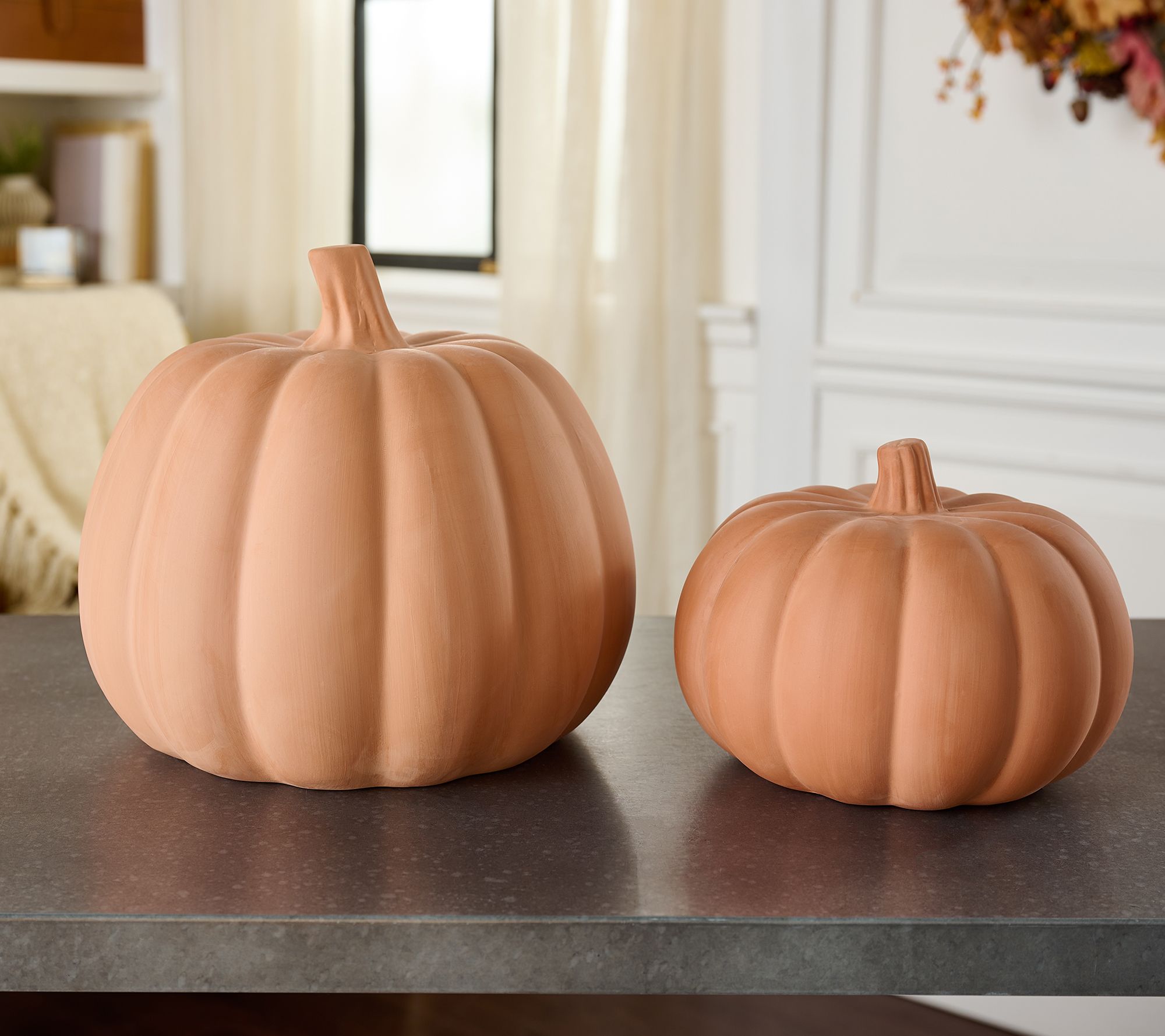 Approximate measurements: Large pumpkin 9"H x 10-1/2"Diam; Medium approximately 6"H x 8" Diam